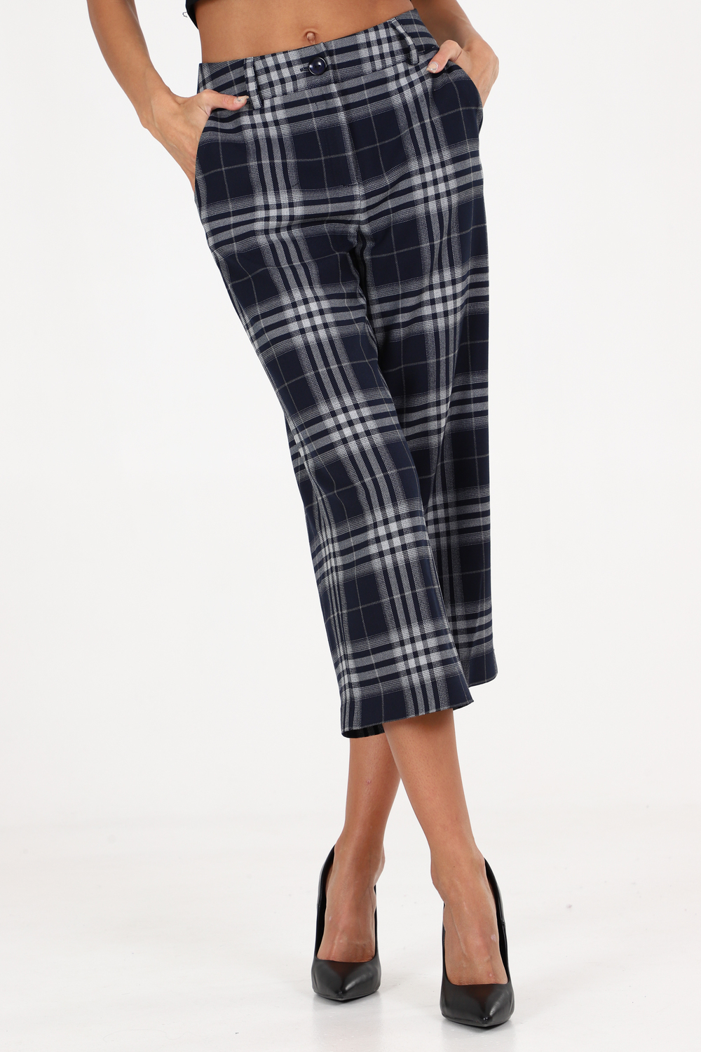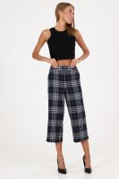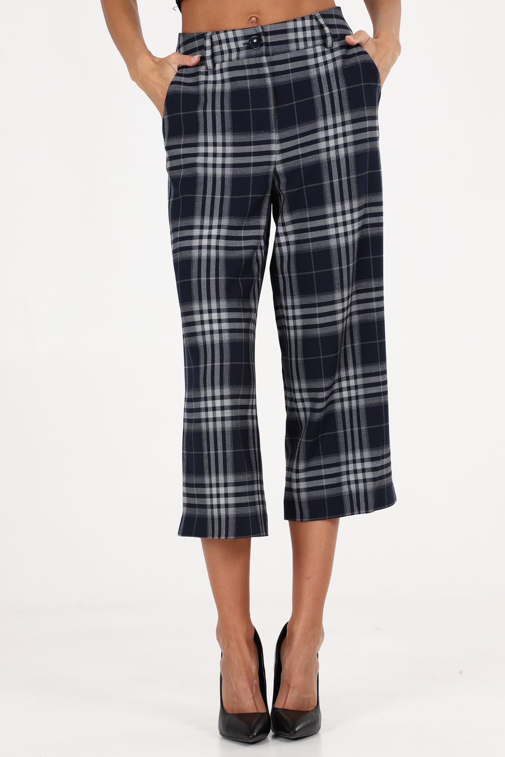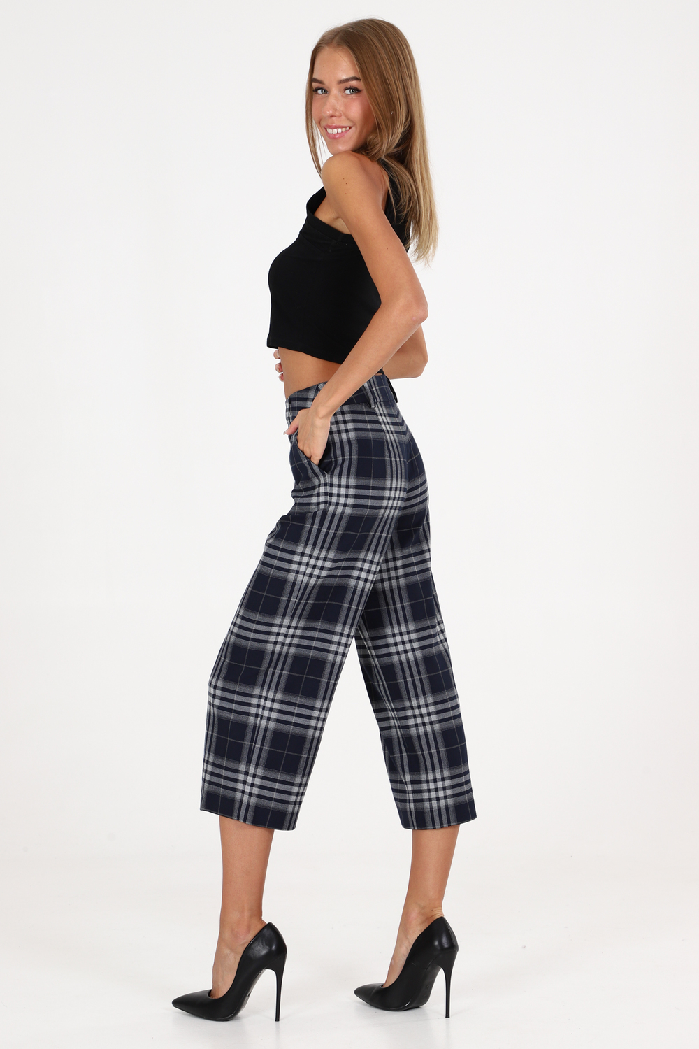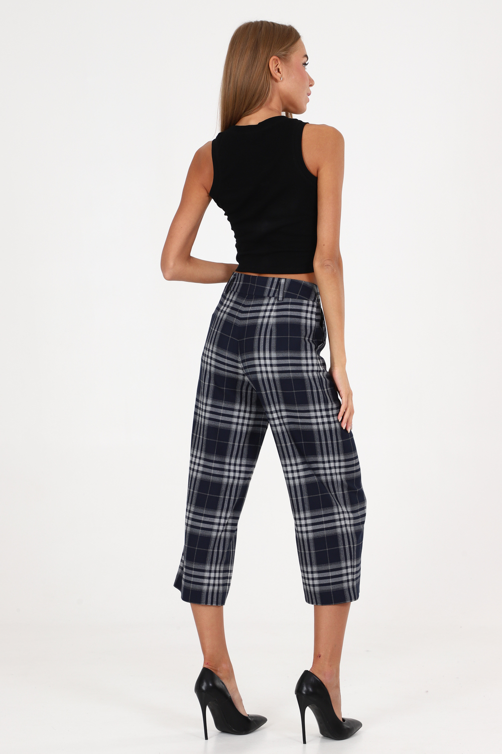 Укороченные брюки с боковыми карманами. Широкий пояс застегивается на пуговицу.