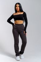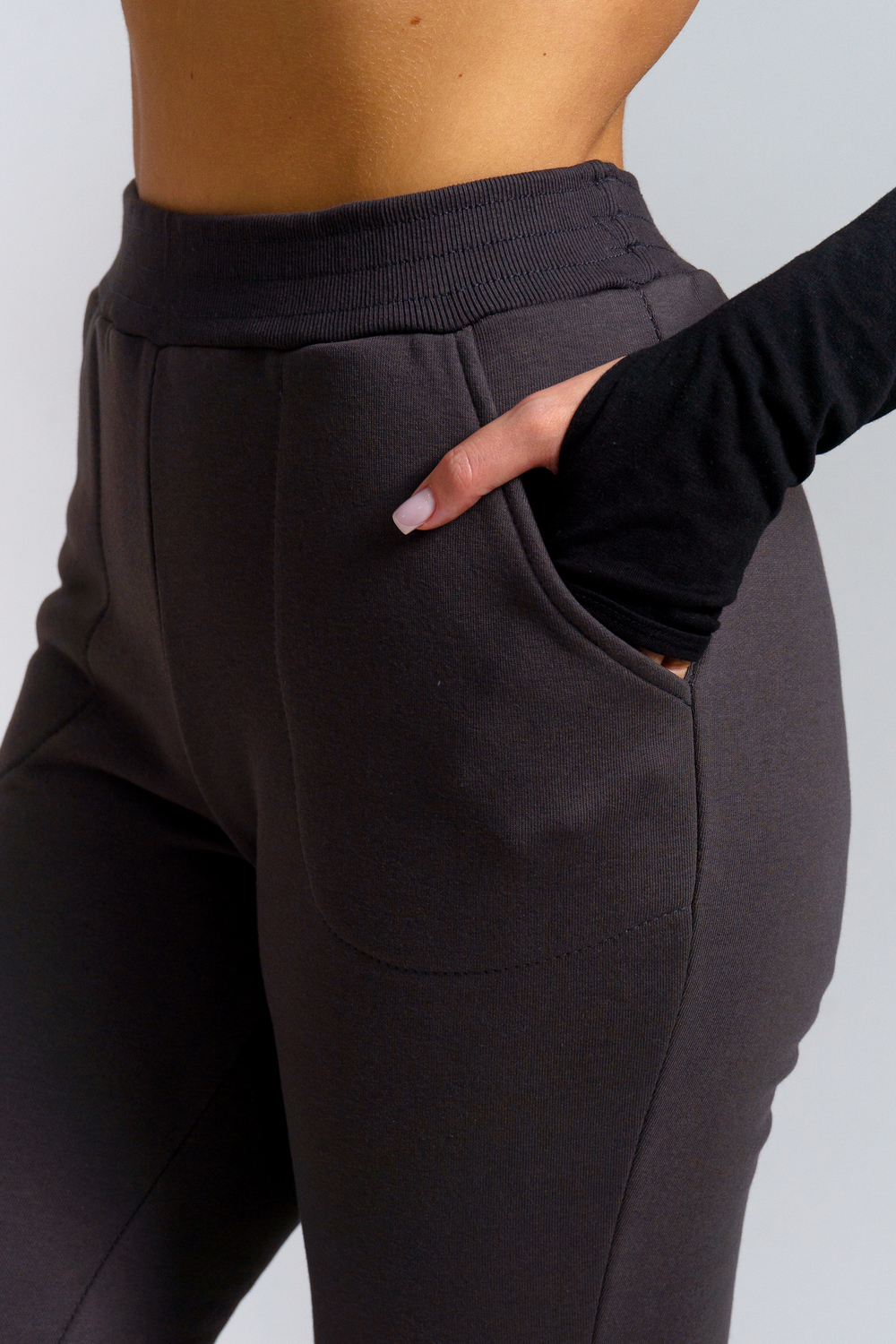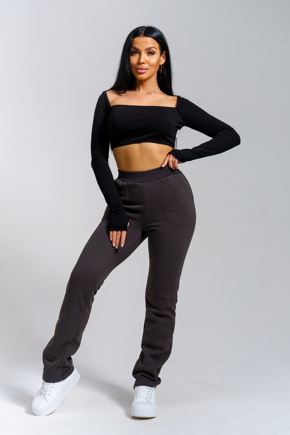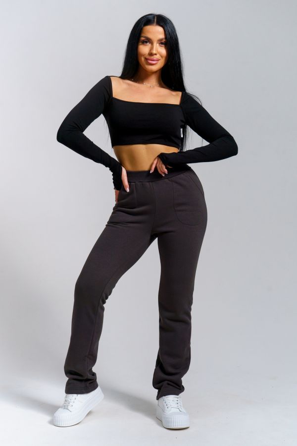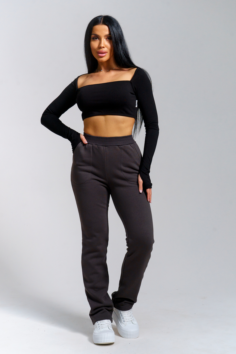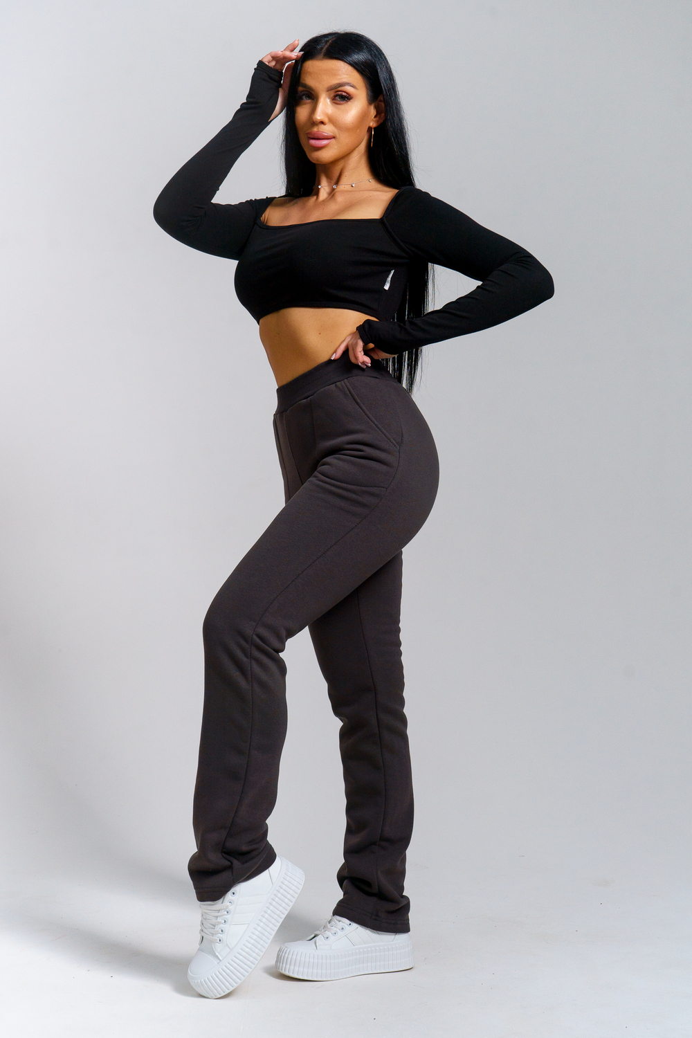Брюки женские прямого силуэта с карманами из футерного полотна с начесом. Пояс из кашкорсе в цвет основной ткани отстрочен вместе с резинкой.