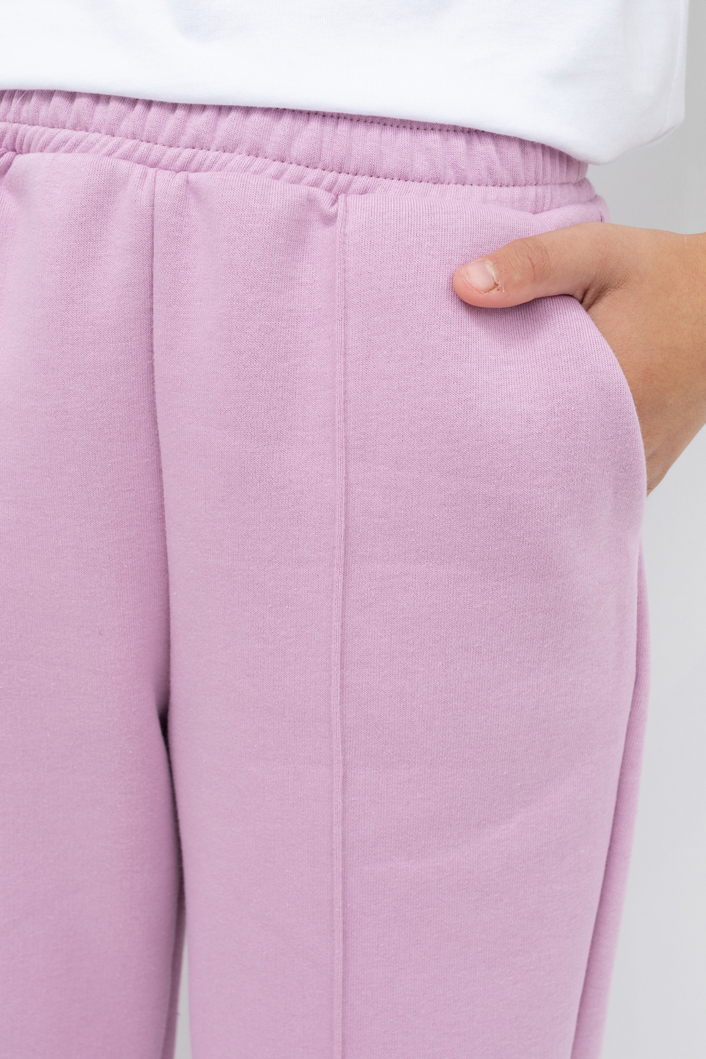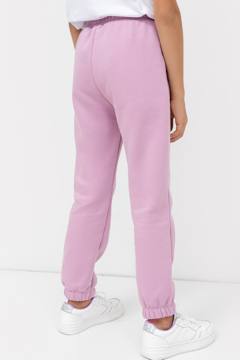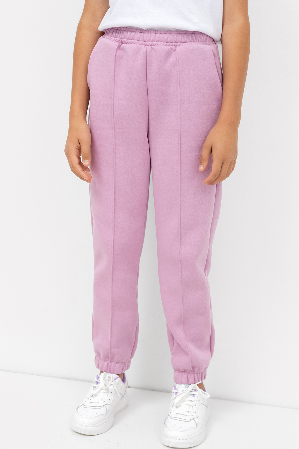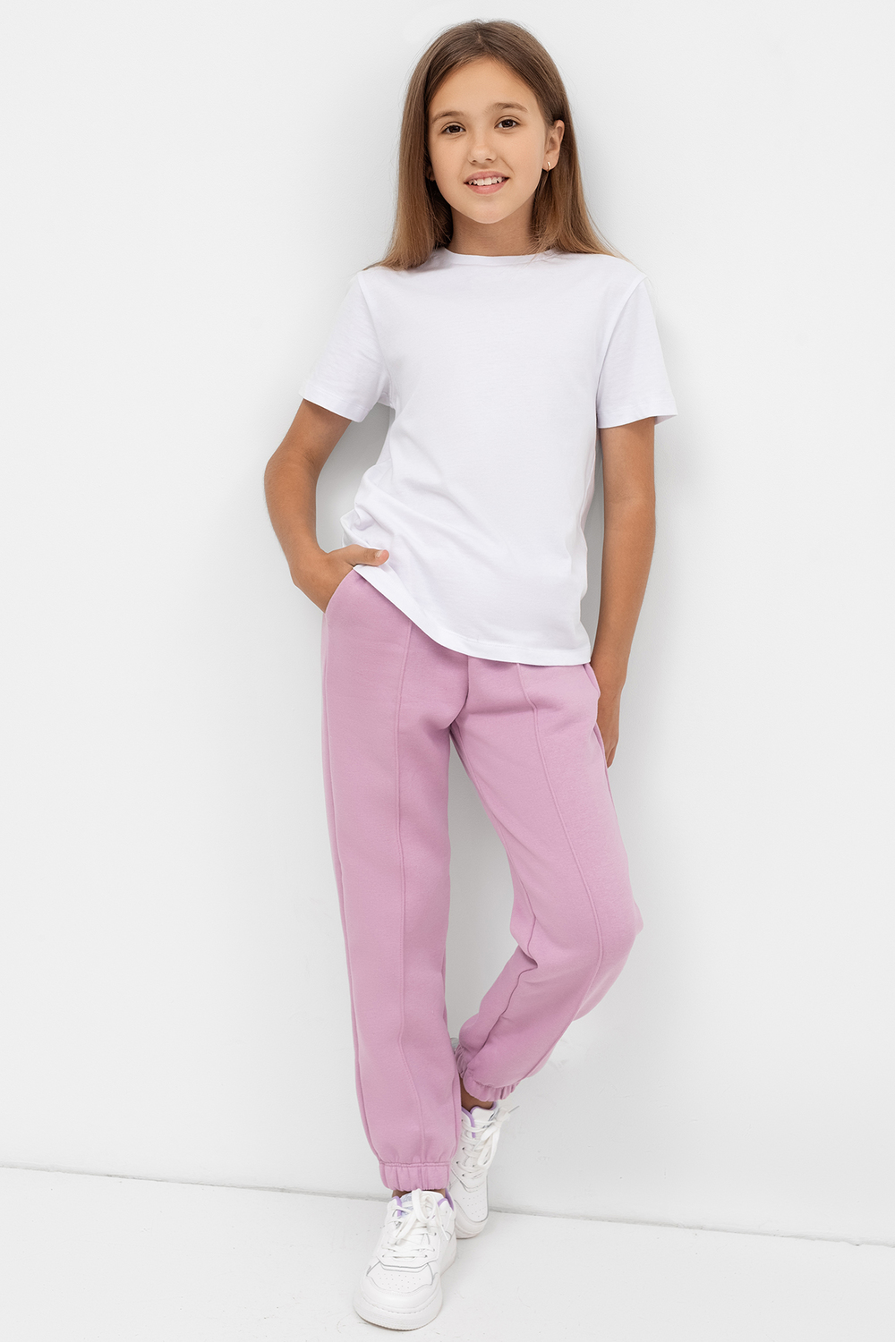 Комфортные брюки-джоггеры из трикотажного футера с подчесом для девочек. Силуэт свободный, на передних половинках обработаны карманы с наклонным входом. Пояс с эластичной тесьмой внутри. Низ штанин – с эластичной тесьмой, отвернут. Отличная модель для девочки!
