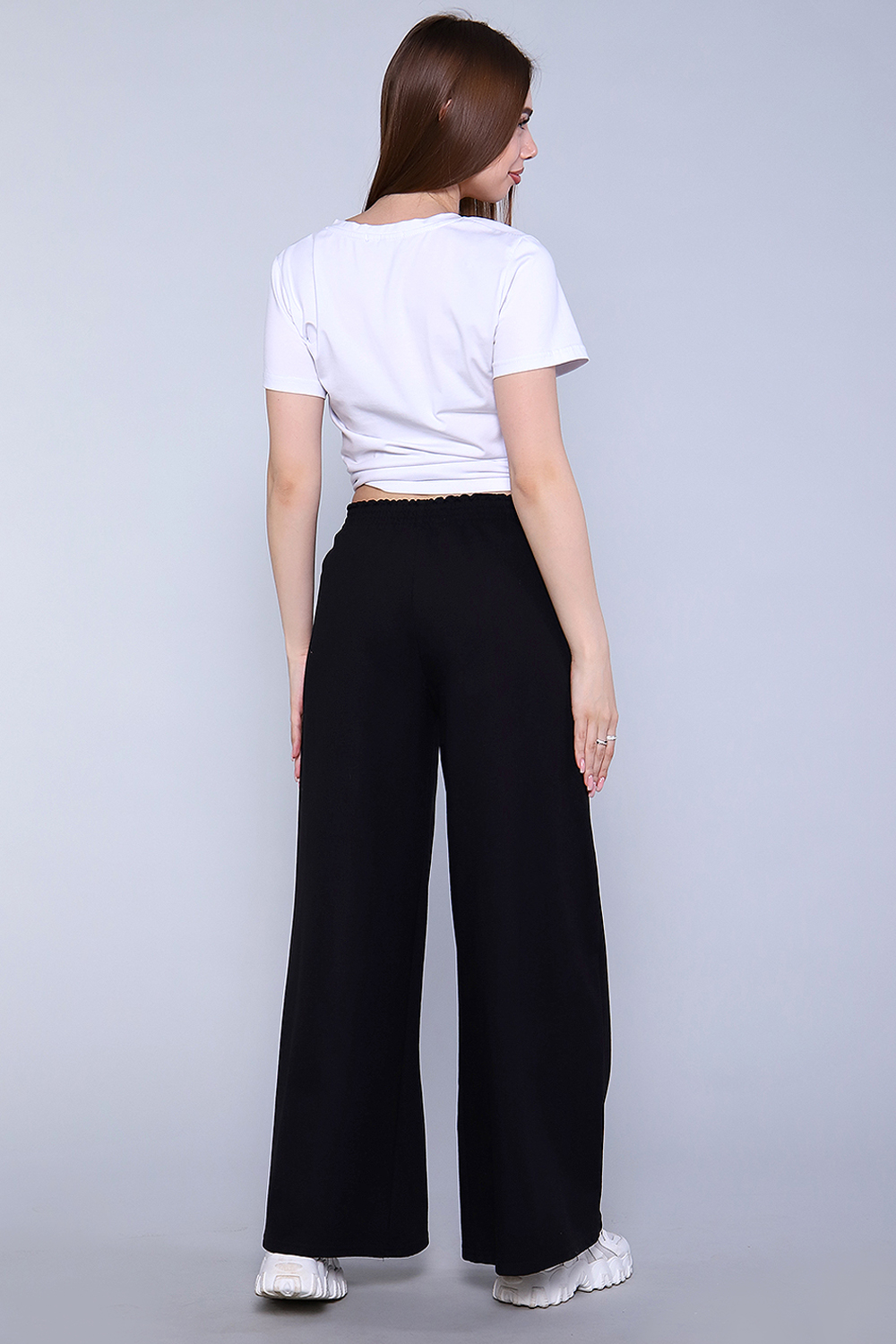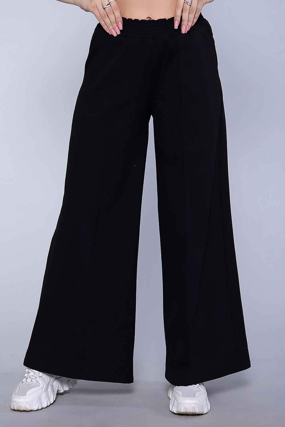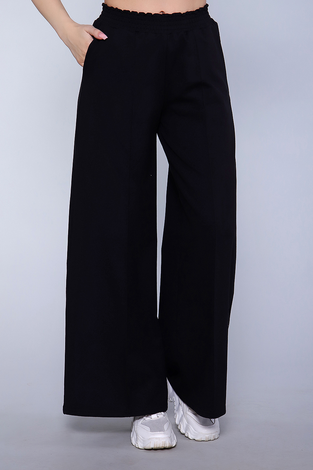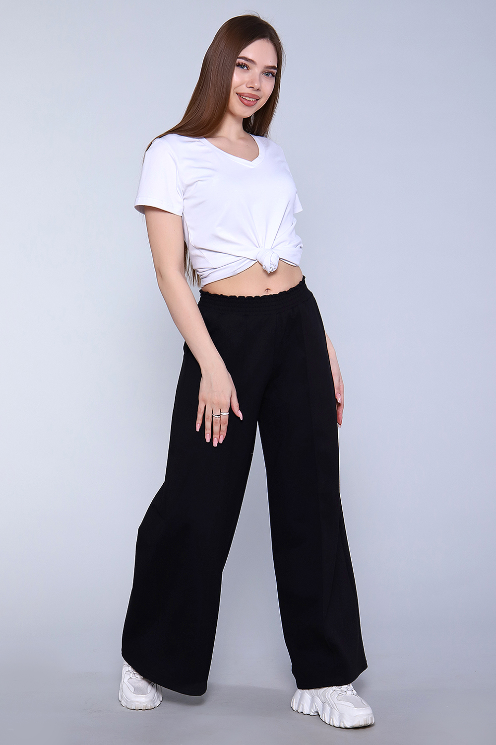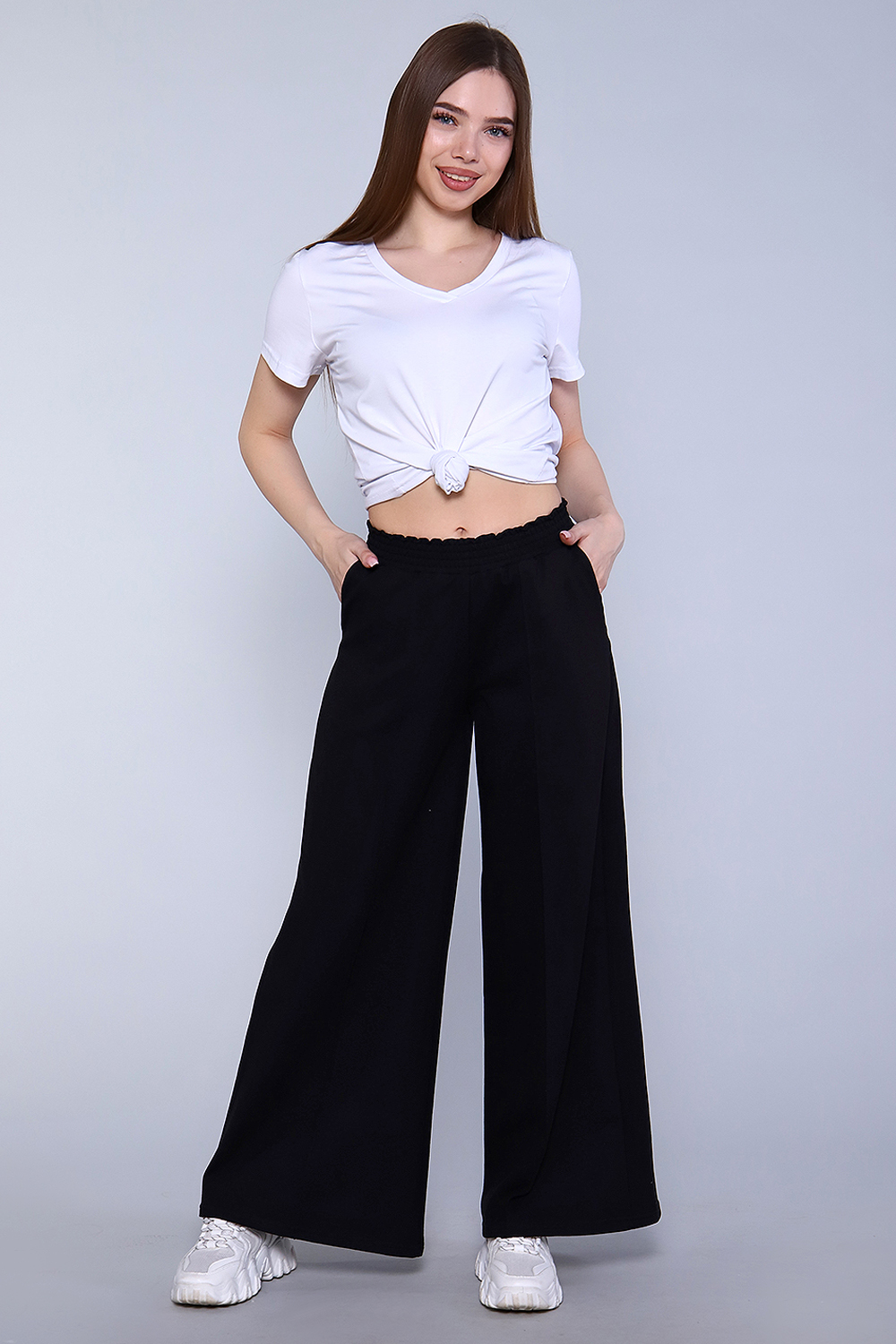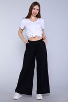 Широкие брюки женские палаццо со стрелками и с карманами. Пояс брюк обработан на поясной машине, что делает брюки практичными при носке – резинка не скручивается. В модели палаццо клеш от бедра, это визуально вытягивает фигуру, делает стройнее и элегантнее. Брюки свободного кроя скрываю все недостатки фигуры. Отлично сочетаются с блузками, рубашками, футболками, пиджаками, свитерами и водолазками. Брюки палаццо отлично подойдут как на работу в офис, так и создадут праздничный вечерний образ.