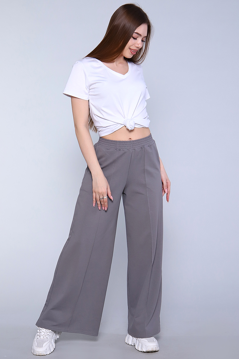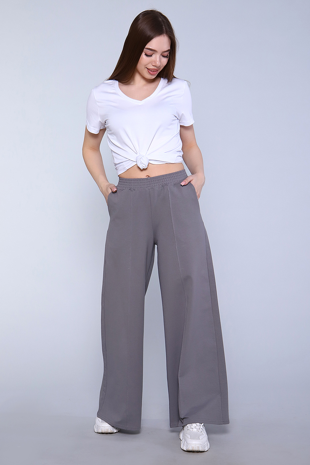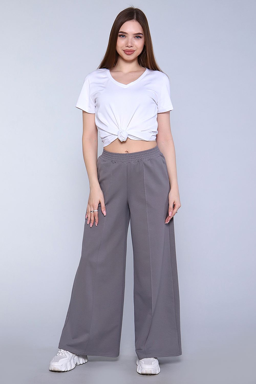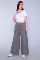 Широкие брюки женские палаццо со стрелками и с карманами. Пояс брюк обработан на поясной машине, что делает брюки практичными при носке – резинка не скручивается. В модели палаццо клеш от бедра, это визуально вытягивает фигуру, делает стройнее и элегантнее. Брюки свободного кроя скрываю все недостатки фигуры. Отлично сочетаются с блузками, рубашками, футболками, пиджаками, свитерами и водолазками. Брюки палаццо отлично подойдут как на работу в офис, так и создадут праздничный вечерний образ.