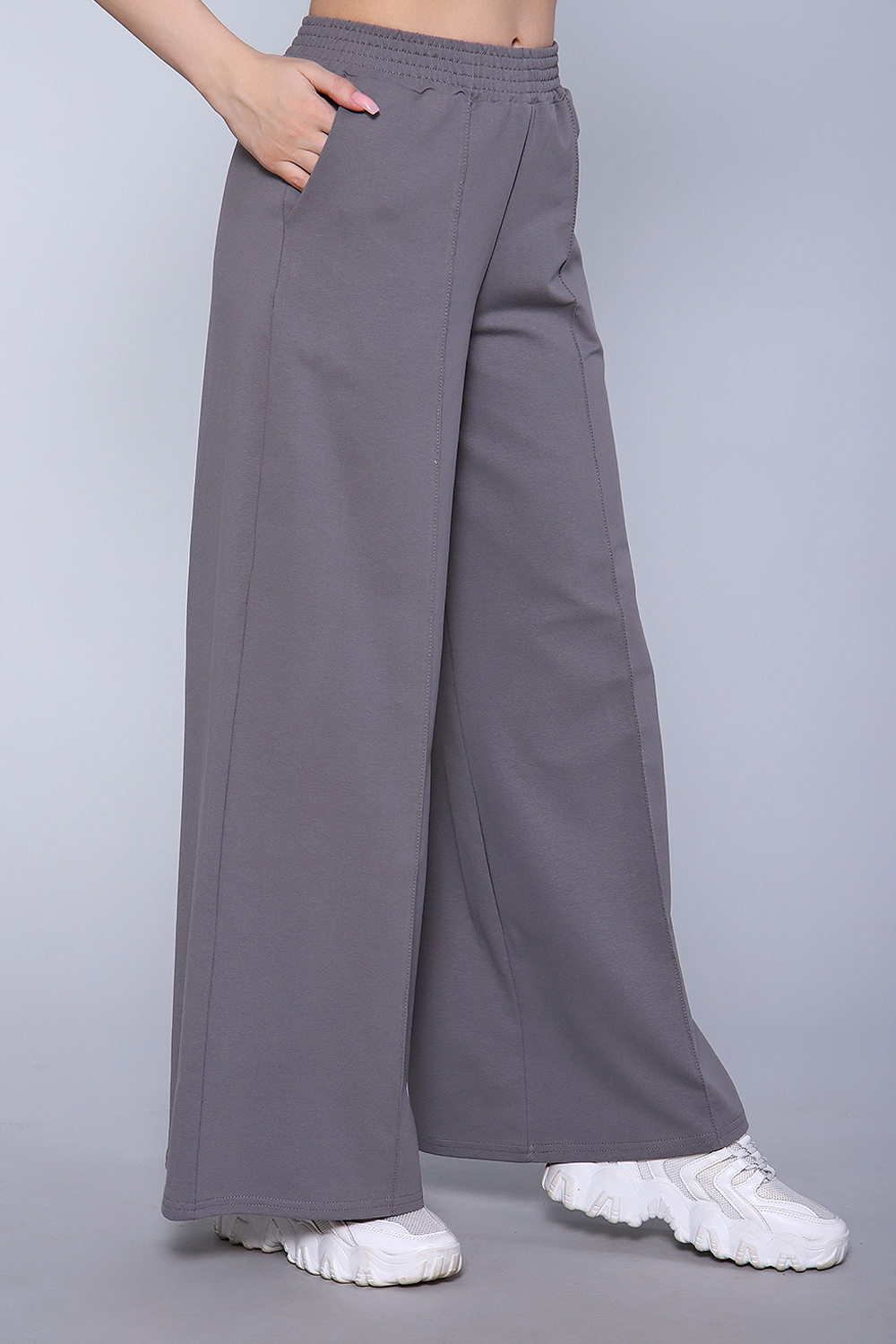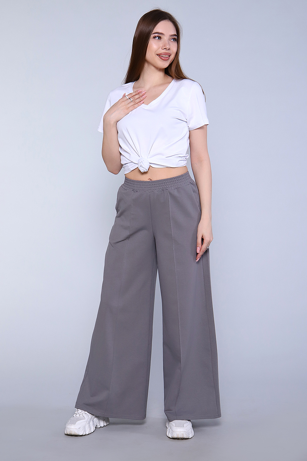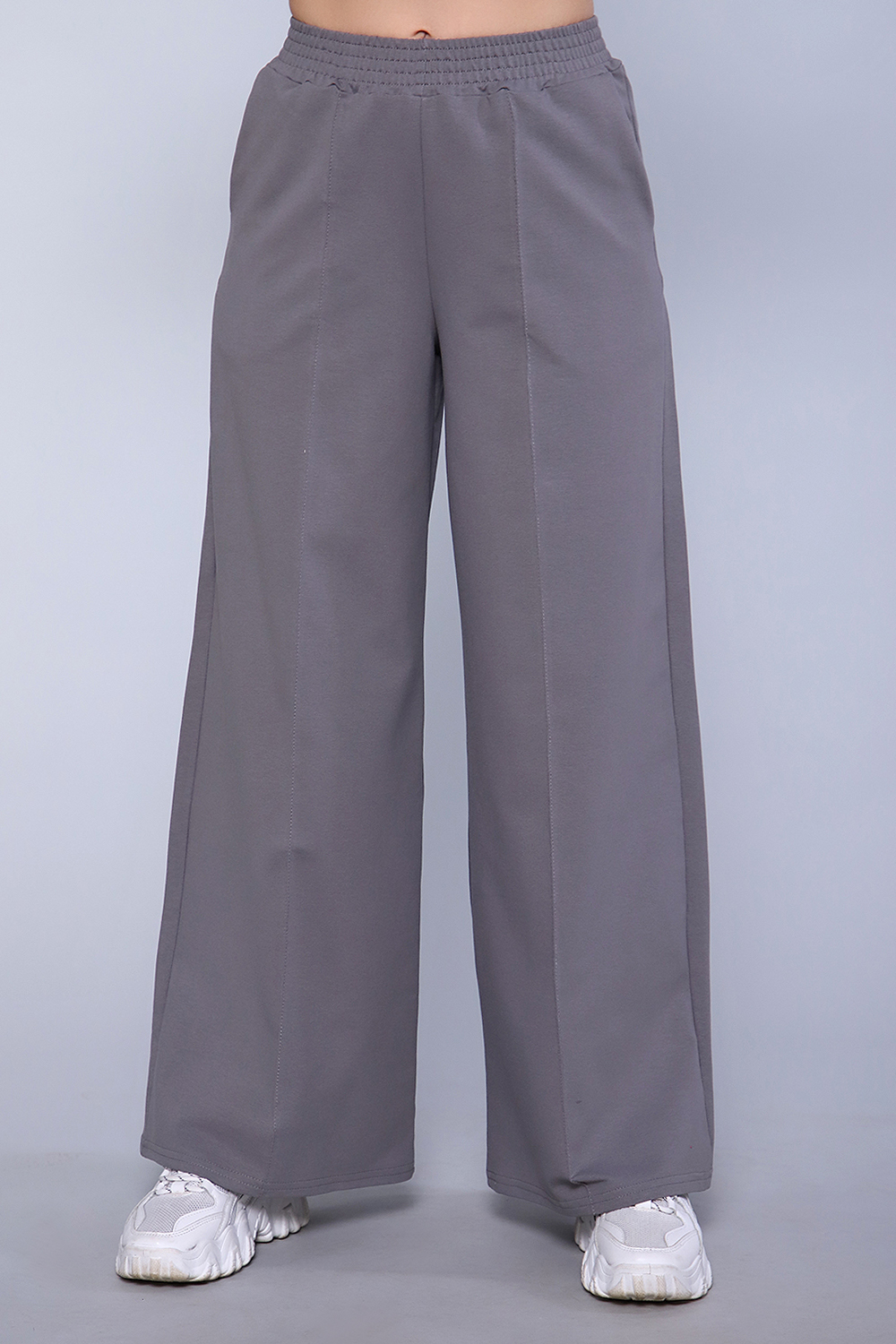 Широкие брюки женские палаццо со стрелками и с карманами. Пояс брюк обработан на поясной машине, что делает брюки практичными при носке – резинка не скручивается. В модели палаццо клеш от бедра, это визуально вытягивает фигуру, делает стройнее и элегантнее. Брюки свободного кроя скрываю все недостатки фигуры. Отлично сочетаются с блузками, рубашками, футболками, пиджаками, свитерами и водолазками. Брюки палаццо отлично подойдут как на работу в офис, так и создадут праздничный вечерний образ.