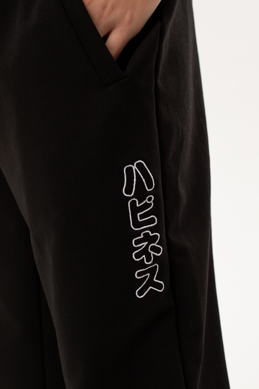 Легкие спортивные штаны для мальчика прекрасно подходят для школы на физкультуру, спортивных тренировок и дома. Брюки выполнены из качественного турецкого футера двунитки качества пенье. Хлопок в составе (80%) обеспечивается комфортную носку, а полиэстер (20%) долговечность и отсутствие вытянутых коленок. Посадка средняя, пояс на широкой резинке, низ брюк на манжете, по бокам глубокие карманы. Подходят для школьников от 3 до 11 класса. Надпись (переводится как "Счастье") - вышивка на японском языке. Модель с принтом позволит подросткам быть модными и стильными каждый день. Тренировочные джогерры создают ощущение легкости и свободы движений благодаря качественному трикотажу и конструктивным элементам. Универсальные брюки предназначены оставаясь актуальными круглый год благодаря своей универсальности.