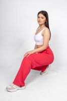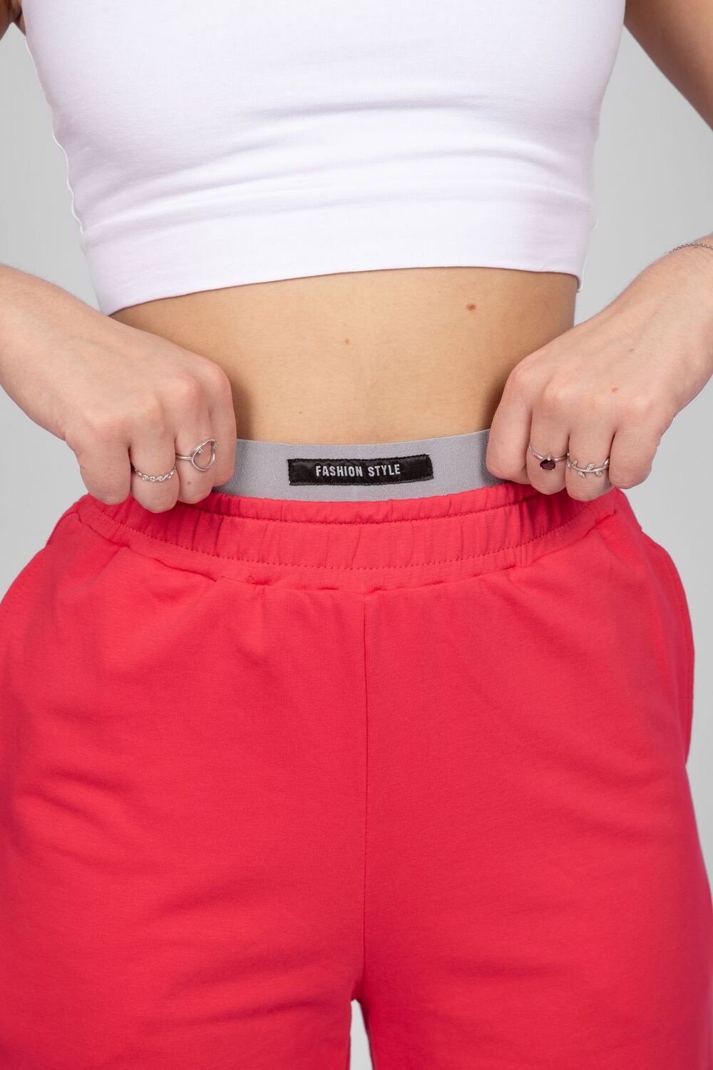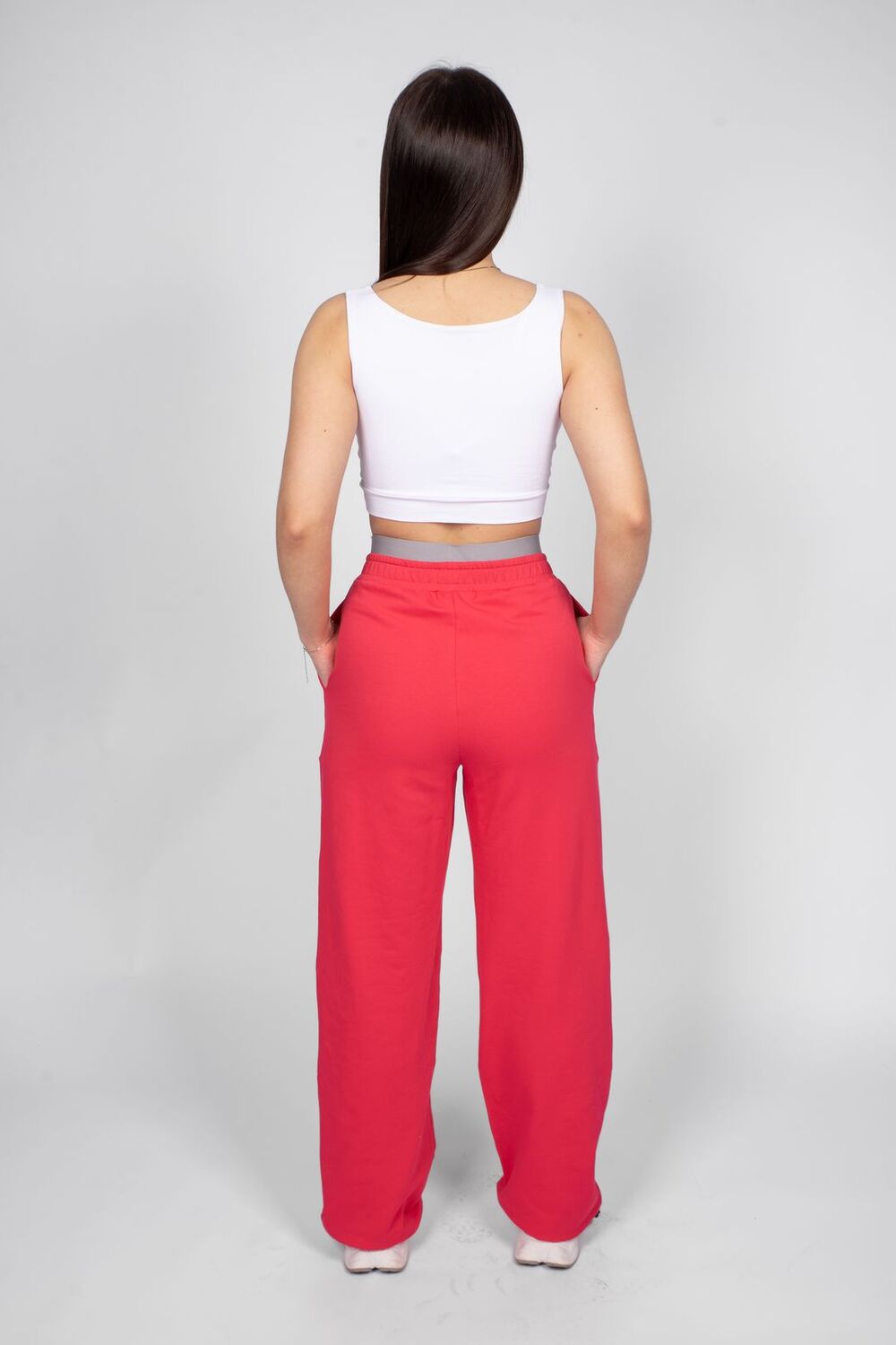 Брюки женские прямого силуэта. Пояс отрезной, выполнен из основного полотна, с эластичной тесьмой внутри. К верхнему срезу поясу притачена резинка, но выглядывает из пояса. На резинке декоративная нашивка. Надпись переводится как "Модный стиль". Модель рассчитана на рост 164-170см.