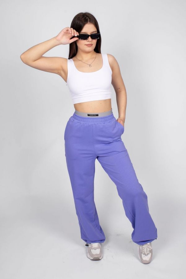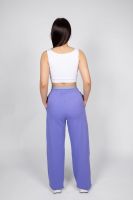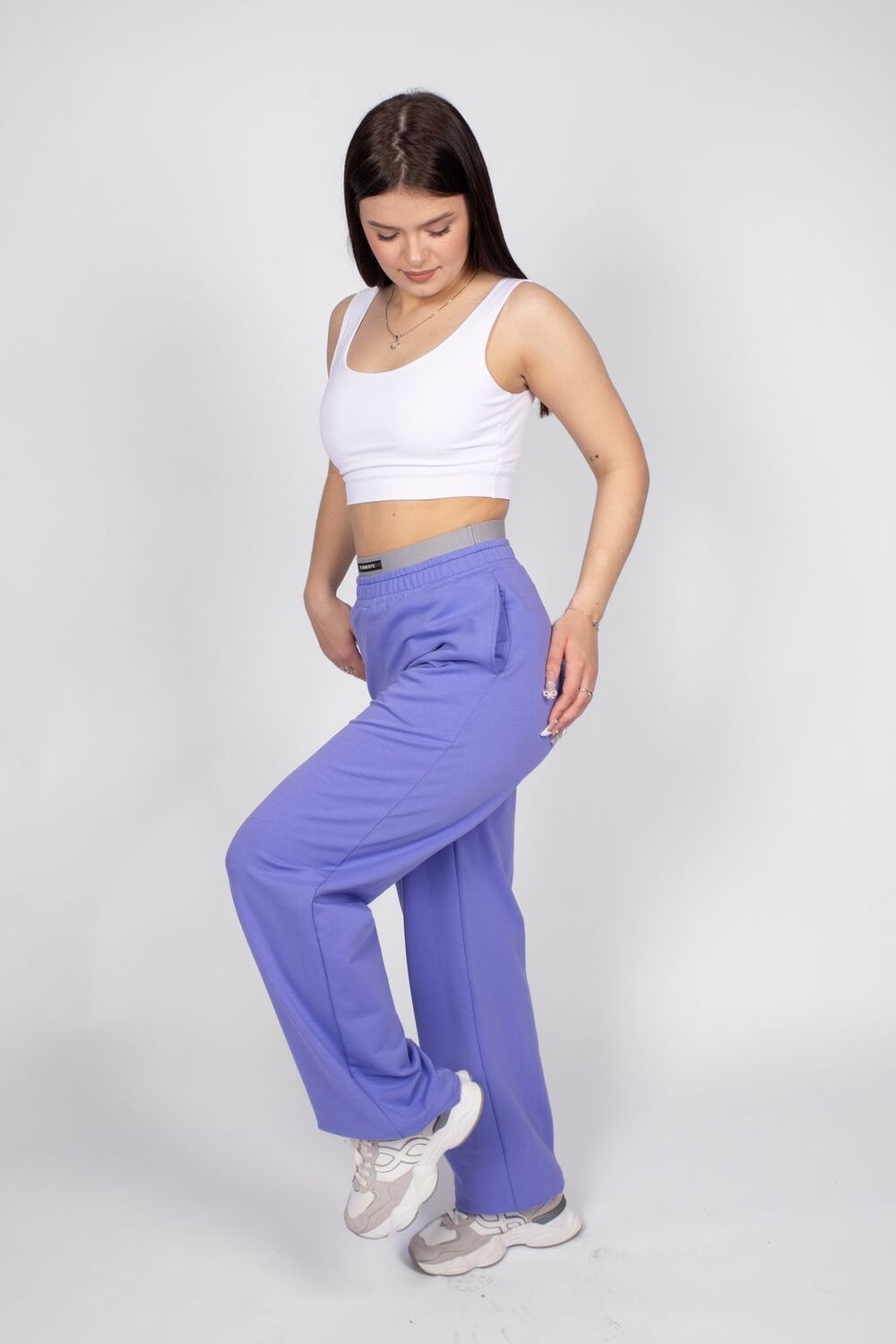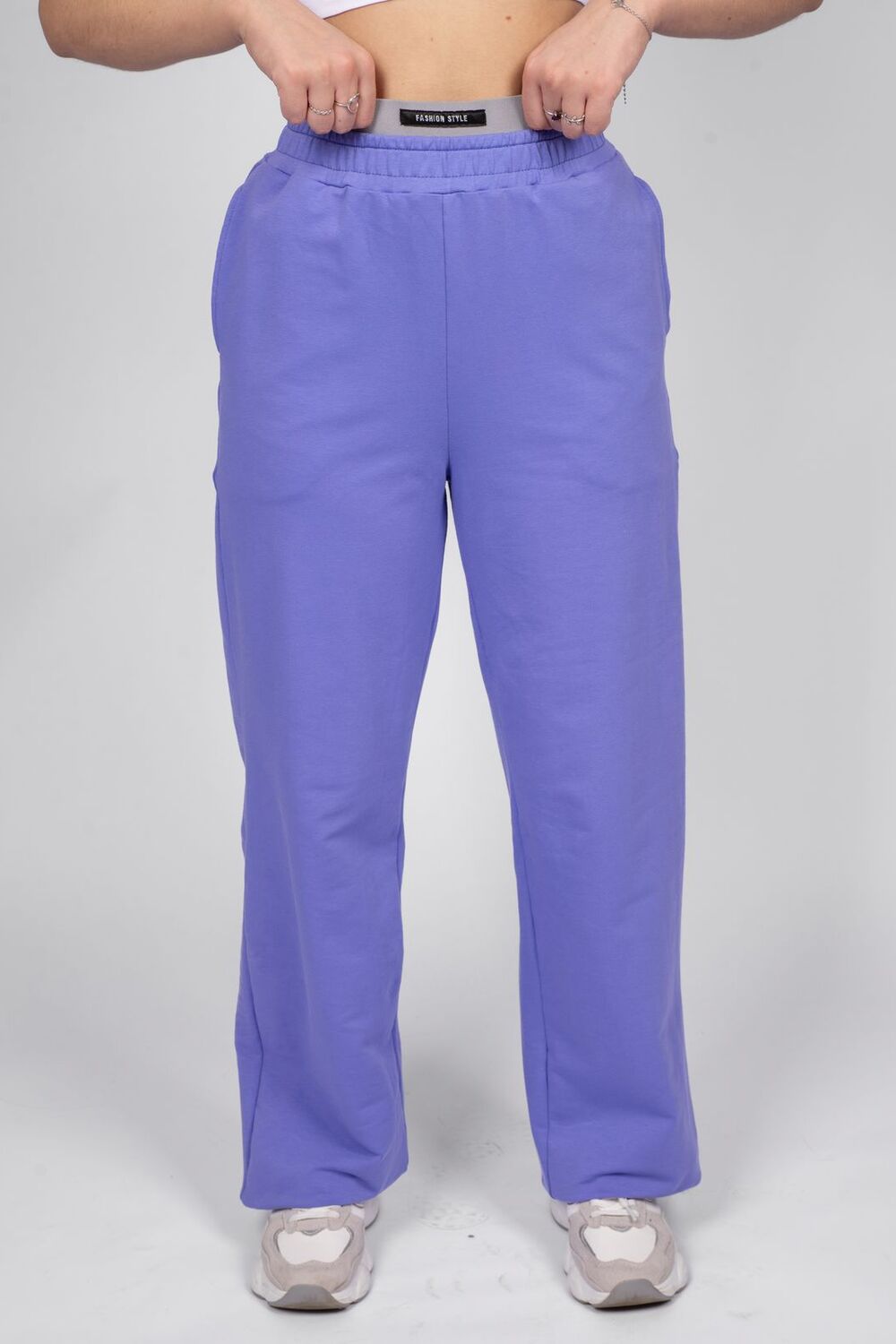 Брюки женские прямого силуэта. Пояс отрезной, выполнен из основного полотна, с эластичной тесьмой внутри. К верхнему срезу поясу притачена резинка, но выглядывает из пояса. На резинке декоративная нашивка. Надпись переводится как "Модный стиль". Модель рассчитана на рост 164-170см.
