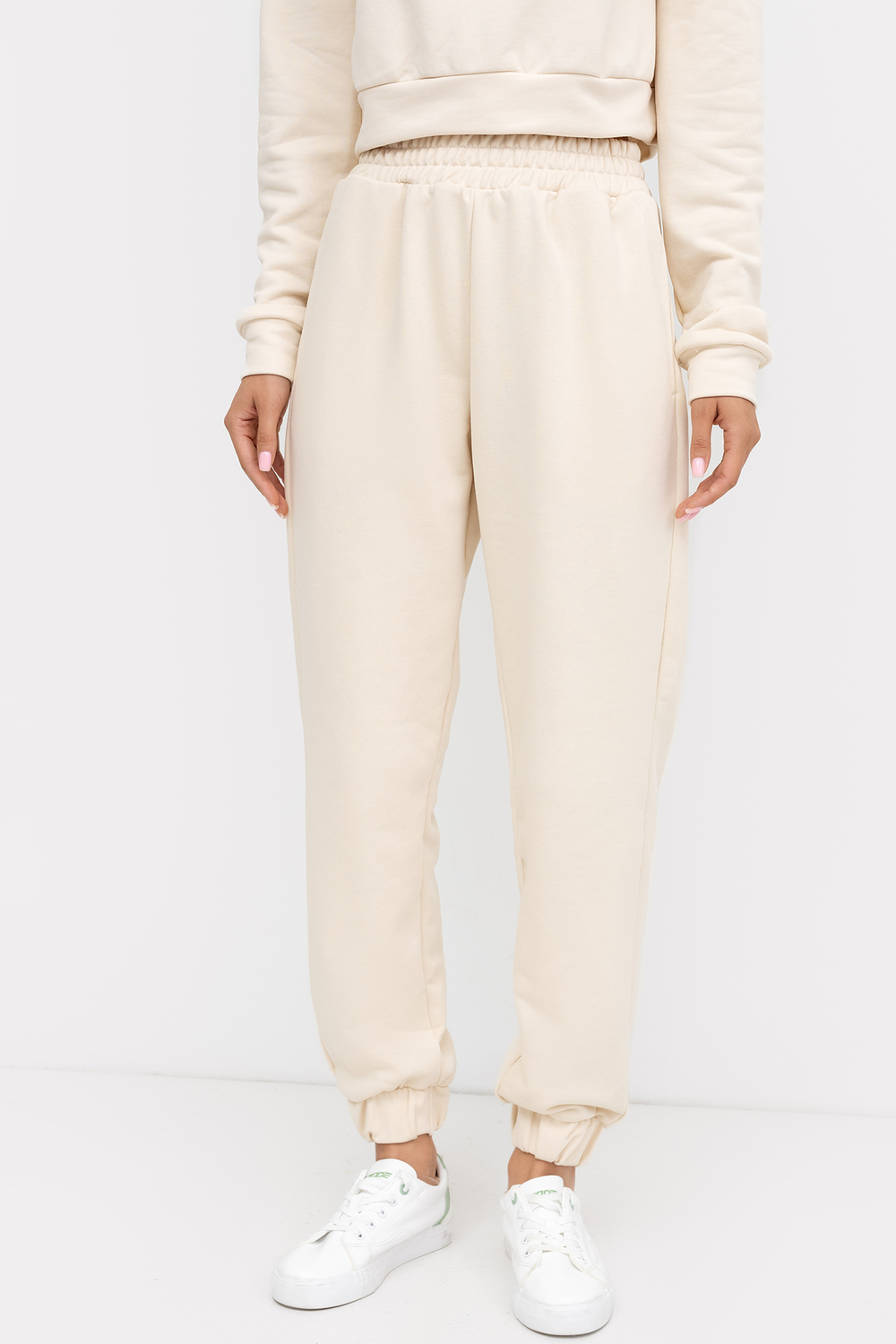Женские брюки-джоггеры из легкого трикотажного футера без подчеса. Силуэт свободный, максимально расслабленный. Есть удобные боковые карманы. Пояс с эластичной тесьмой внутри. Брюки завершаются манжетами с эластичной тесьмой внутри. Стильные брюки для модных городских образов!