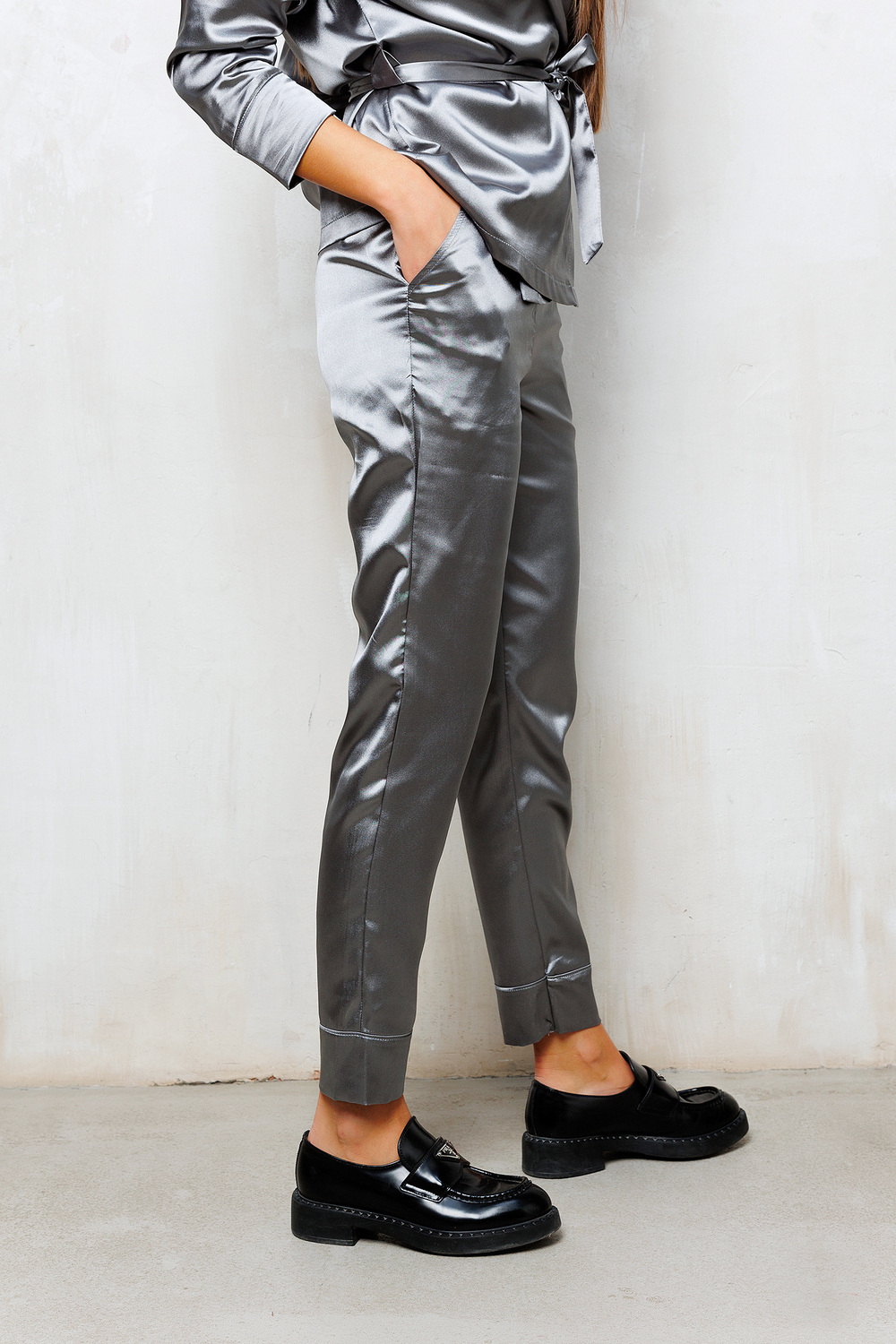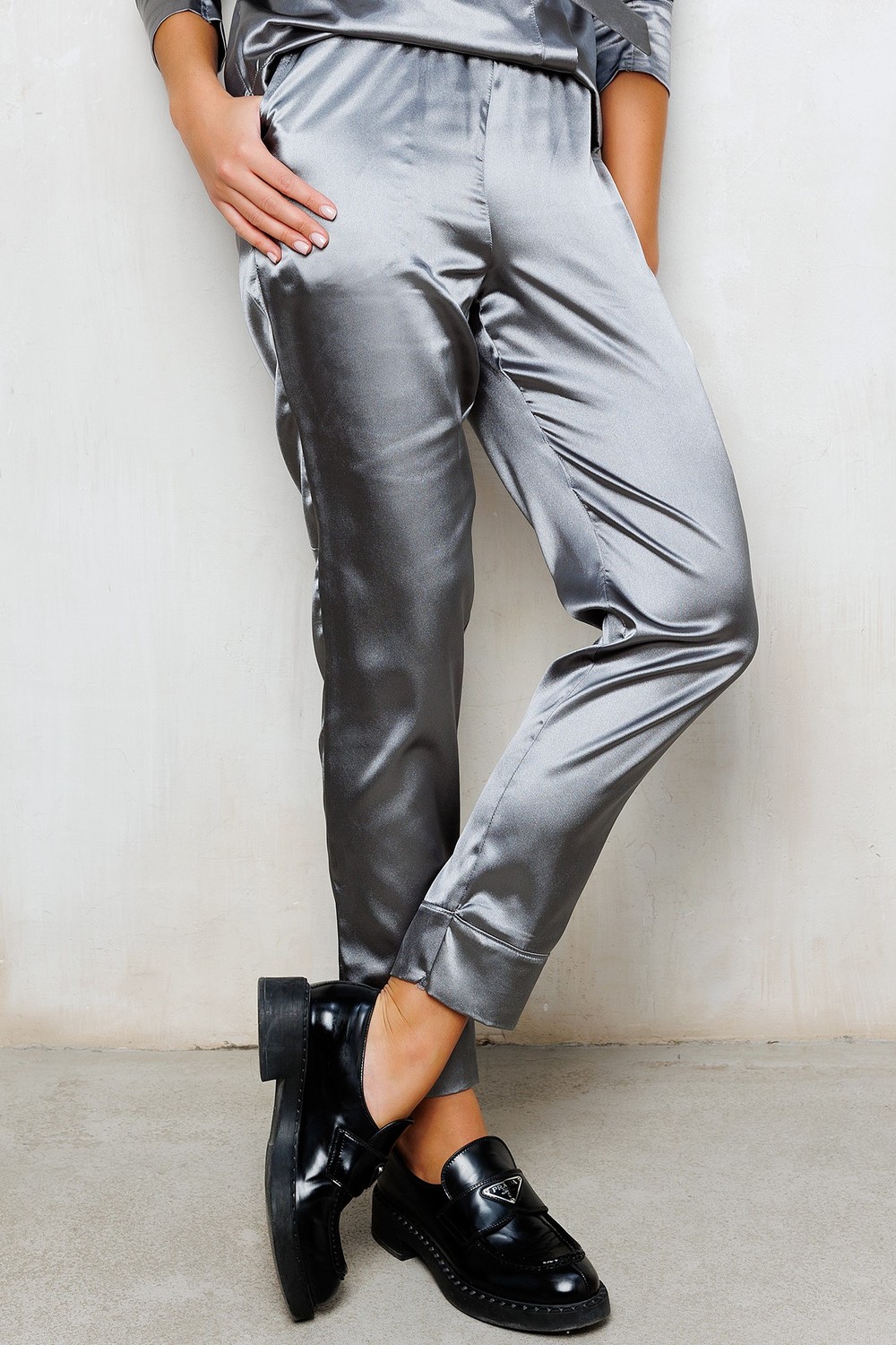 Брюки Raposa из лёгкого струящегося атласа. Модель дополнена боковыми карманами. Пояс на эластичной резинке. Рост модели 173 см. Для полного образа, рекомендуем сочетать брюки с атласным кардиганом Raposa.