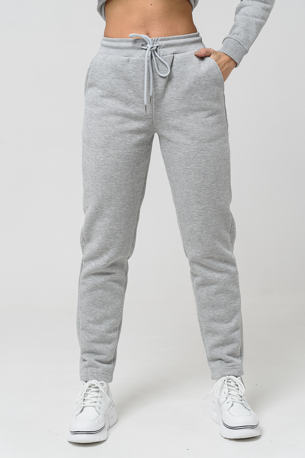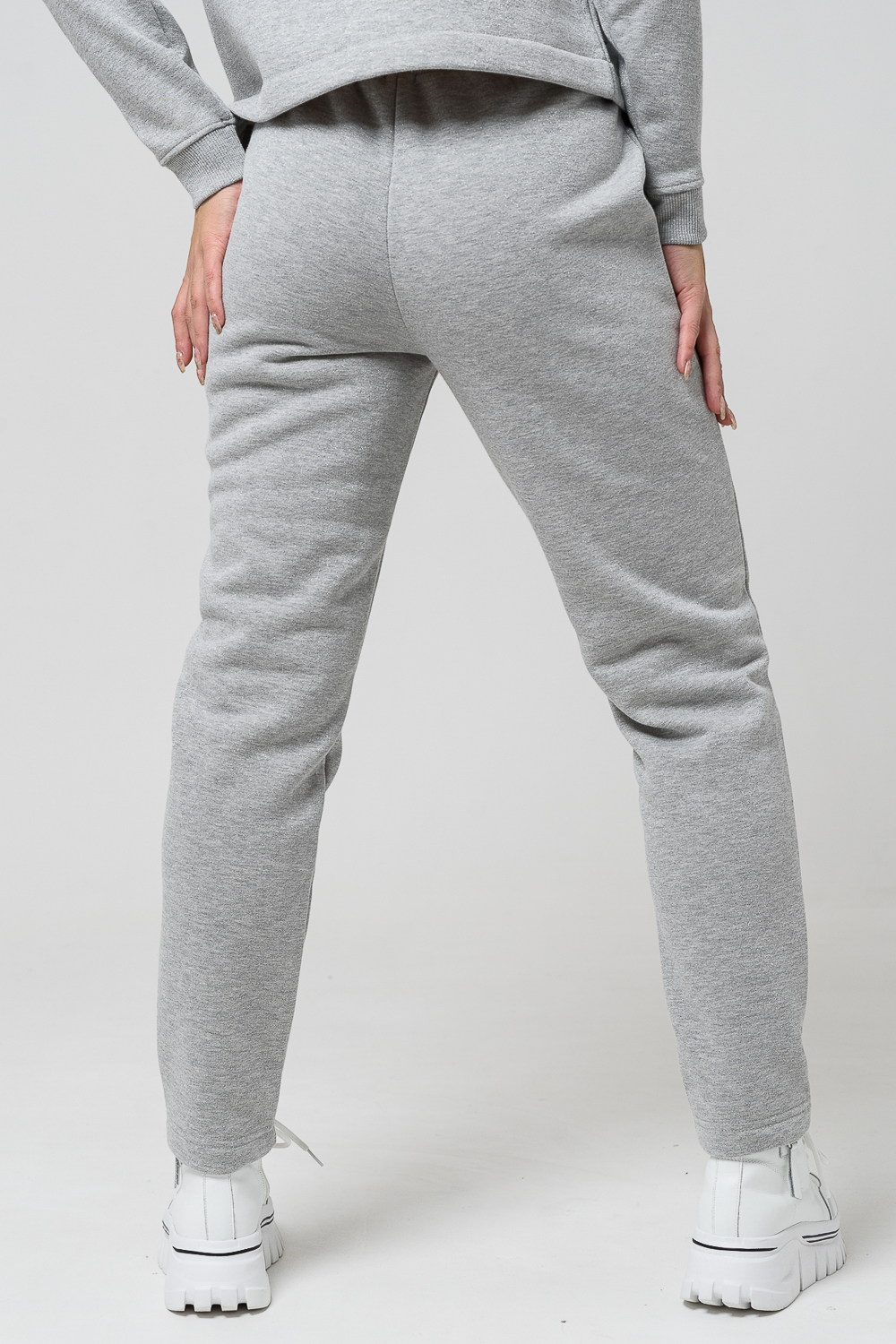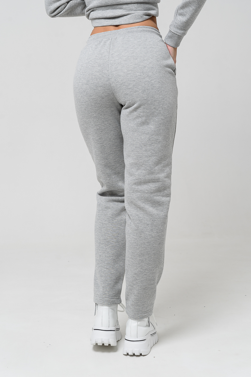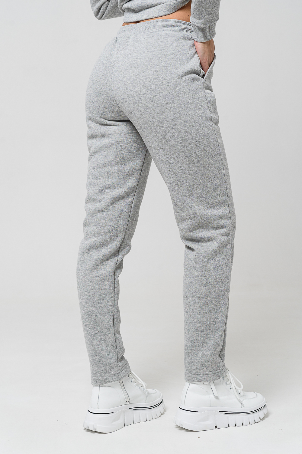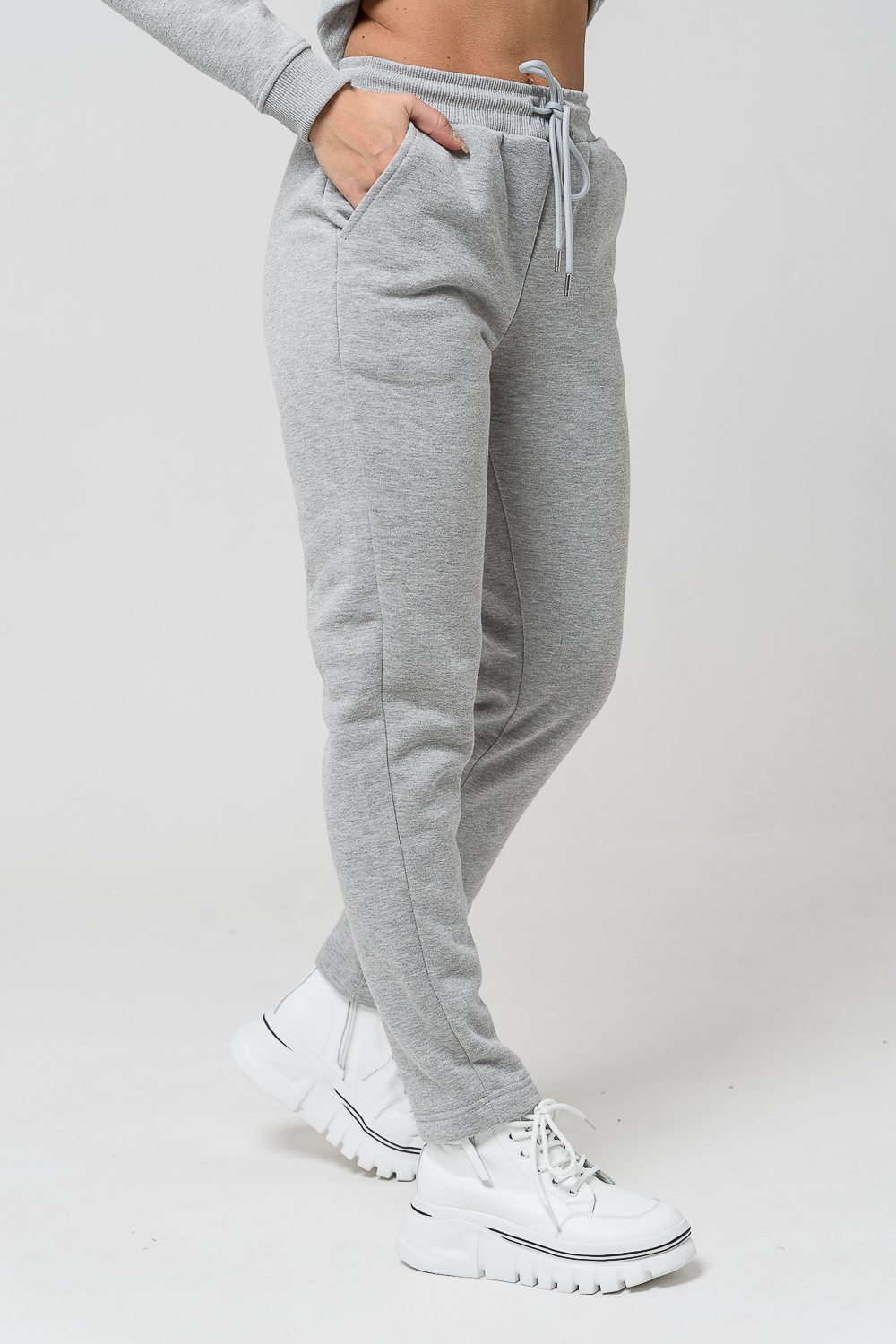 Брюки женские прямого силуэта. Выполнены из мягкой теплой ткани футера с начесом. Пояс брюк на эластичной широкой резинке со шнурком.