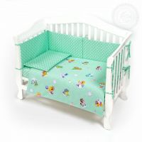 Набор в детскую кроватку «Бусинка» из поплина идеально подходит для малышей с первых дней жизни. Хлопковая ткань гипоаллергенная, мягкая, практичная. Дизайн нежный и волшебный. По сказочному зеленому лугу беззаботно скачут разноцветные пони. Набор очень компактный. Его легко брать с собой в гости или поездку. Малышам будут сниться сладкие сны. В состав комплекта (11 предметов) входят: - простынь универсальная на резинке 120 x 60 см – 1 штука; - подушка 40x60 c декоративным кантом по всему периметру. Наполнитель – термофайбер плотностью 200 гр/м2 – 1 шт; - наволочка стандартная 40 x 60 см с клапаном 1 штука; - пододеяльник 110 x 90 см 1 штука; - бортик 33 x 60 см. В комплекте 6 штук на завязочках, что позволяет использовать бортик по всему периметру кроватки ( 360 см.). На одном бортике наличие 3-х карманов для удобства родителей. - одеяльце 110x90 см в количестве 1 шт. Наполнитель – термоскрепленное волокно бамбука. Плотность наполнителя 150 г/м2.