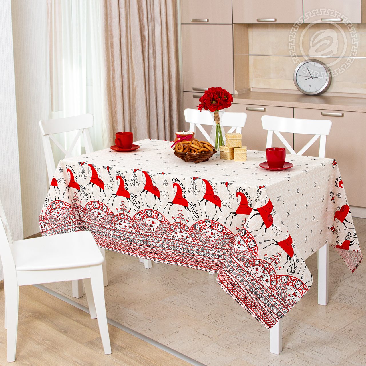 Если Вы любите русские сказки, если с интересом рассматриваете старинные гравюры в музеях, то для Вас наши «Былины» с необыкновенным колоритом. Скатерть из рогожки украшена яркой и самобытной картиной с оригинальной росписью. Здесь и богатырские былинные кони, и орнаменты с уникальными деталями. «Былины» сочетают классику и новаторство, традиции и авторский подход. Это трендовый рисунок, который дарит ощущение сказки.