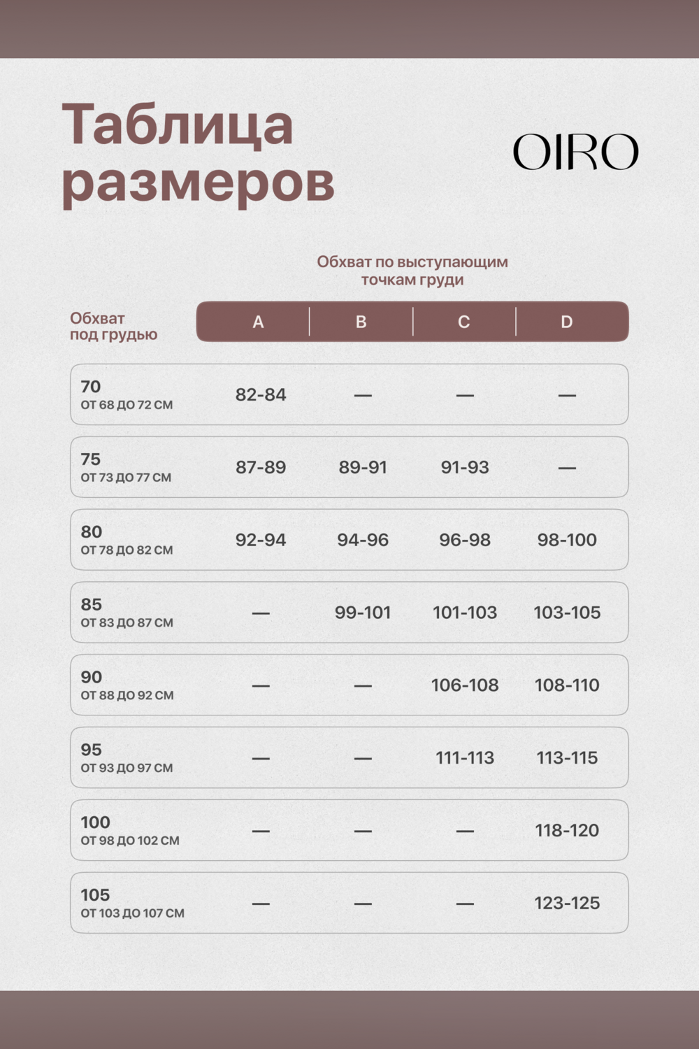 Размеры | 70A, 75С, 75B, 75A, 80C, 80B, 80A, 80D, 85D, 85C, 85B, 90D, 90C, 95C, 95D, 100D, 105D |