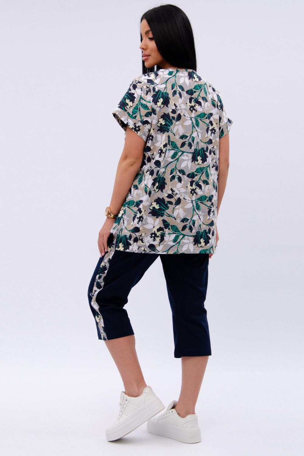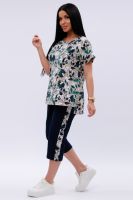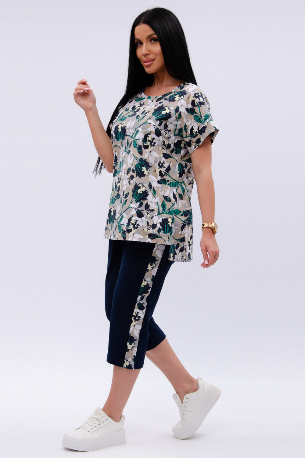 Женский костюм из футболки и бриджей — отличный выбор для дачного сезона и прогулок. Бриджи черного цвета из 100% хлопка обеспечивают комфорт и свободу движения, что особенно важно для активного отдыха на свежем воздухе или дома.