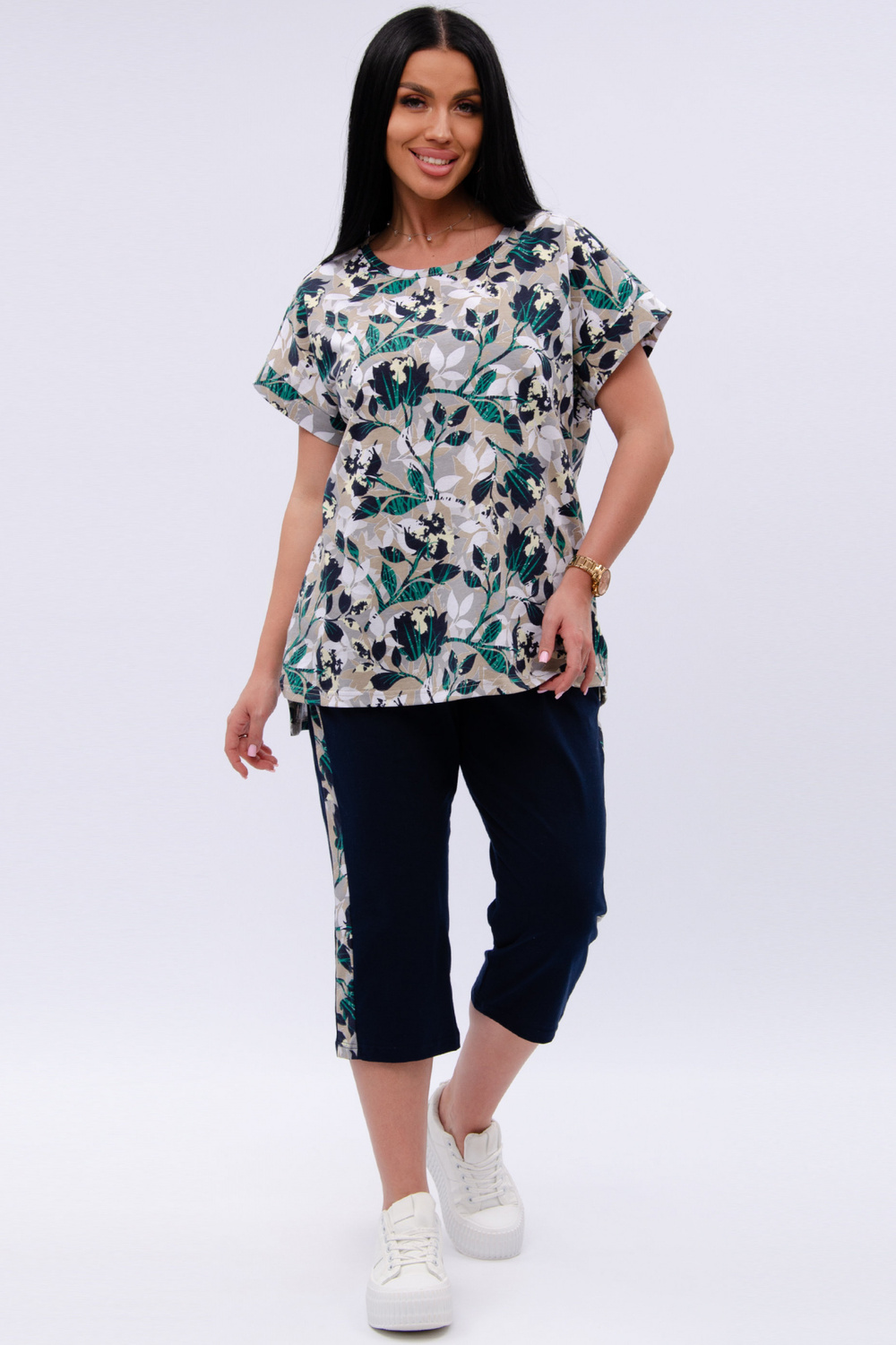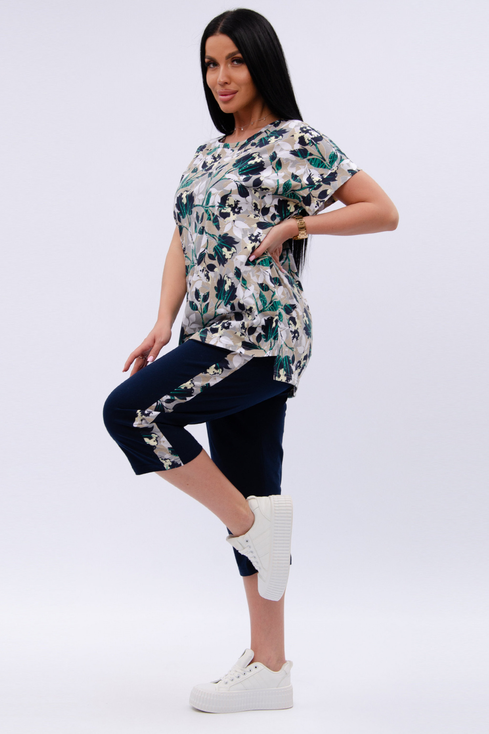 Женский костюм из футболки и бриджей — отличный выбор для дачного сезона и прогулок. Бриджи черного цвета из 100% хлопка обеспечивают комфорт и свободу движения, что особенно важно для активного отдыха на свежем воздухе или дома.