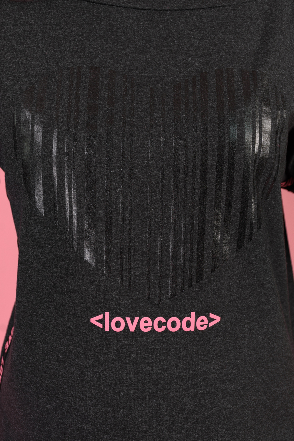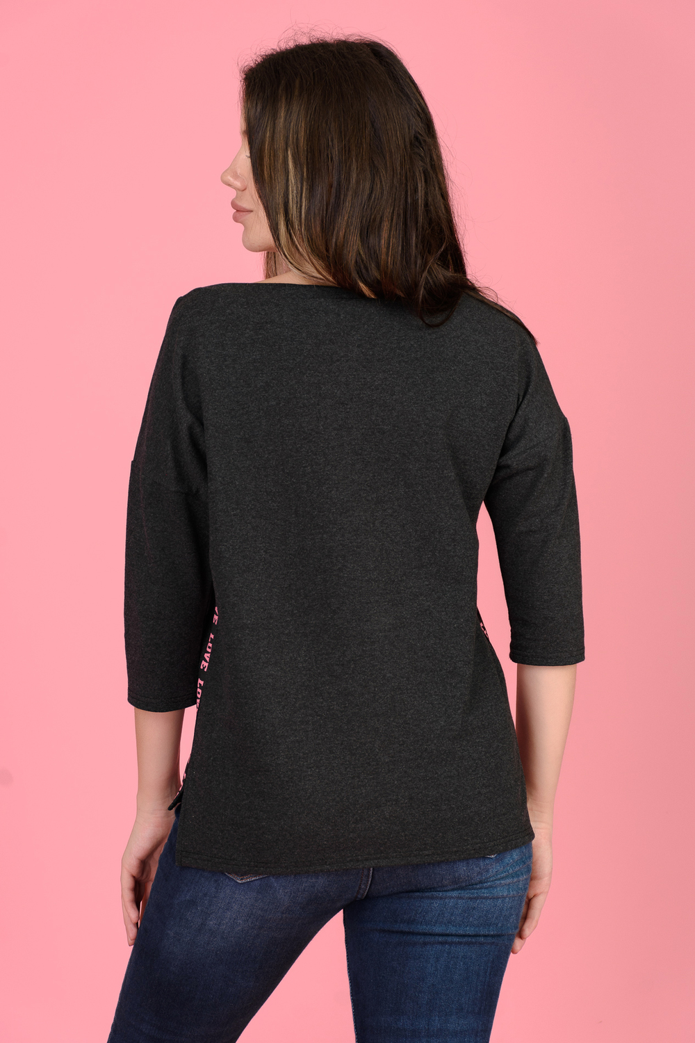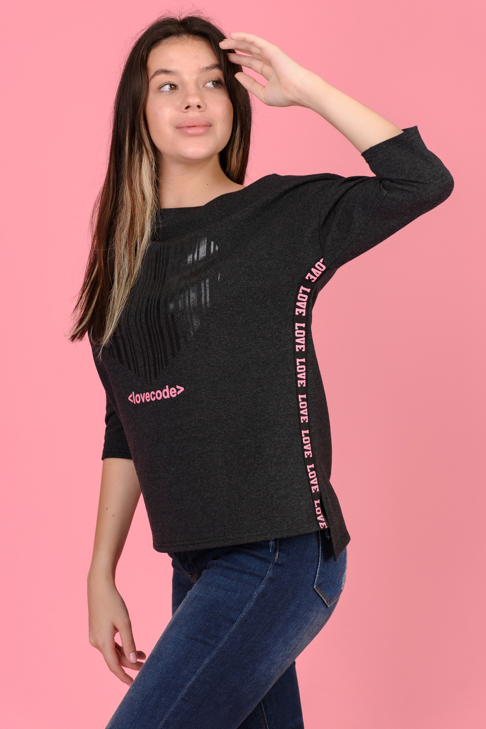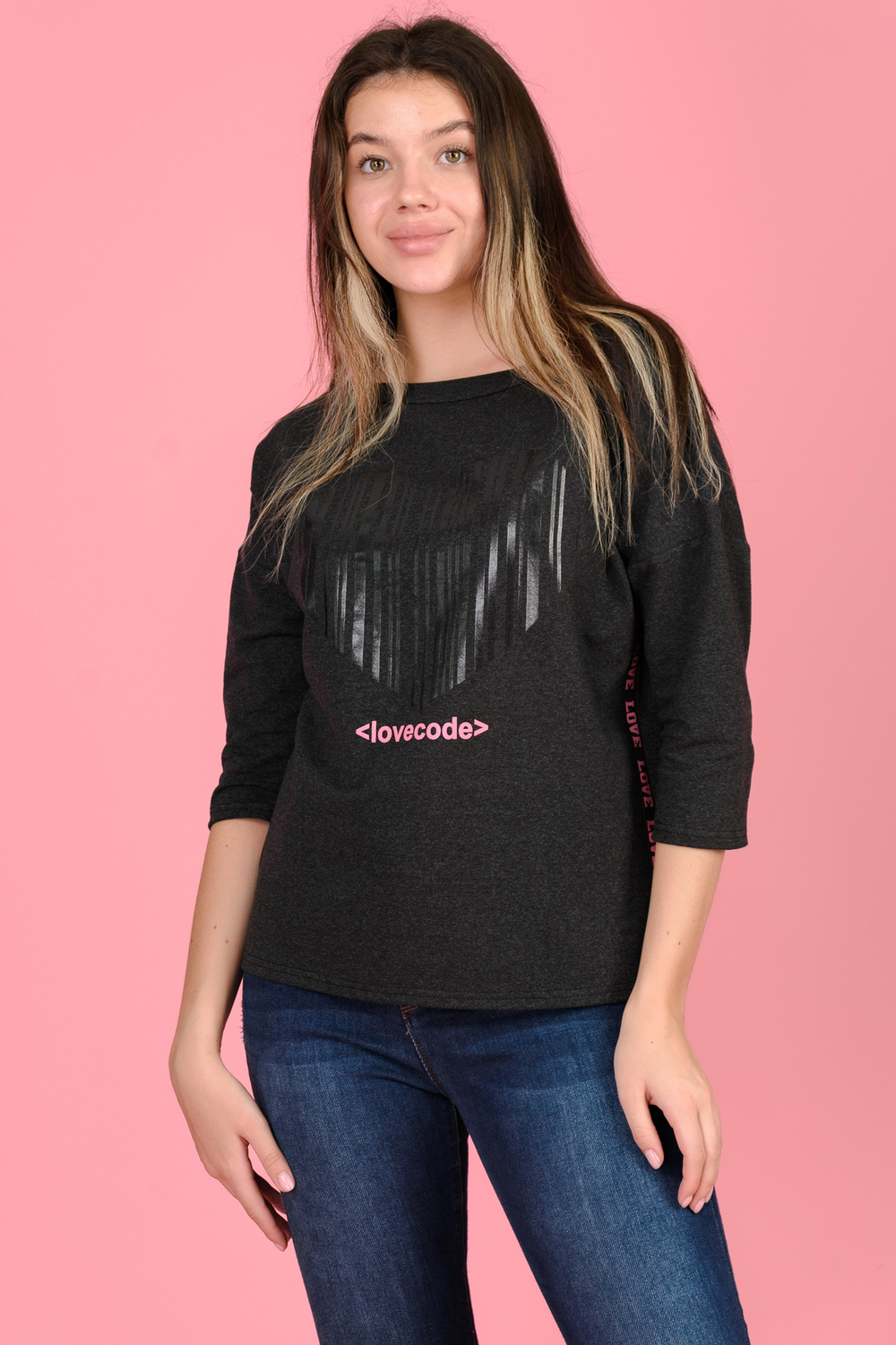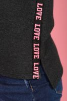 Джемпер с принтом в виде сердца гармонично сочетается с лампасами, расположенными в боковых швах. Горловина в виде "лодочки" обработана обтачкой, спущенная пройма, рукав 3/4. Низ спинки удлинён, по бокам небольшие разрезы. Джемпер стильный, комфортный подойдёт современной моднице как для активного отдыха, так и для работы в офисе.