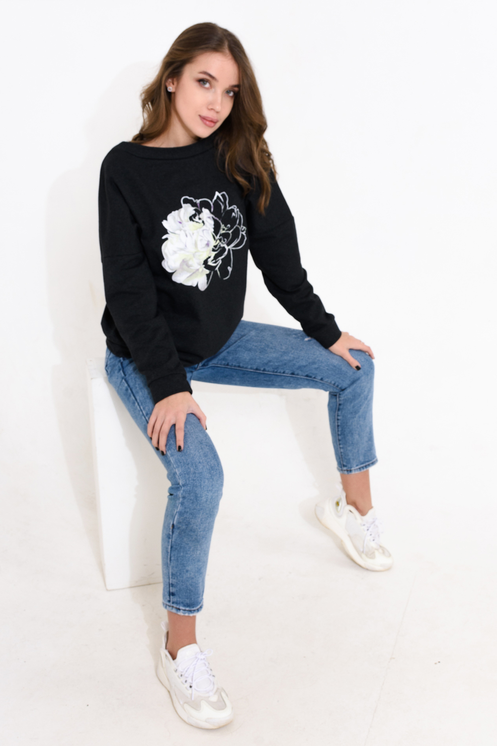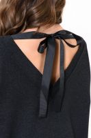 Джемпер с нежным принтом из футера с лайкрой 2-х нитка. Горловина в виде "лодочки" обработана обтачкой, на спинке фигурный вырез декорирован бантом. Спущенная пройма, длинный рукав и низ джемпера обработаны широким манжетом. Модный и универсальный джемпер отлично впишется как в офисный, так в повседневный и даже в романтический лук современной модницы.