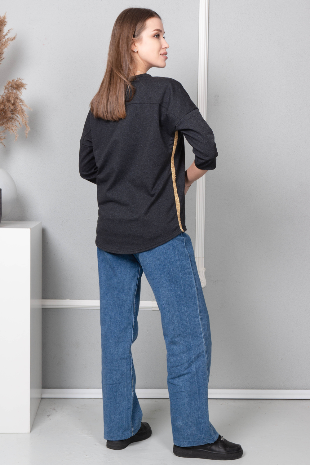 Джемпер из футера с лайкрой, круглая горловина обработана обтачкой, спущенная пройма, рукав 3/4. На спинке кокетка, низ спинки слегка удлинён и закруглён. Стильный принт и лампасы по боковым швам придают джемперу некую изюминку. Тёплый, комфортный джемпер для девушек любой фигуры и возраста