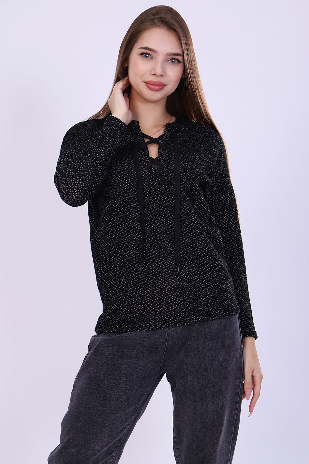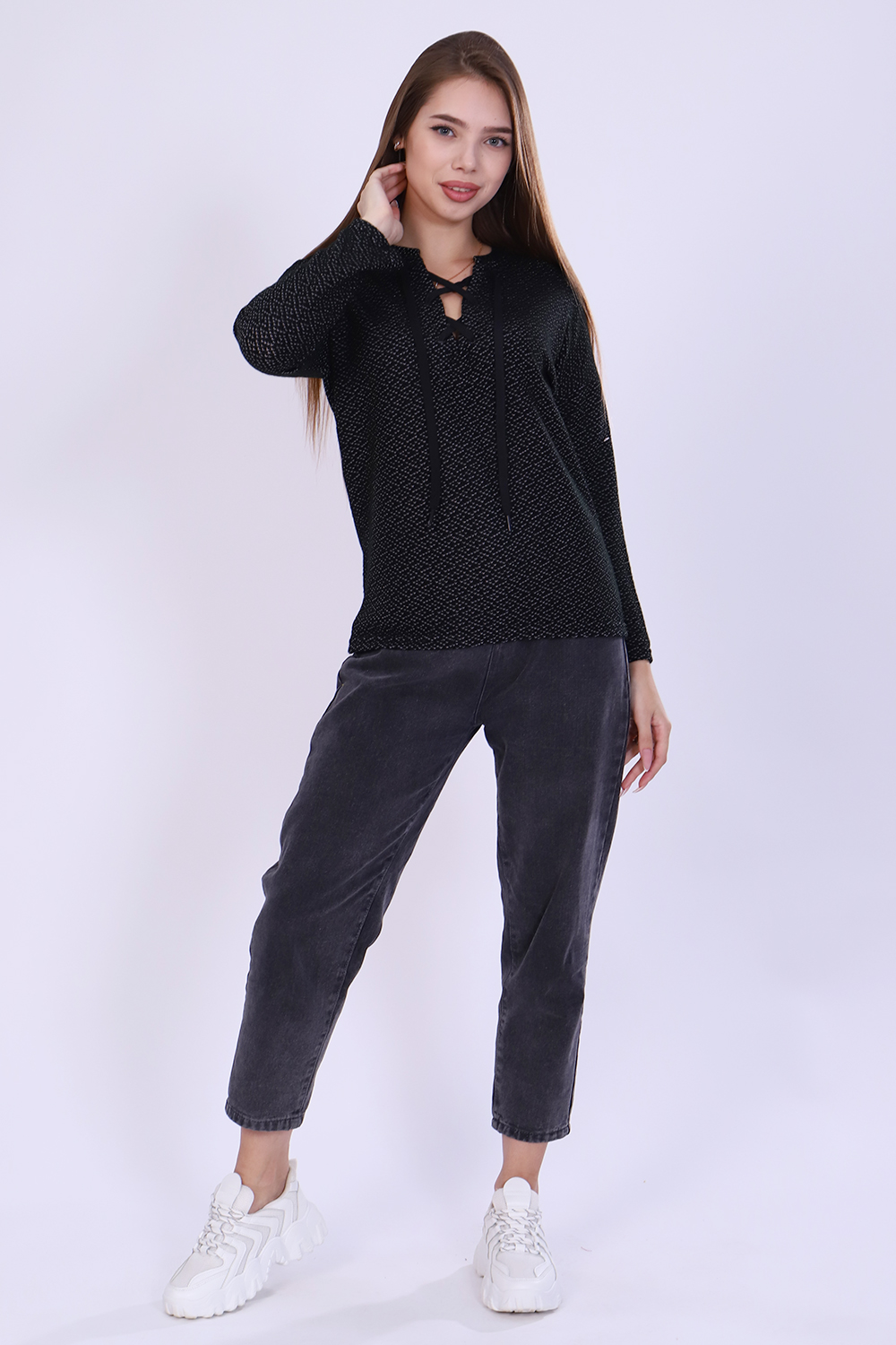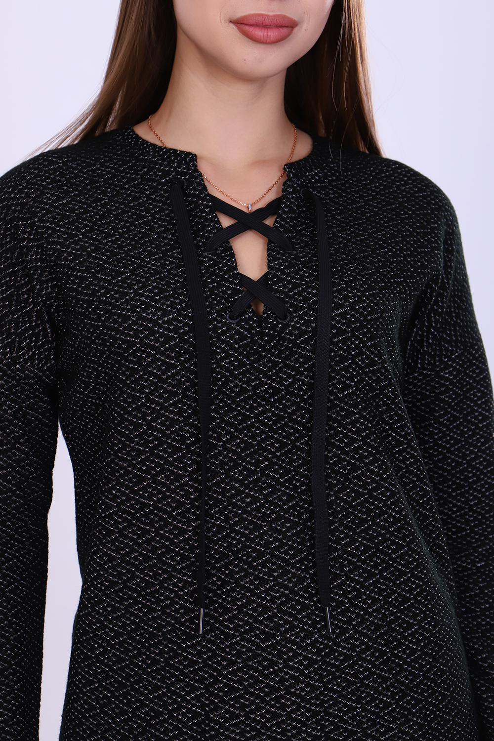 Джемпер женский из мягкого вязаного трикотажа. V-образный вырез горловины декорирован люверсами и шнуром, спущенная пройма, длинный рукав. Джемпер комфортный, универсальный, создаст неповторимый стиль для модницы любой фигуры и возраста. С наступлением холодов эта вещь становится основой всего базового гардероба, отличным офисным вариантом.