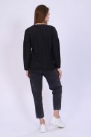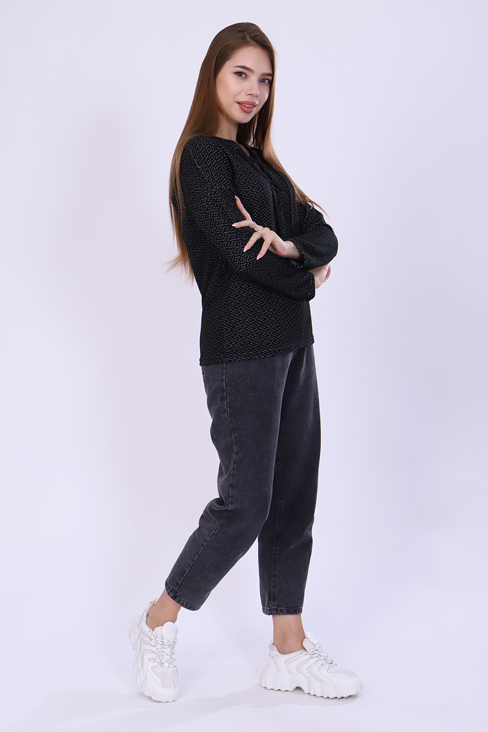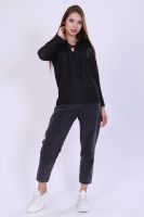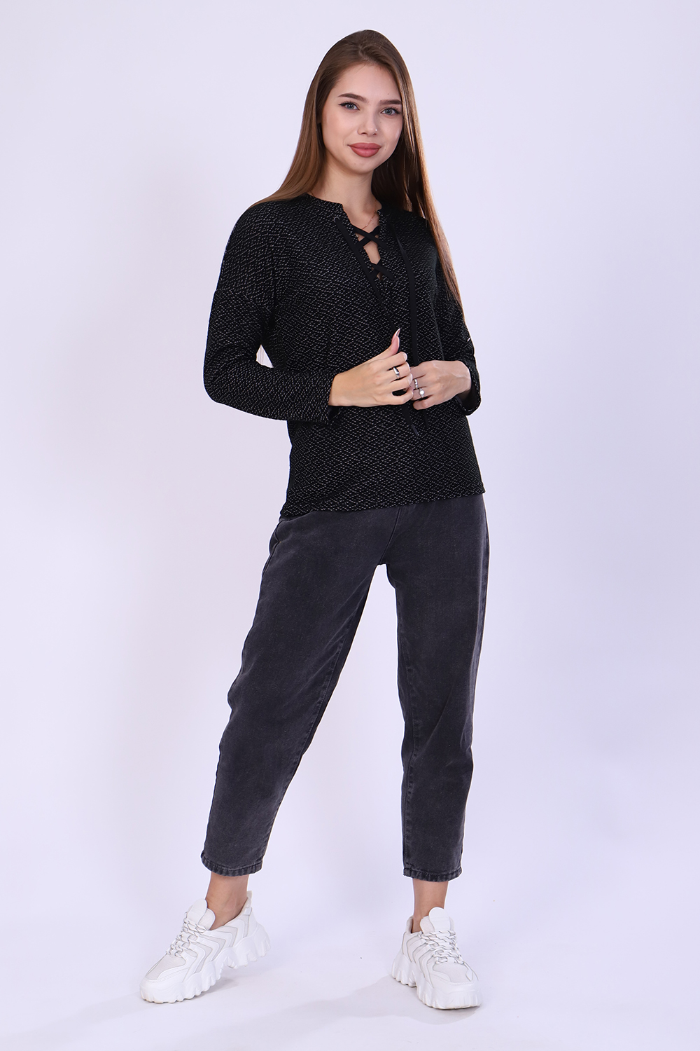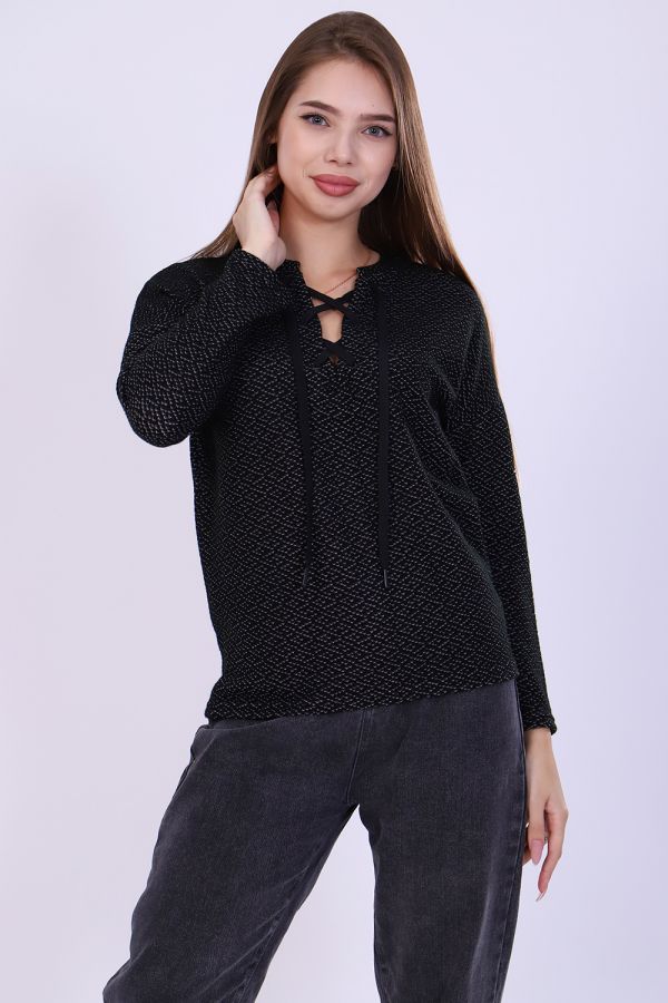 Джемпер женский из мягкого вязаного трикотажа. V-образный вырез горловины декорирован люверсами и шнуром, спущенная пройма, длинный рукав. Джемпер комфортный, универсальный, создаст неповторимый стиль для модницы любой фигуры и возраста. С наступлением холодов эта вещь становится основой всего базового гардероба, отличным офисным вариантом.