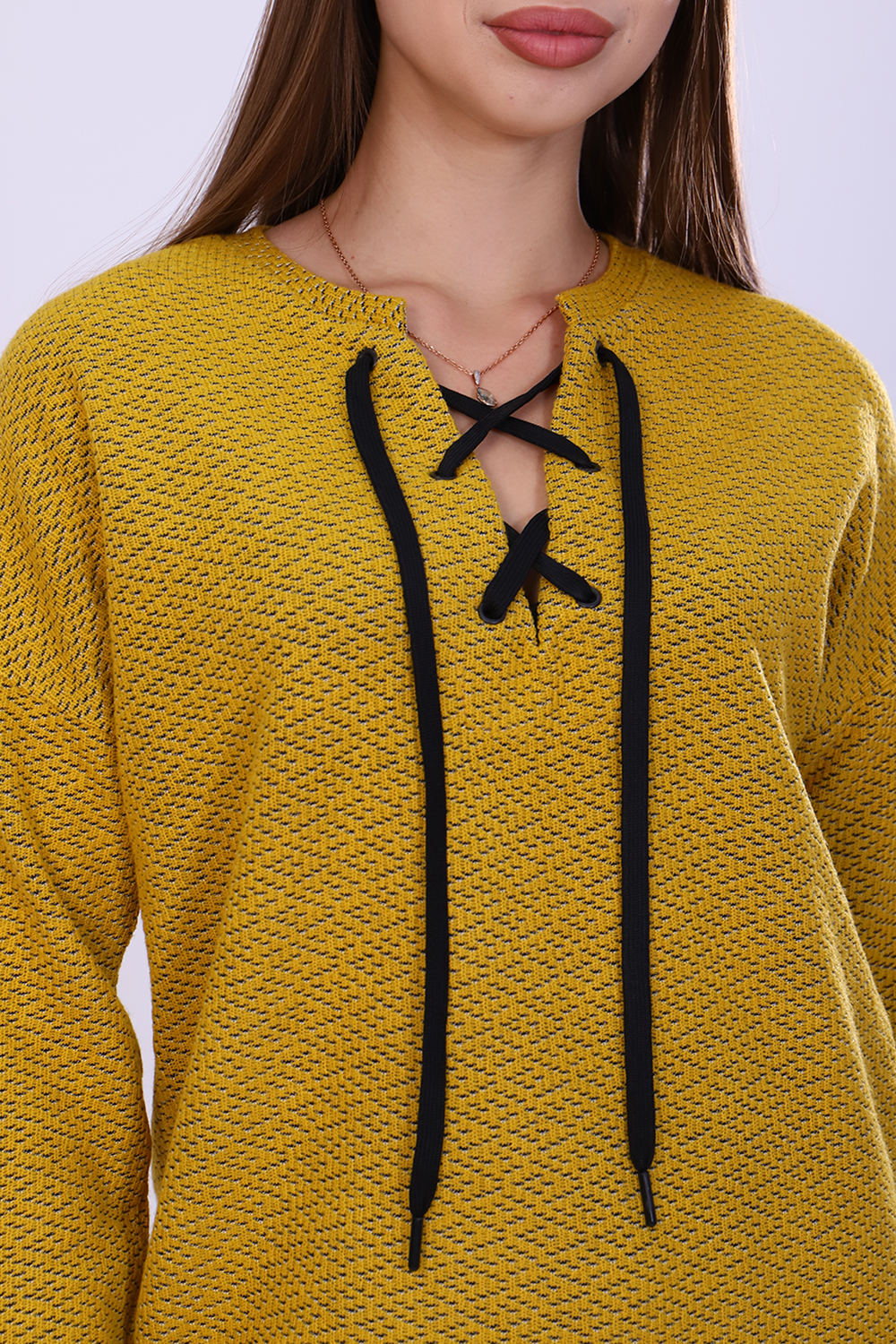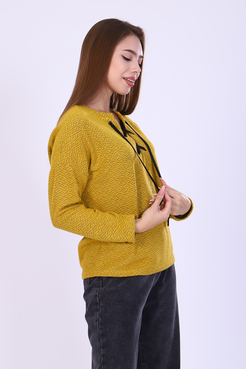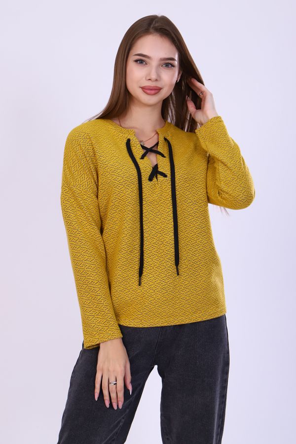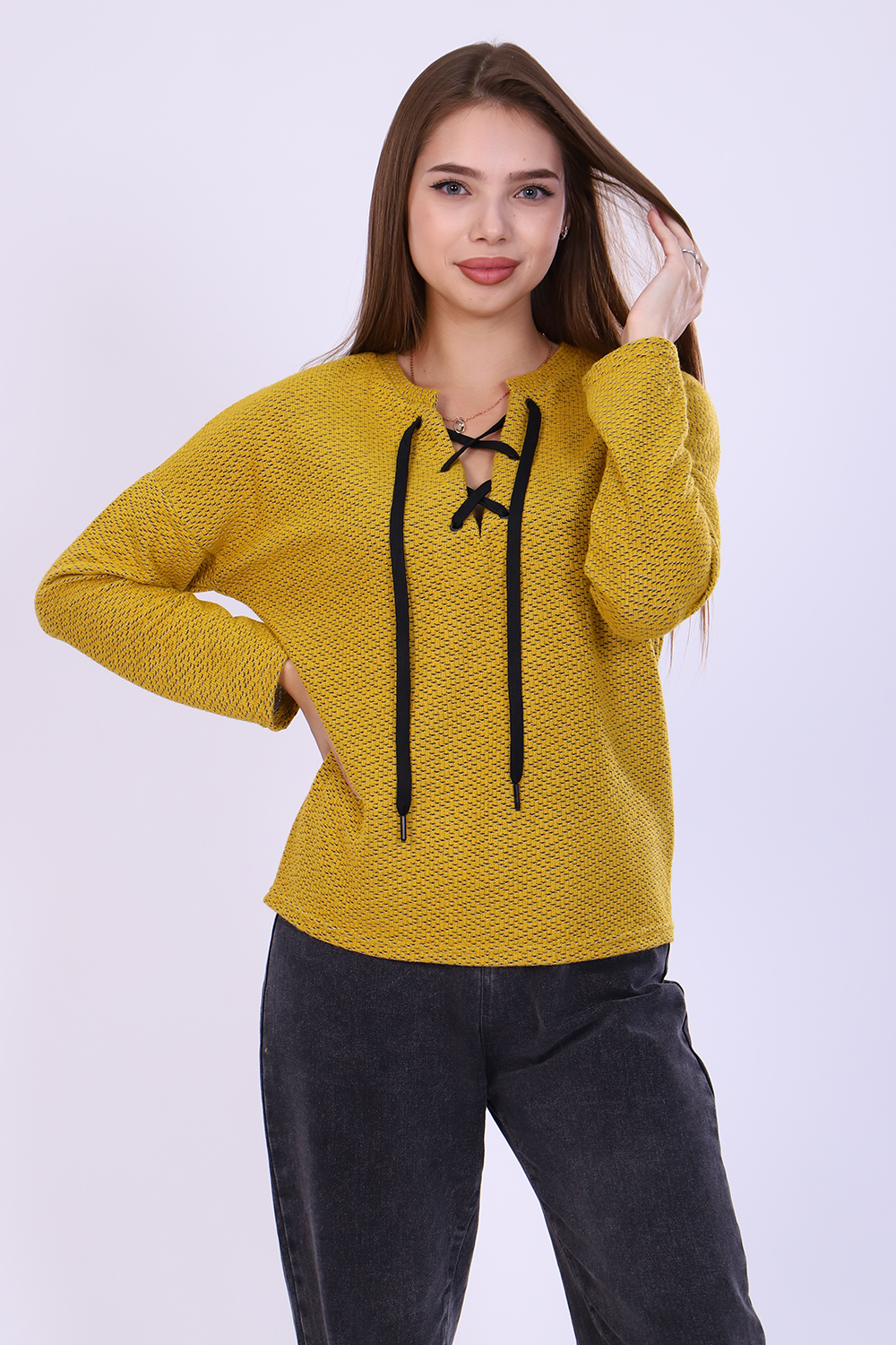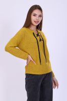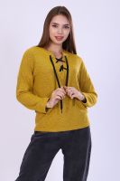 Джемпер женский из мягкого вязаного трикотажа. V-образный вырез горловины декорирован люверсами и шнуром, спущенная пройма, длинный рукав. Джемпер комфортный, универсальный, создаст неповторимый стиль для модницы любой фигуры и возраста. С наступлением холодов эта вещь становится основой всего базового гардероба, отличным офисным вариантом.