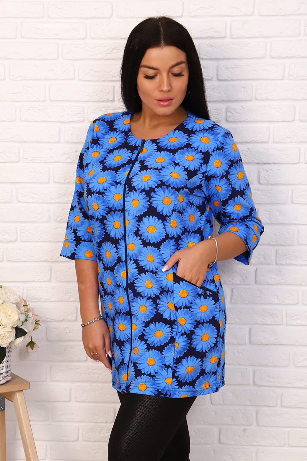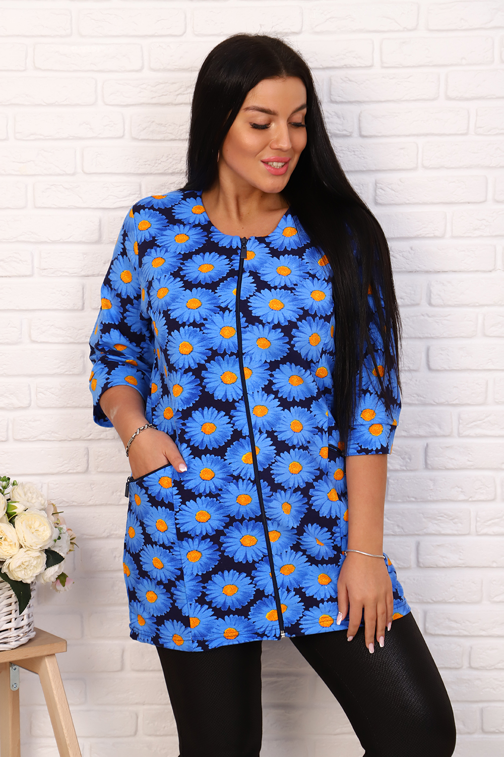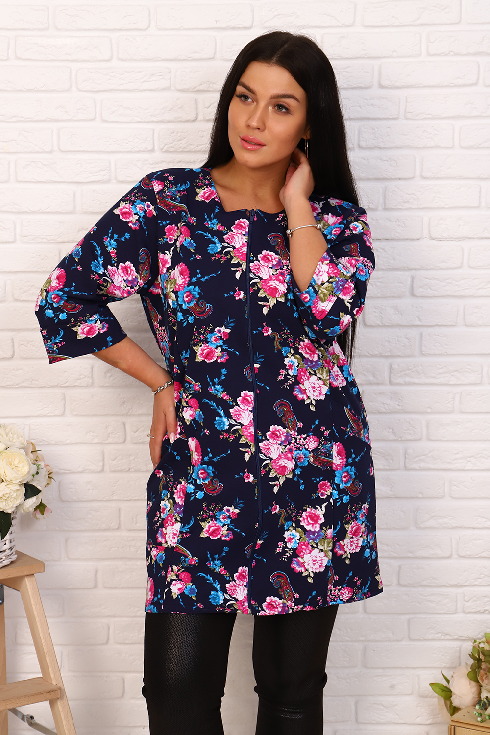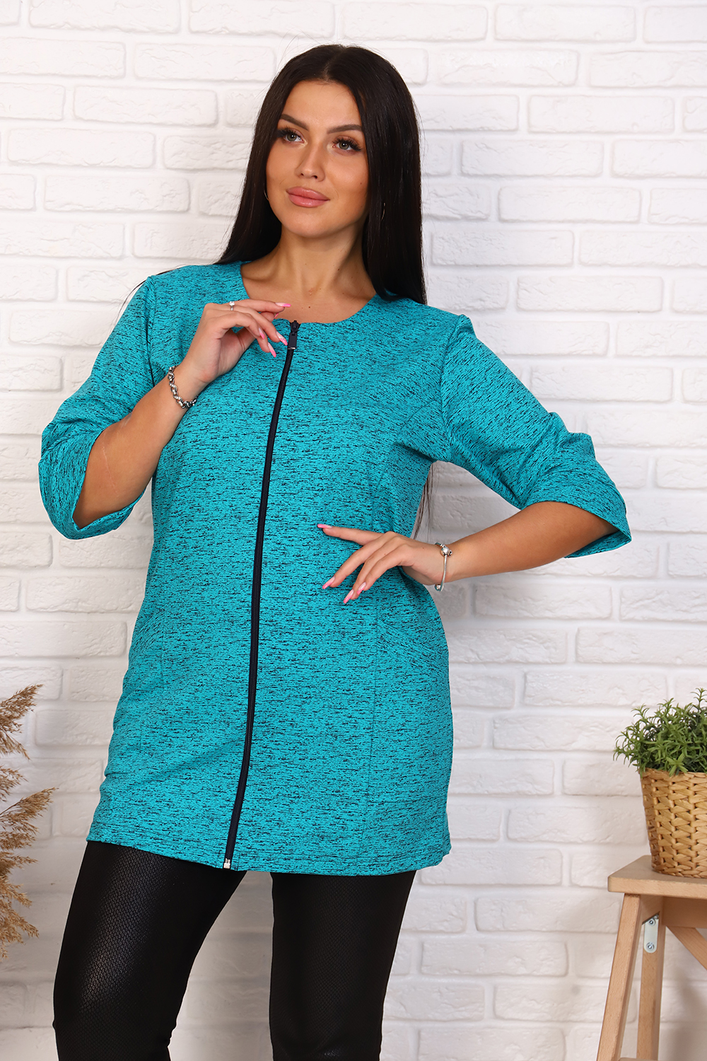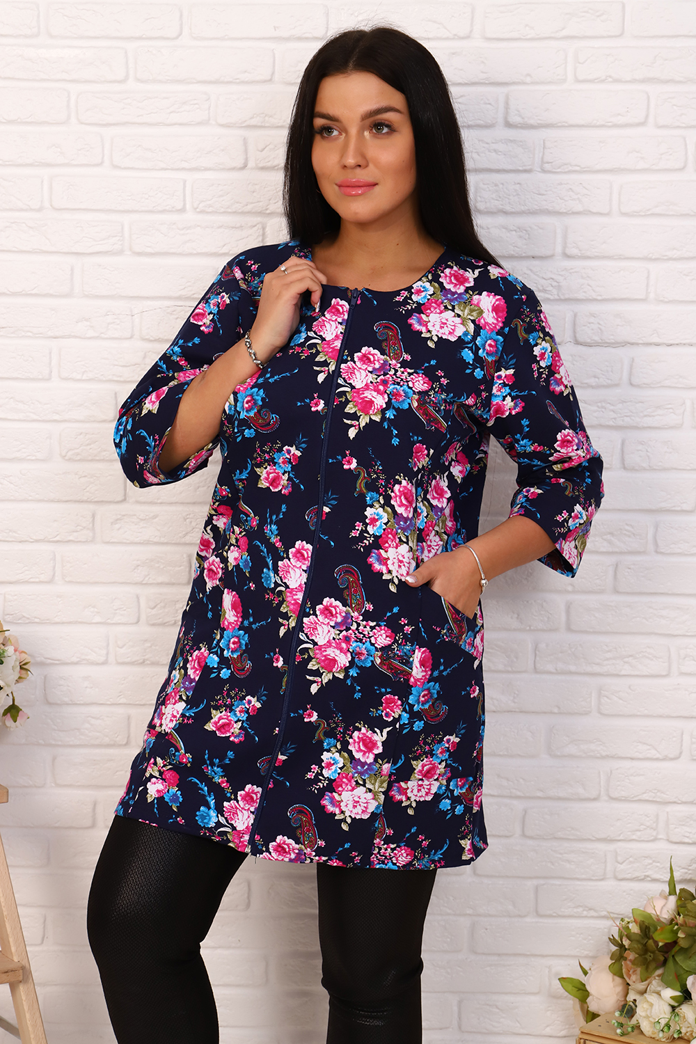 Элегантный френч, можно носить как с юбкой, так и с брюками или джинсами. Круглая горловина, на молнии, с рельефами и карманами, рукав 3/4, длина ниже бедра. Цвета в ассортименте, без подбора