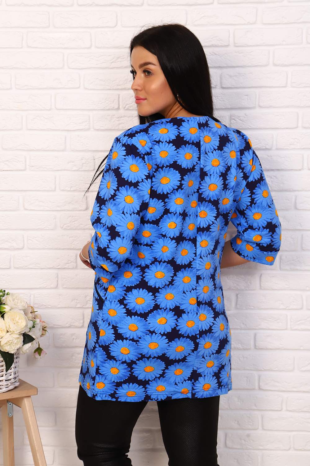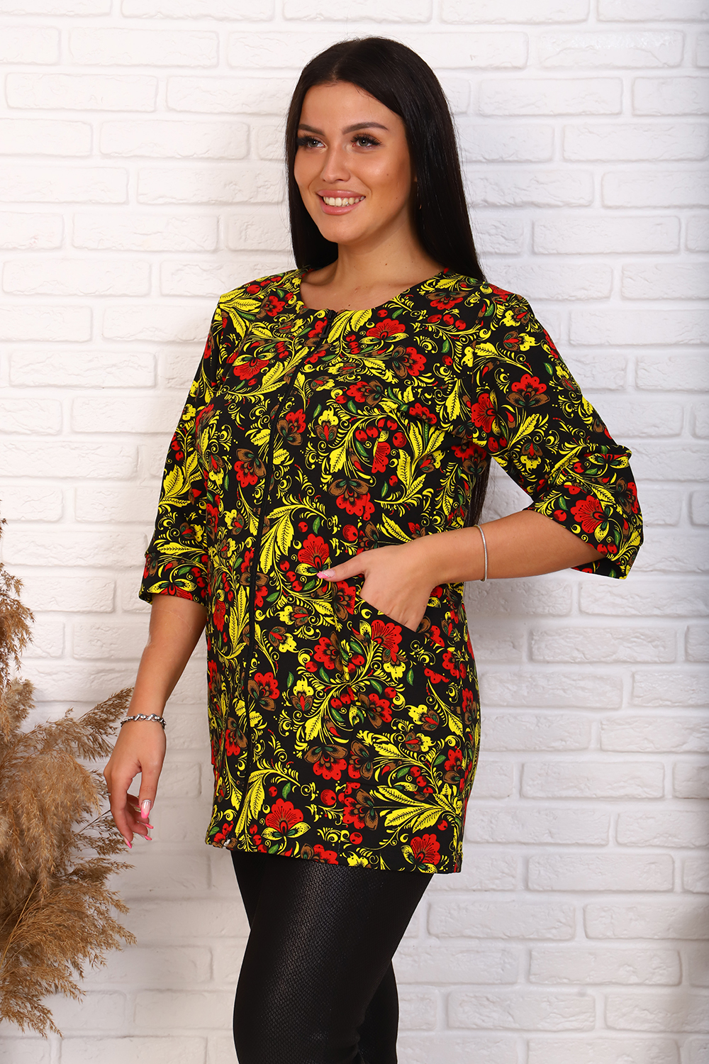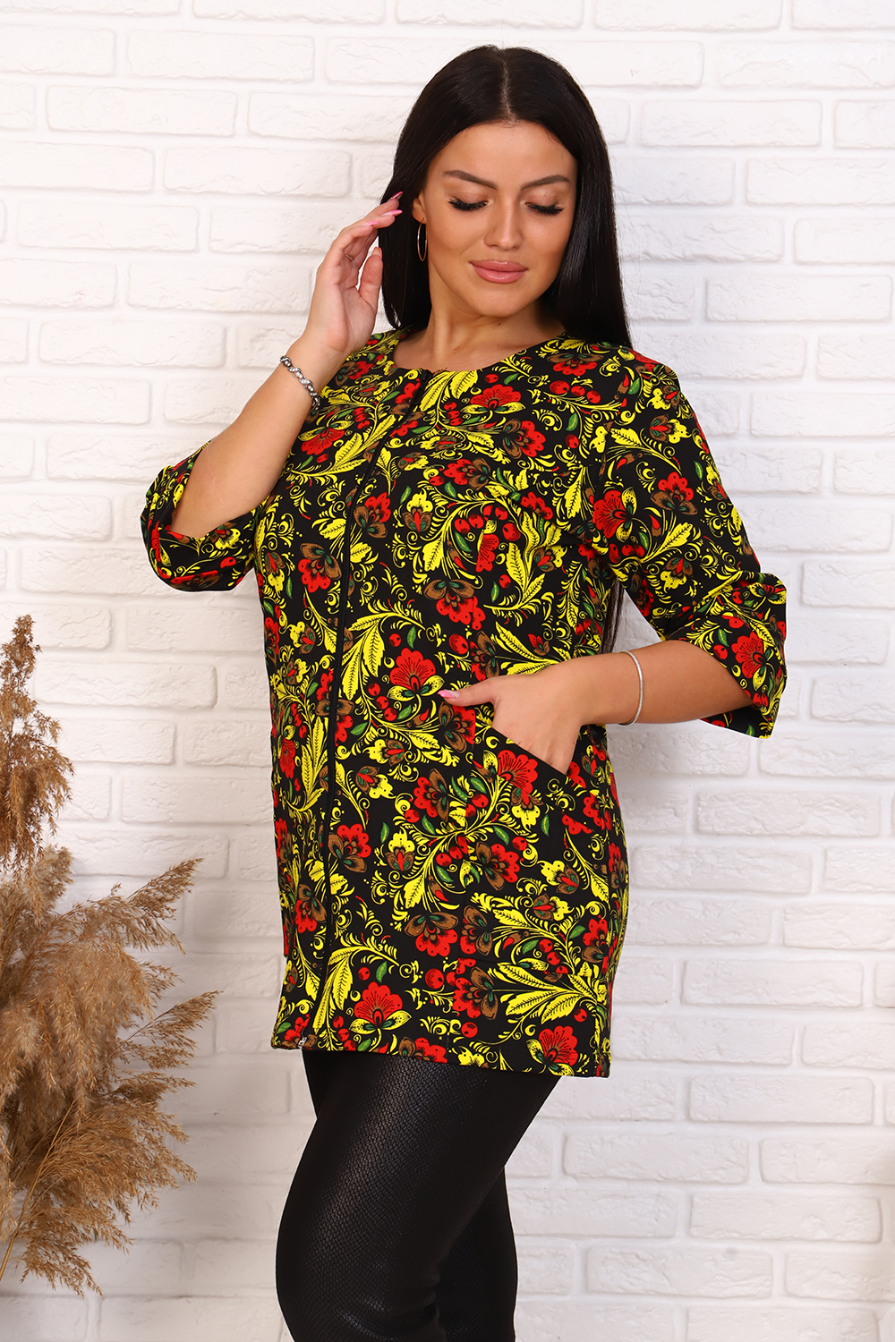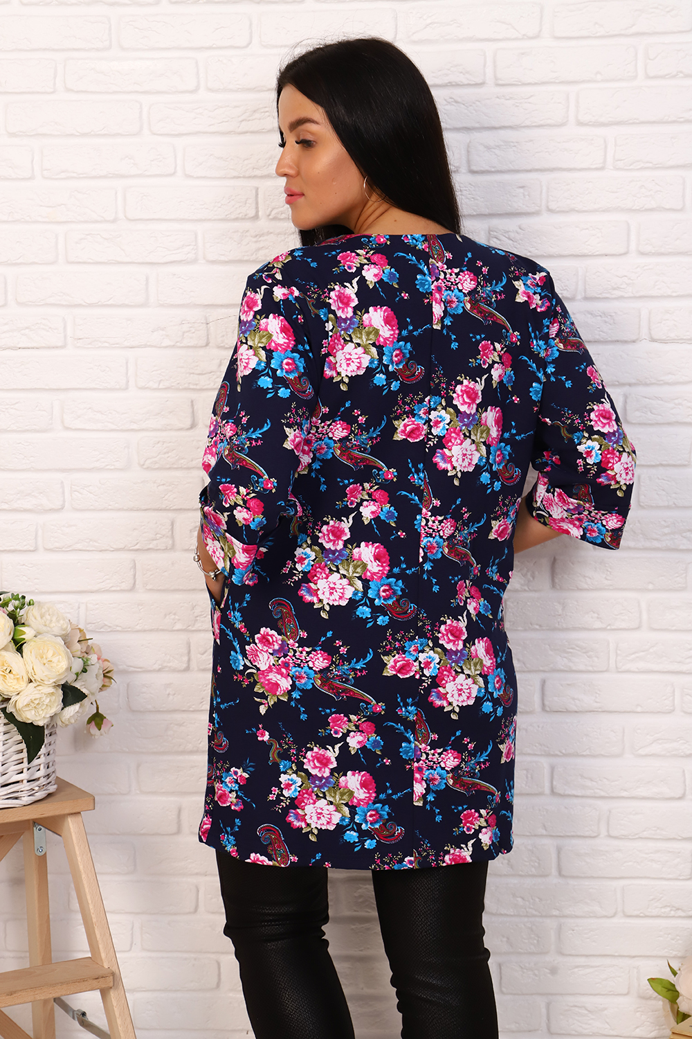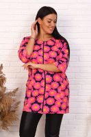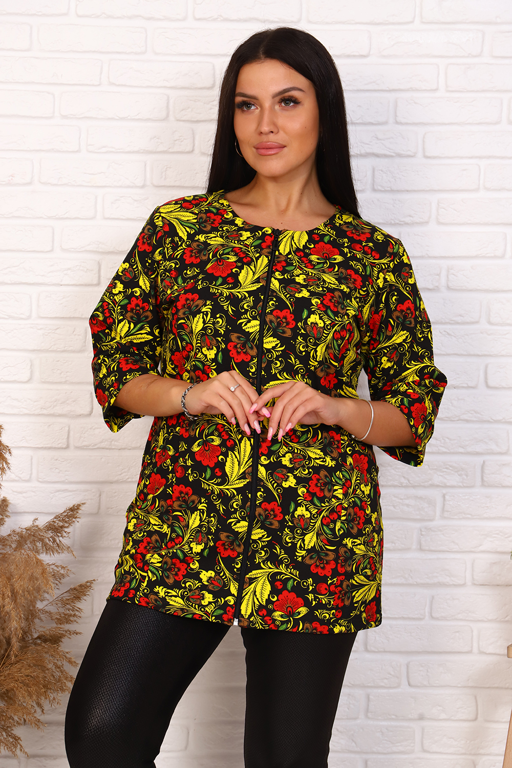 Элегантный френч, можно носить как с юбкой, так и с брюками или джинсами. Круглая горловина, на молнии, с рельефами и карманами, рукав 3/4, длина ниже бедра. Цвета в ассортименте, без подбора