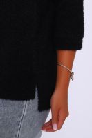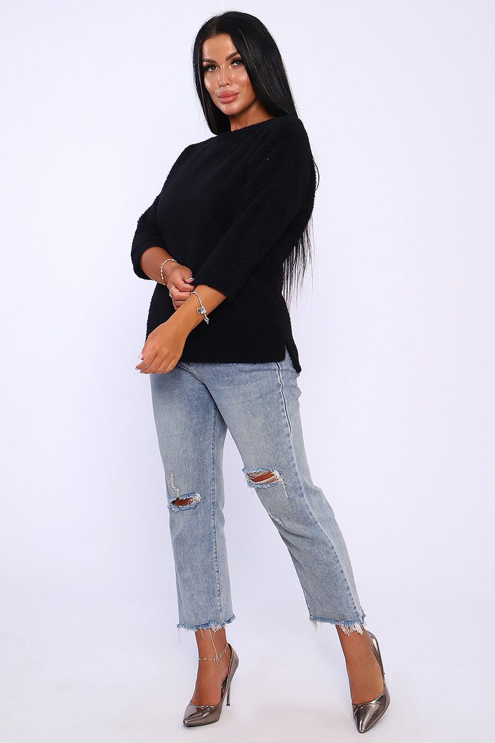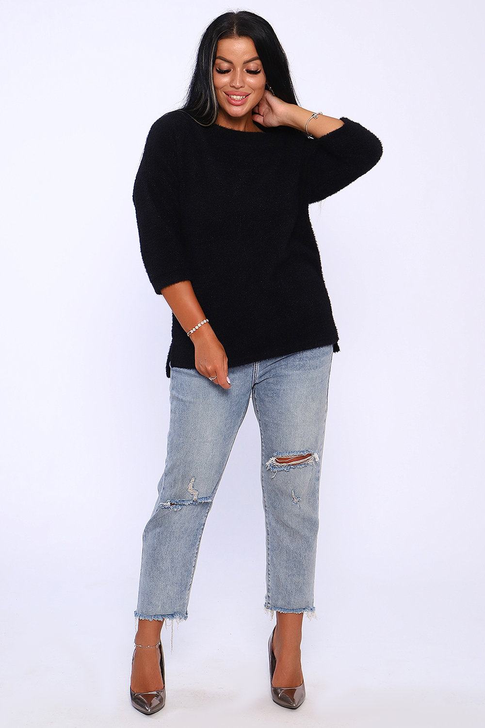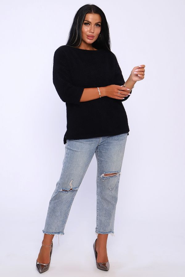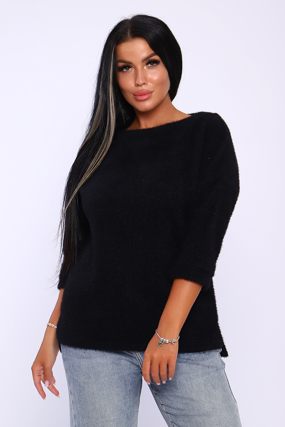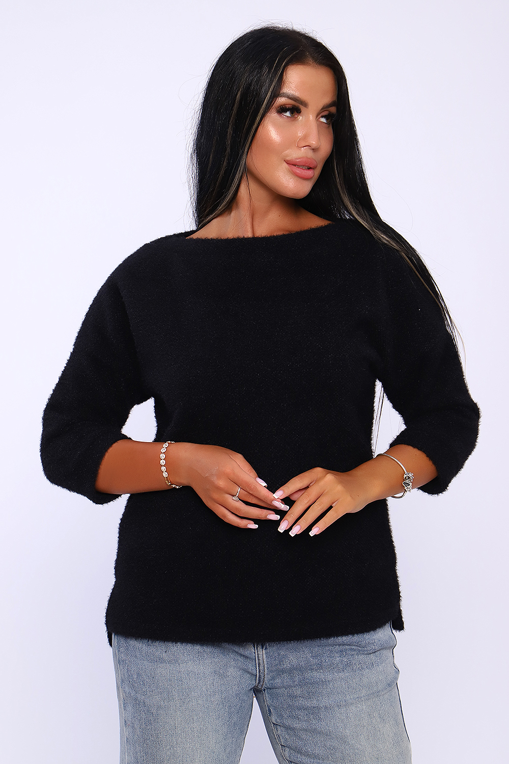 Джемпер женский из мягкого, приятного к телу вязаного трикотажа. Горловина в виде лодочки обработана обтачкой , спущенная пройма , рукав на манжете длиной 3/4. Низ спинки удлинён, по бокам небольшие разрезы. Оригинальная вязка делает джемпер незаменимой вещью в гардеробе женщины, предпочитающей комфорт и удобство. Благодаря мягкому переплетению нитей толстовку можно одеть как самостоятельно, так и под верхнюю одежду. Универсальный крой джемпера позволит вписать его как в офисный гардероб, так и в повседневный образ. Современная палитра цветов и широкий размерный ряд позволит подобрать модель под любое ваше настроение. Длина рукава в таблице измерений указана от начала горловины.