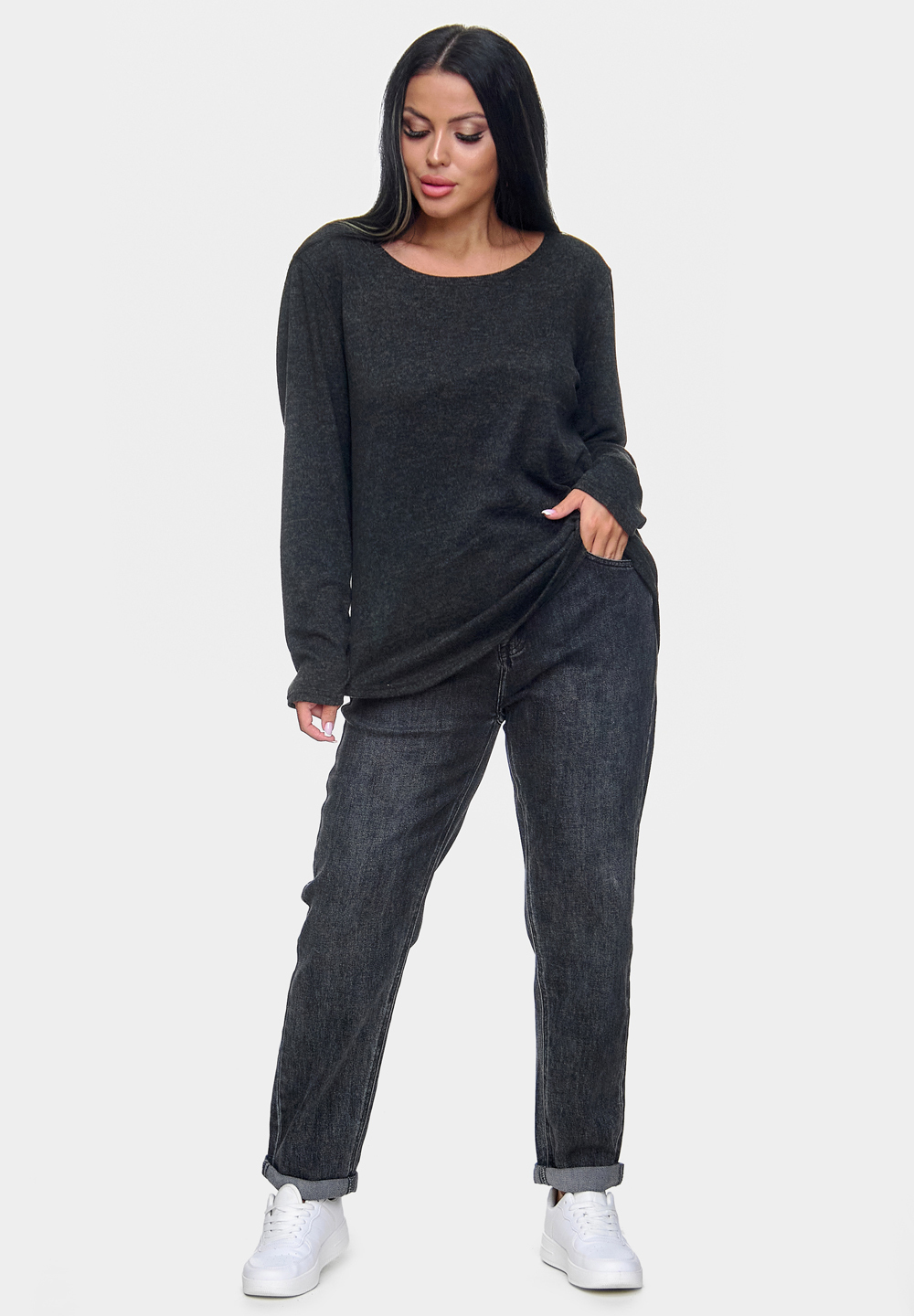 Мягкий джемпер из ангоры софт с округлым вырезом и свободным кроем. Удобная и практичная модель.