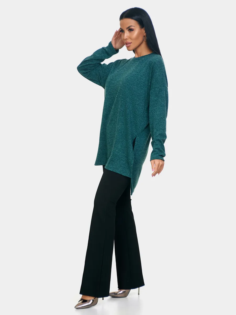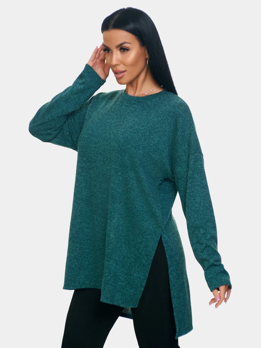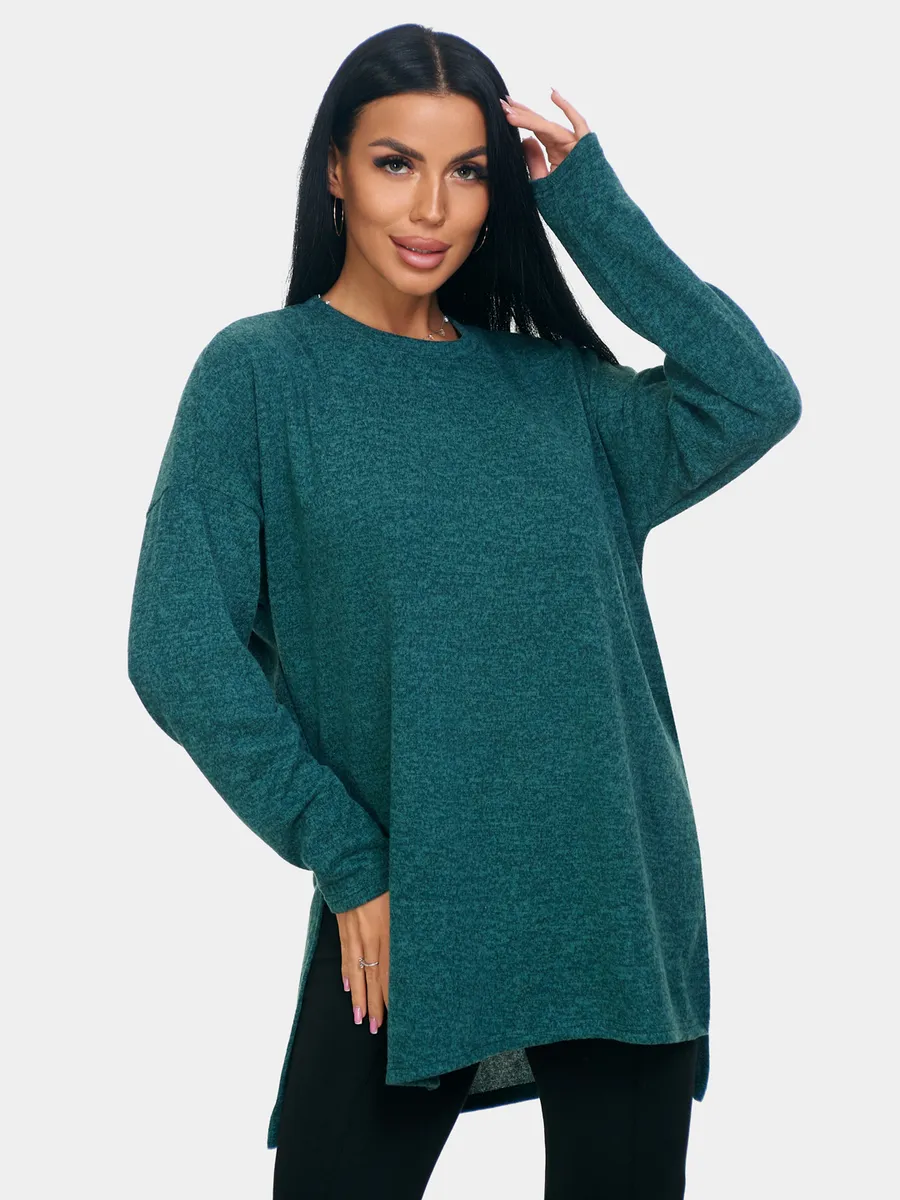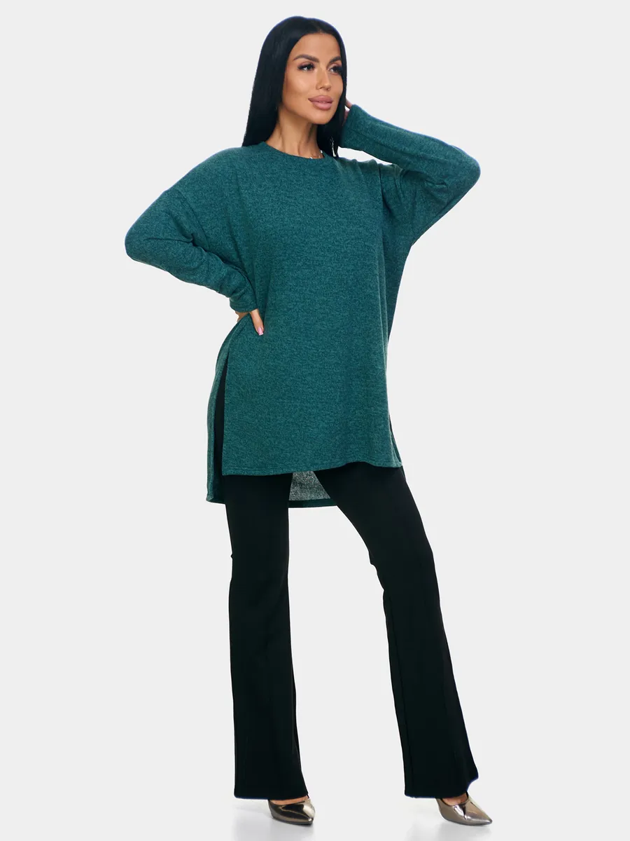 Длинный джемпер из ангоры софт обволакивает мягкостью, нежностью и теплом. Трикотажный пуловер меланжевый с длинными рукавами и с округлым вырезом горловины. Свободный крой и разрезы по бокам идеальны для любого типа фигуры. Трикотажный джемпер отлично подойдет для беременных и для женщин plus size.