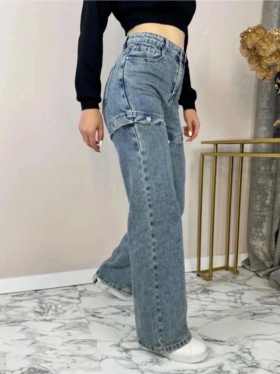 Джинсы-шорты выполнены из качественного материала, что обеспечивает их долговечность и износостойкость. Модель с широкими ногами и высокой посадкой подчеркнет вашу фигуру, делая вас еще более привлекательной. Удобные накладные карманы добавят практичности к вашей повседневной одежде. Благодаря отсутствию утеплителя, эти джинсы идеально подходят для всего года, а пуговицы и молния обеспечивают легкость в одевании и снимании. Декоративные заклепки добавляют образу индивидуальности и стиля. Выбирайте эти джинсы для создания уникального и комфортного образа в любой ситуации. отстегнув штанины, получаете шикарные шорты. 25 - 40 26 - 42 27 - 44 28 - 46 29 - 48 30 - 50