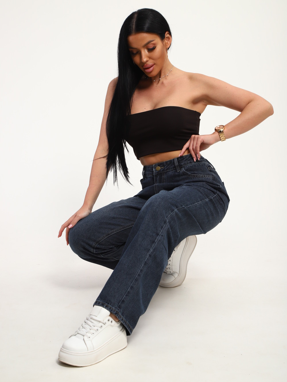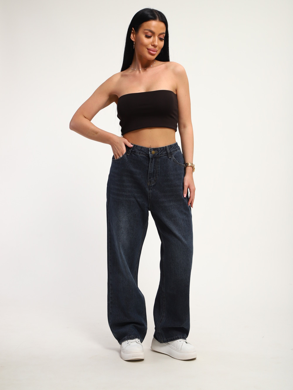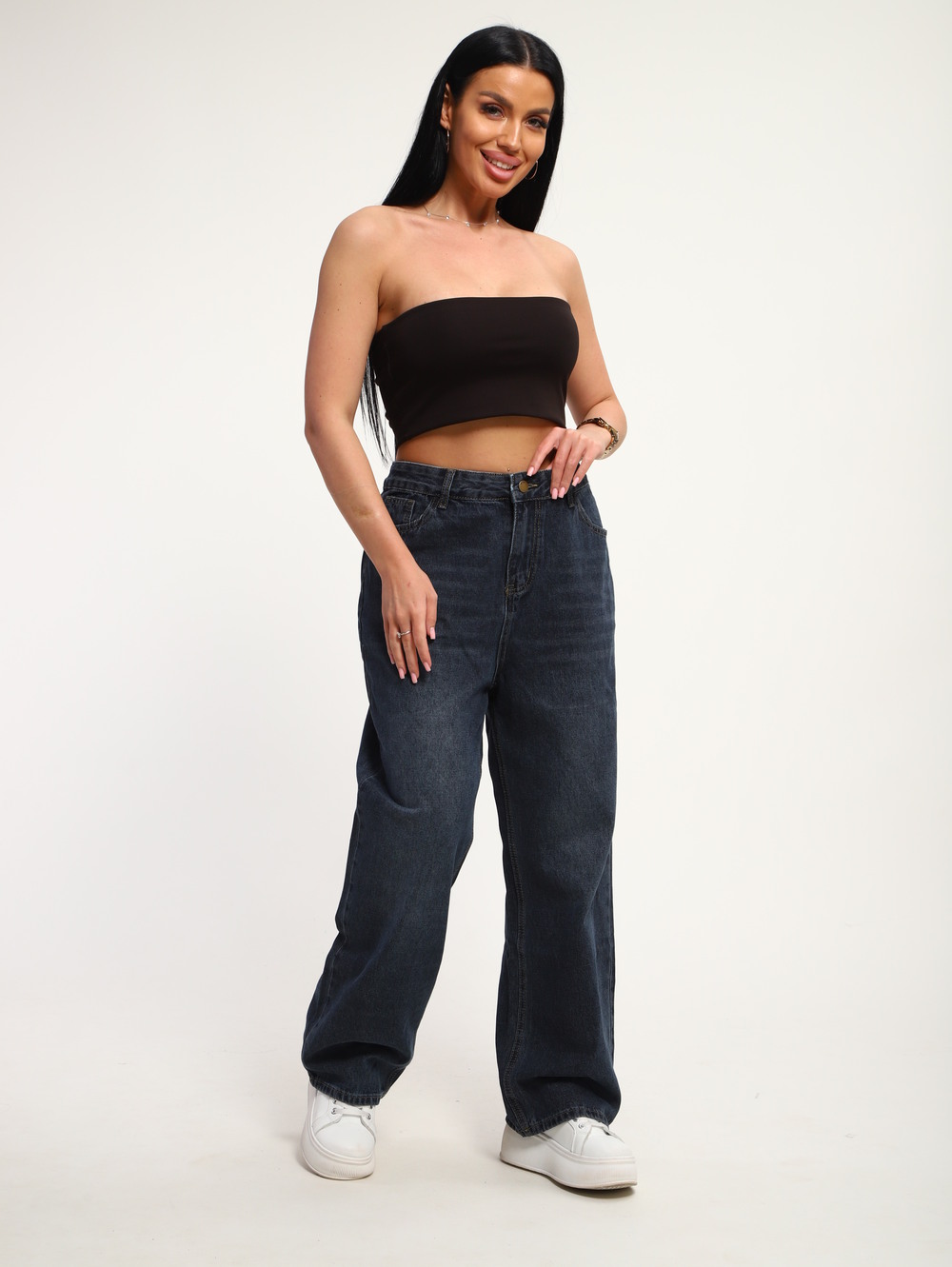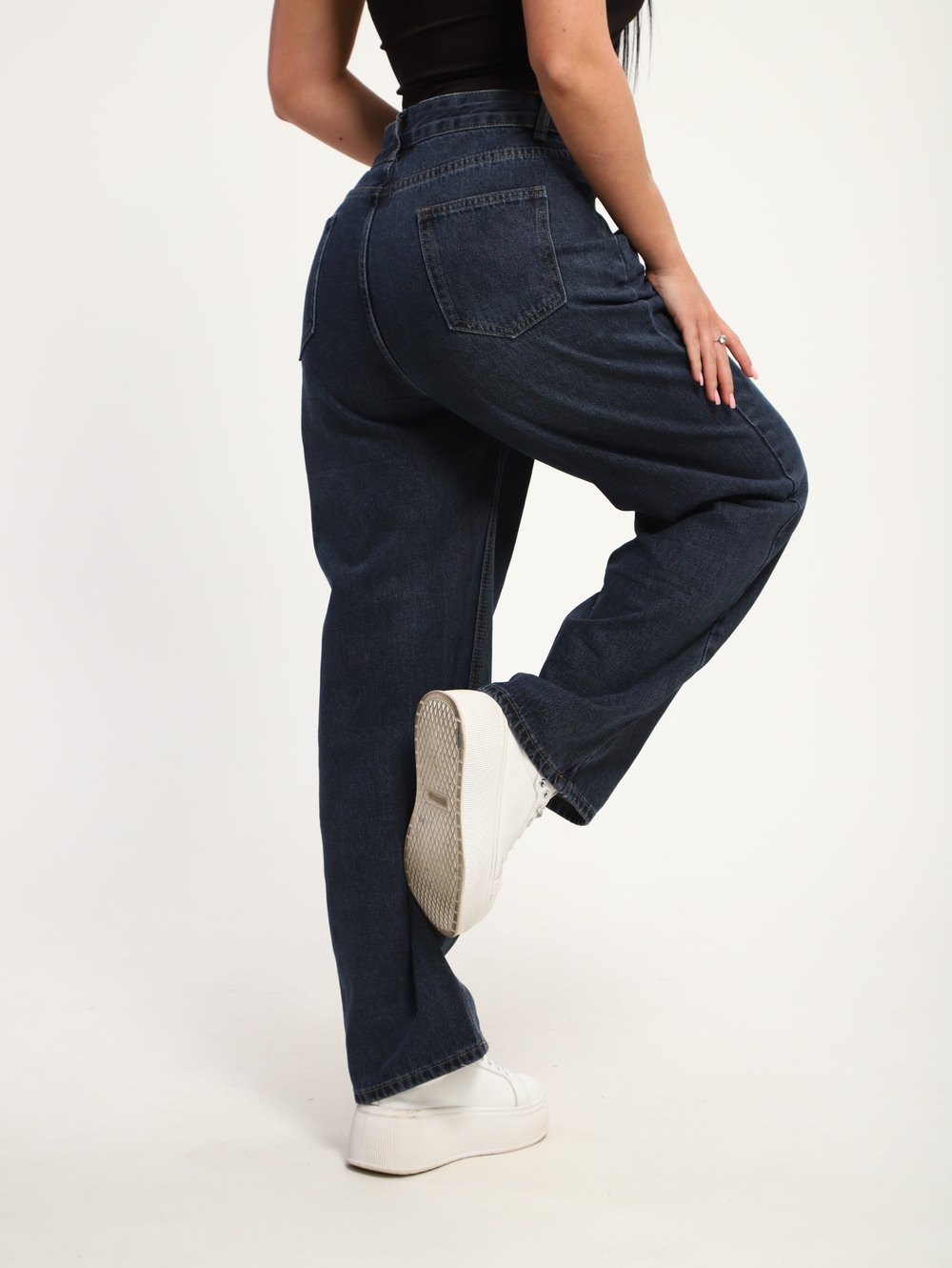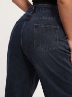 Стильные женские джинсы свободного кроя из плотного денима темно-синего цвета. Модель с высокой посадкой и классической застежкой на пуговицу и молнию обеспечивает комфортную посадку и подчеркивает талию. Прямой, слегка расширяющийся книзу силуэт идеально подойдет для создания современных городских образов. Джинсы легко комбинируются с кедами, футболками и топами для повседневного стиля.