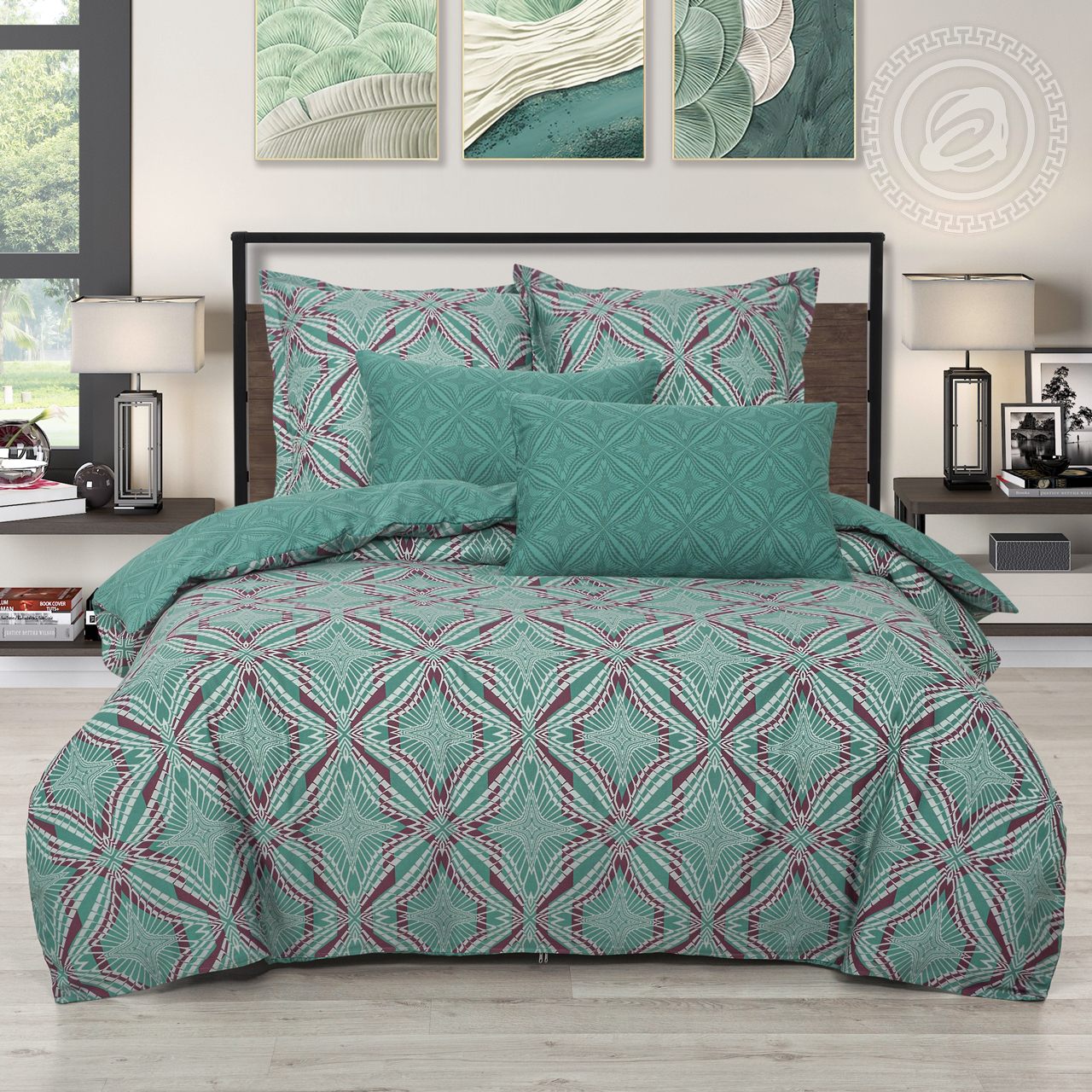 На комплекте «Джон», выполненном из мягкой и гладкой премиальной ткани «сатин», представлен геометрический рисунок в виде ромбов. Общая композиция выполнена в оттенках зеленого цвета и дополнена акцентными линиями. Авторский рисунок завораживает и добавляет в окружение утонченные и элегантные нотки. Качественное постельное белье из сатина чудесно подойдет для любого интерьерного стиля и придаст спальне уют.
