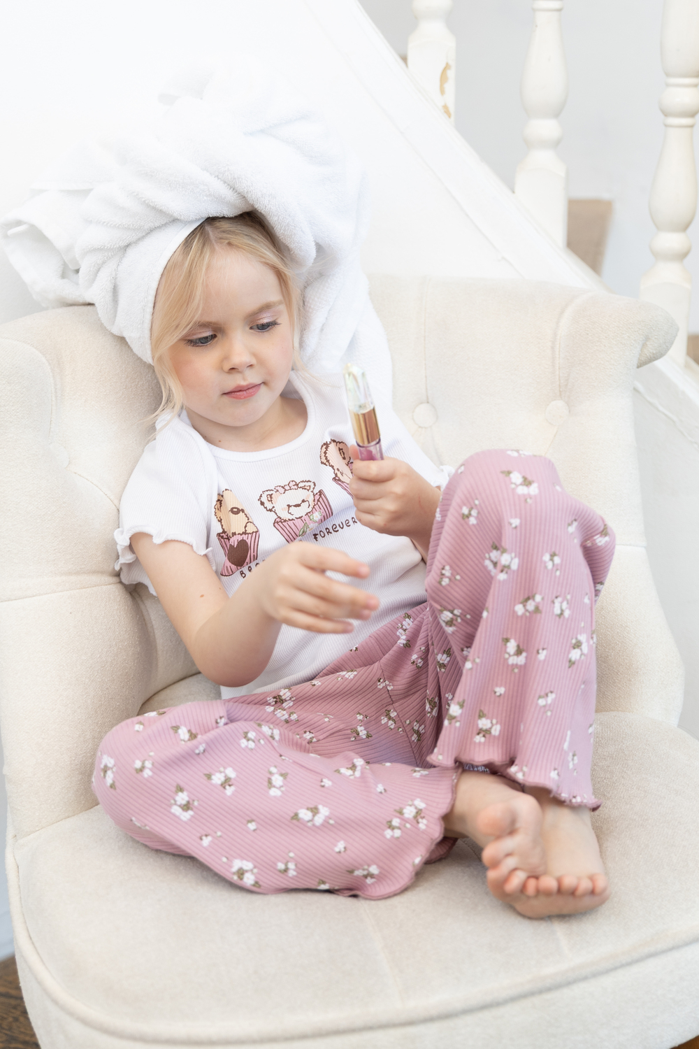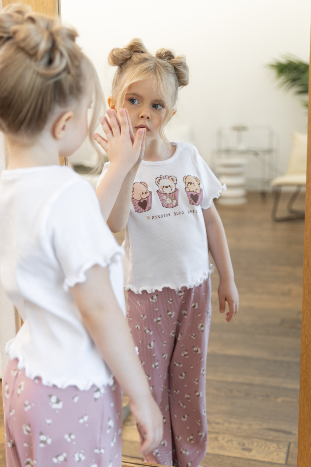 Пижама «Флаффи» создана из мягкого хлопкового трикотажа: белая футболка с принтом мишек и розовые брюки в мелкий цветочек. Материал приятен к телу и не раздражает кожу. Свободный крой и эластичный пояс обеспечивают комфорт и уют во сне.