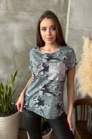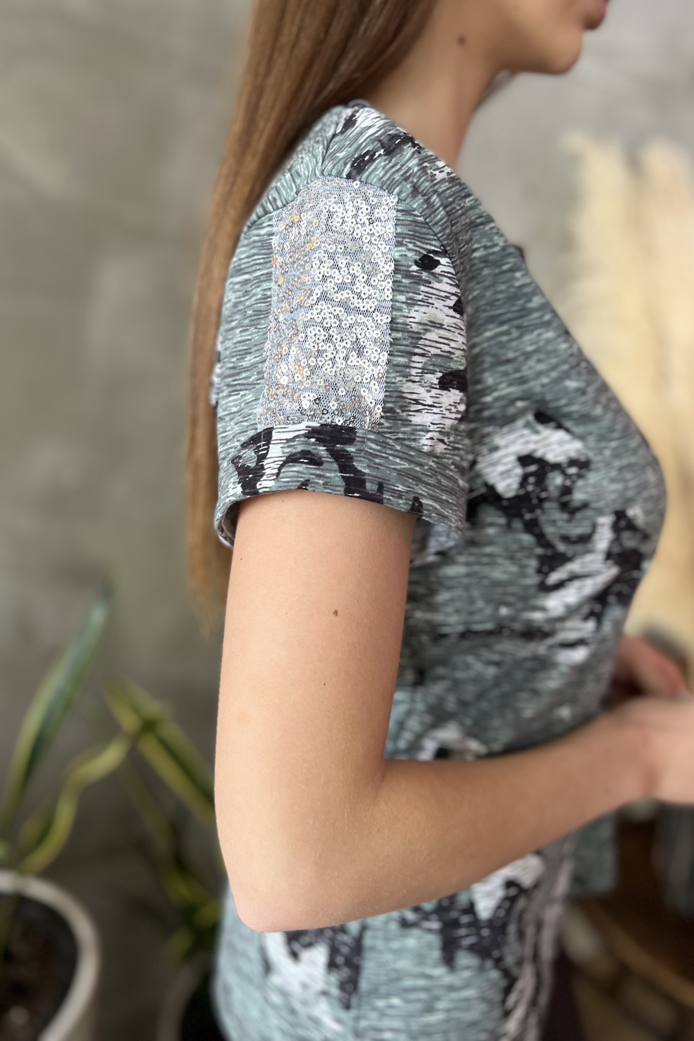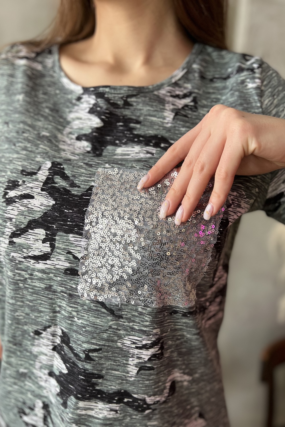 Футболка полуприлегающего силуэта, с округлой горловиной, длиной до середины бедра. Рукав втачной, короткий, с манжетом и вставкой с пайетками. На полочке расположен декоративный карман с пайетками