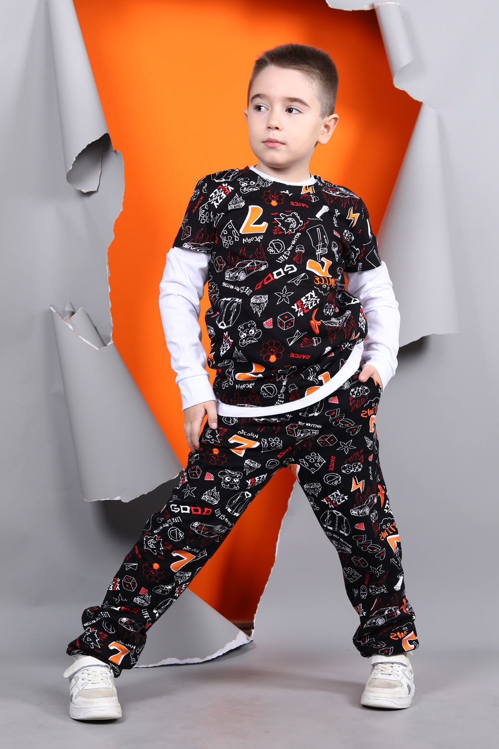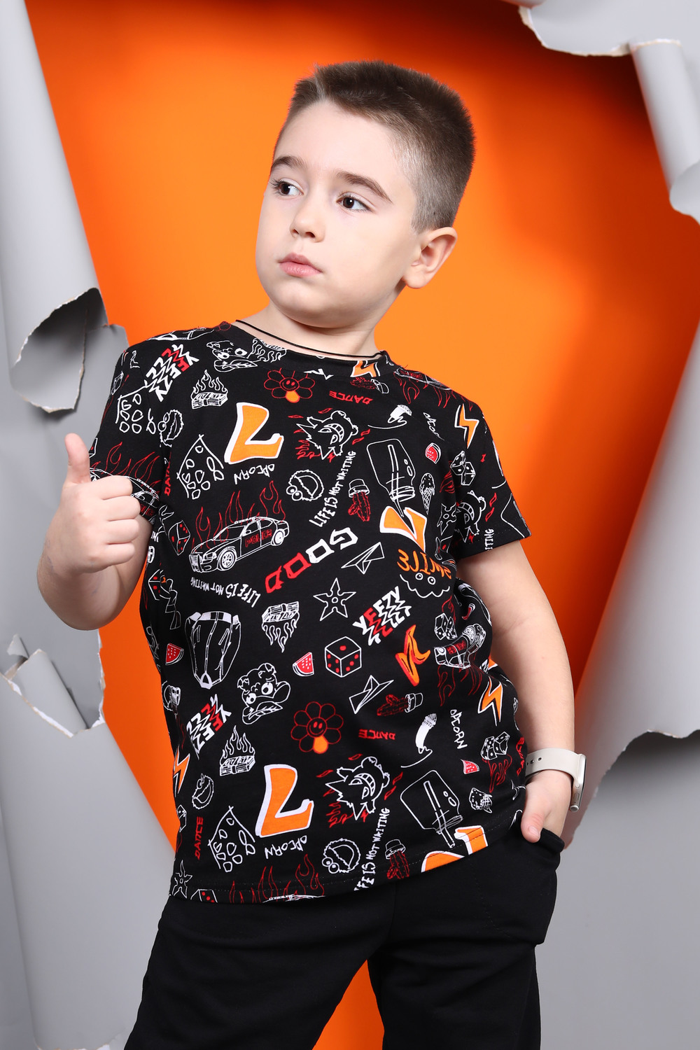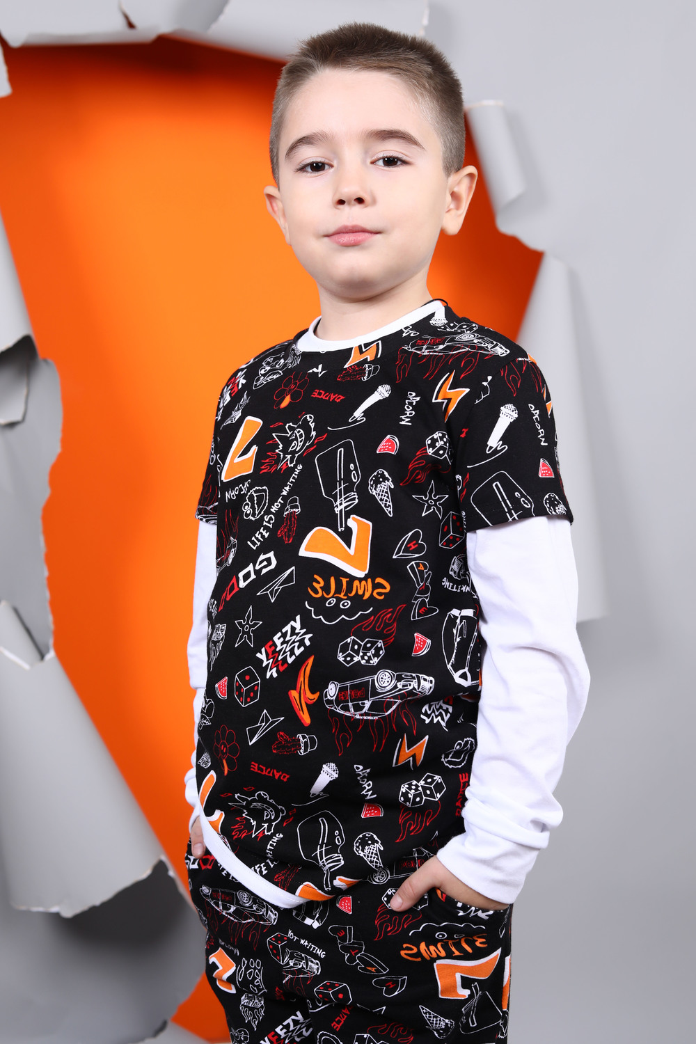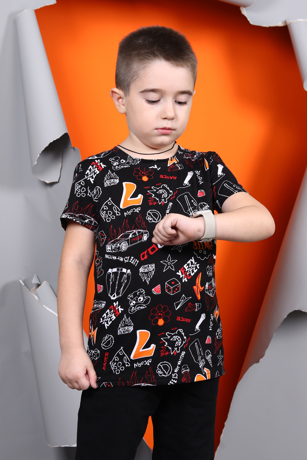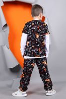 Хлопковая футболка для мальчика с короткими рукавами. Сшита из лёгкого трикотажа кулирка и украшена принтом. Рукава и низ изделия обработаны плоскими швами. На задней части горловины присутствует усиление.