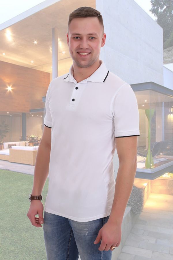 Футболка-поло прямого силуэта для повседневной носки. Отделка - планка с пуговицами, воротник и манжеты вязаные