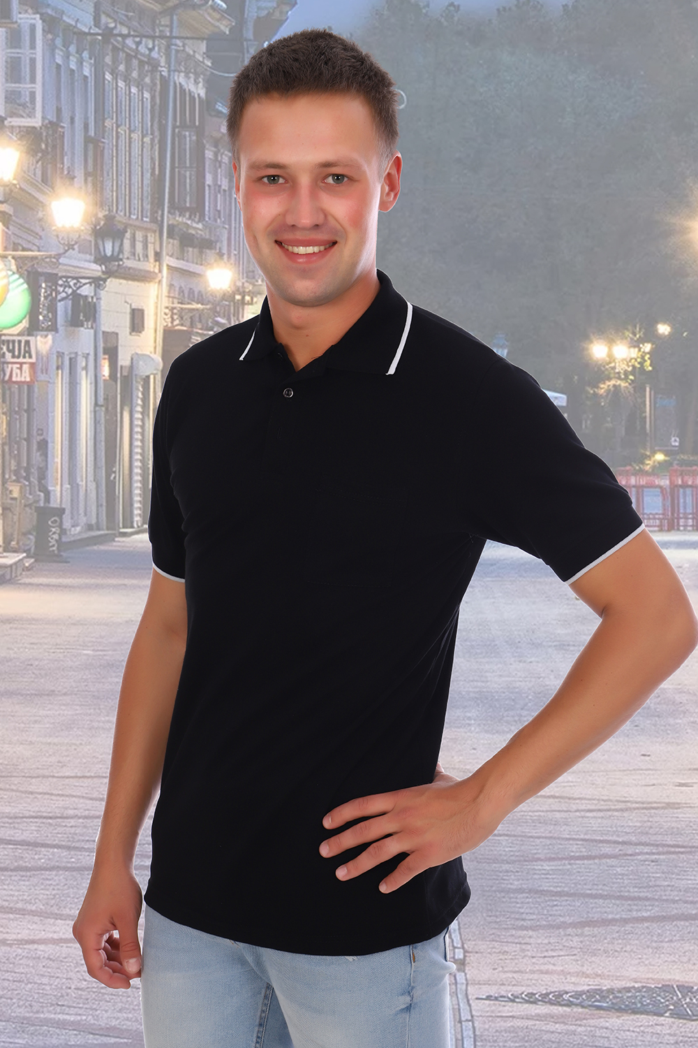 Футболка поло мужская, ткань пике-лакост, плотность 180 г/м3. На полочке планка с тремя пуговицами. Воротник и манжеты вязаные с отделкой по краю контрасной полосой в 0,5 см. Нагрудный карман. Предназначена для повседневной носки.