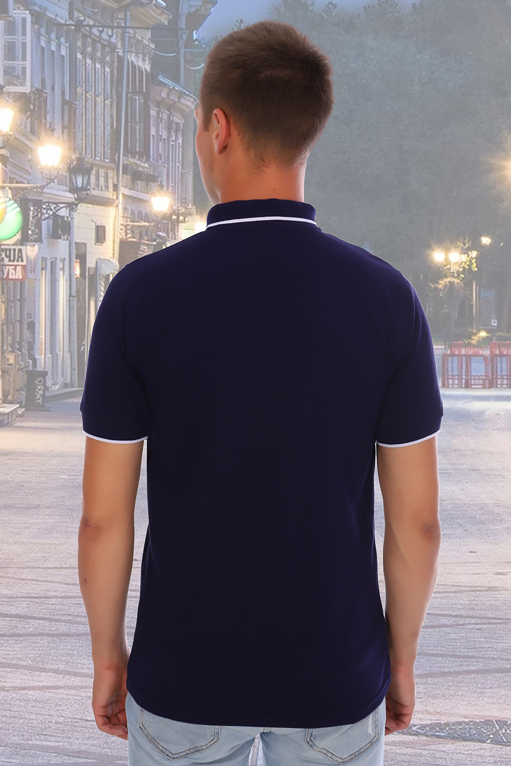 Футболка поло мужская, ткань пике-лакост, плотность 180 г/м3. На полочке планка с тремя пуговицами. Воротник и манжеты вязаные с отделкой по краю контрасной полосой в 0,5 см. Нагрудный карман. Предназначена для повседневной носки.