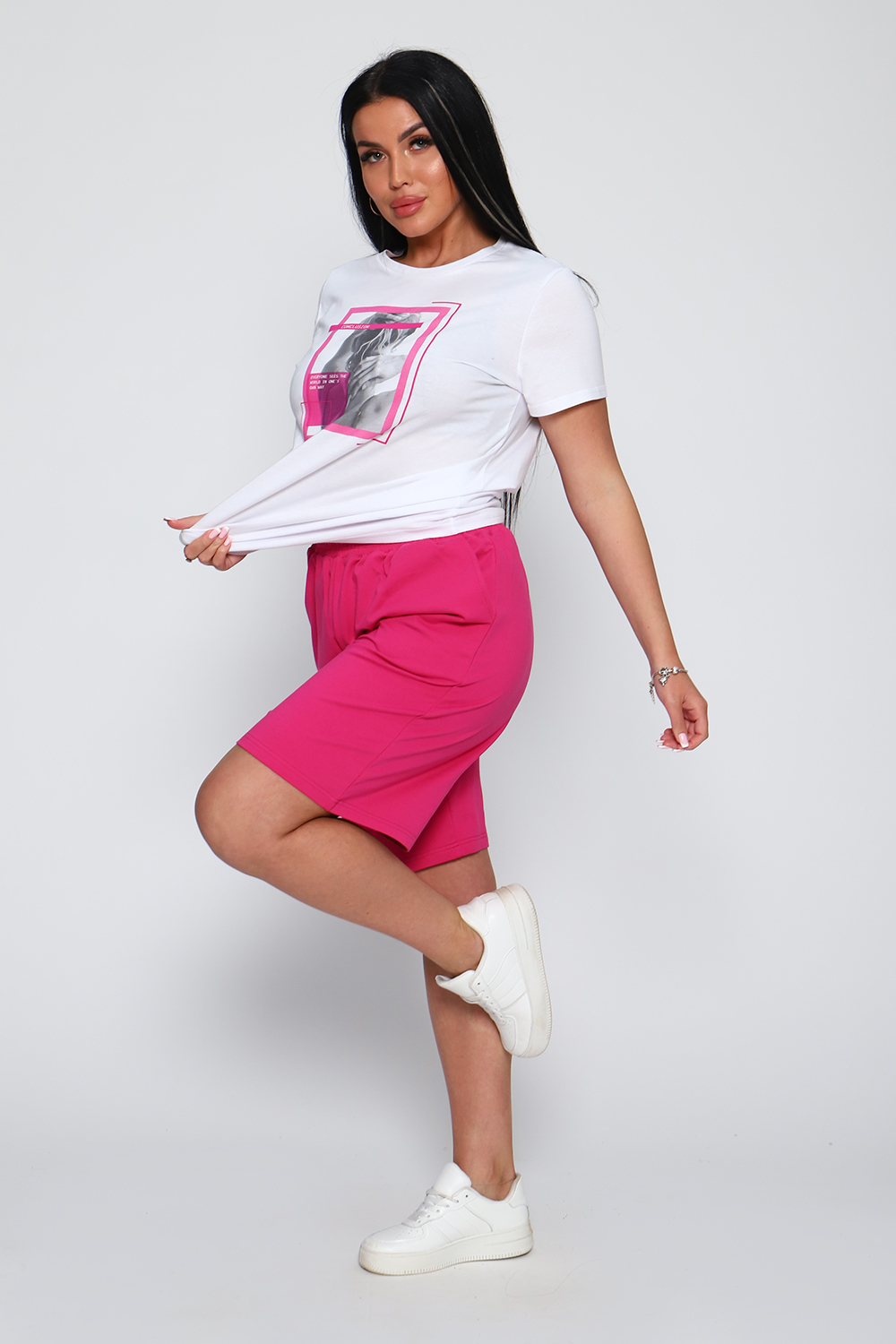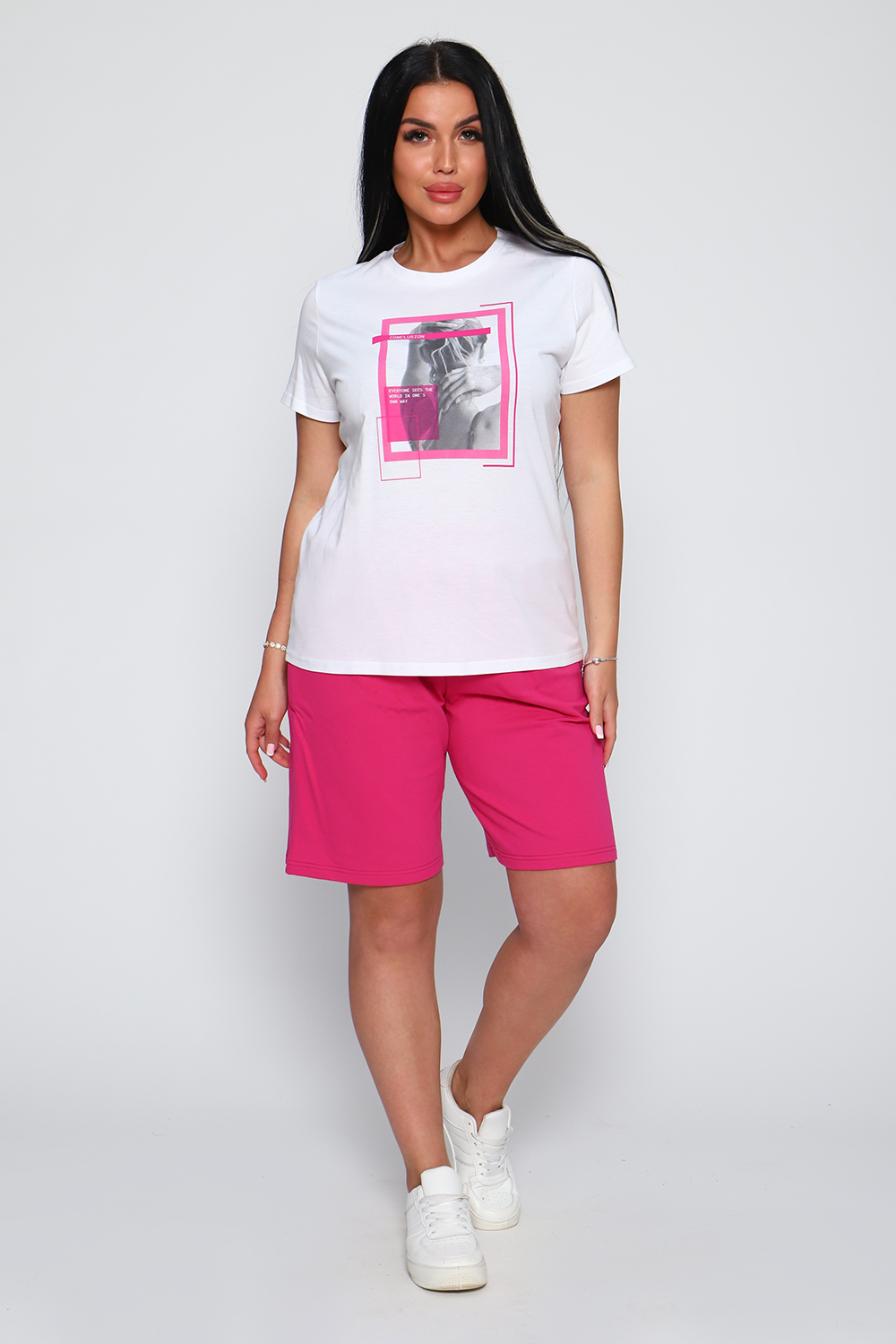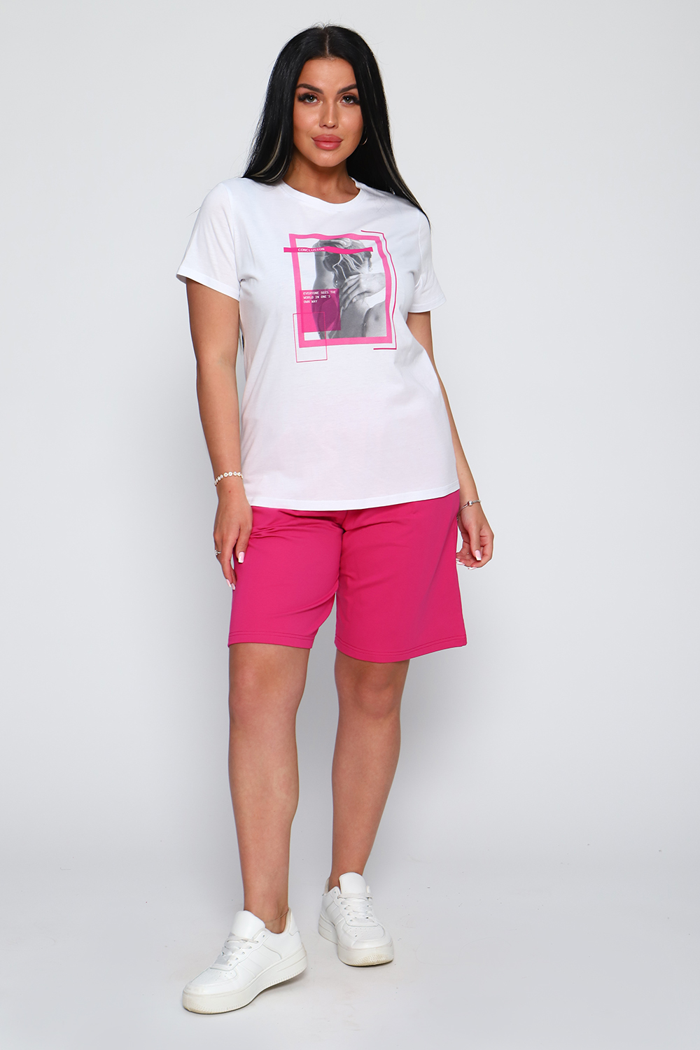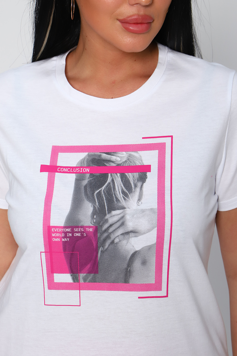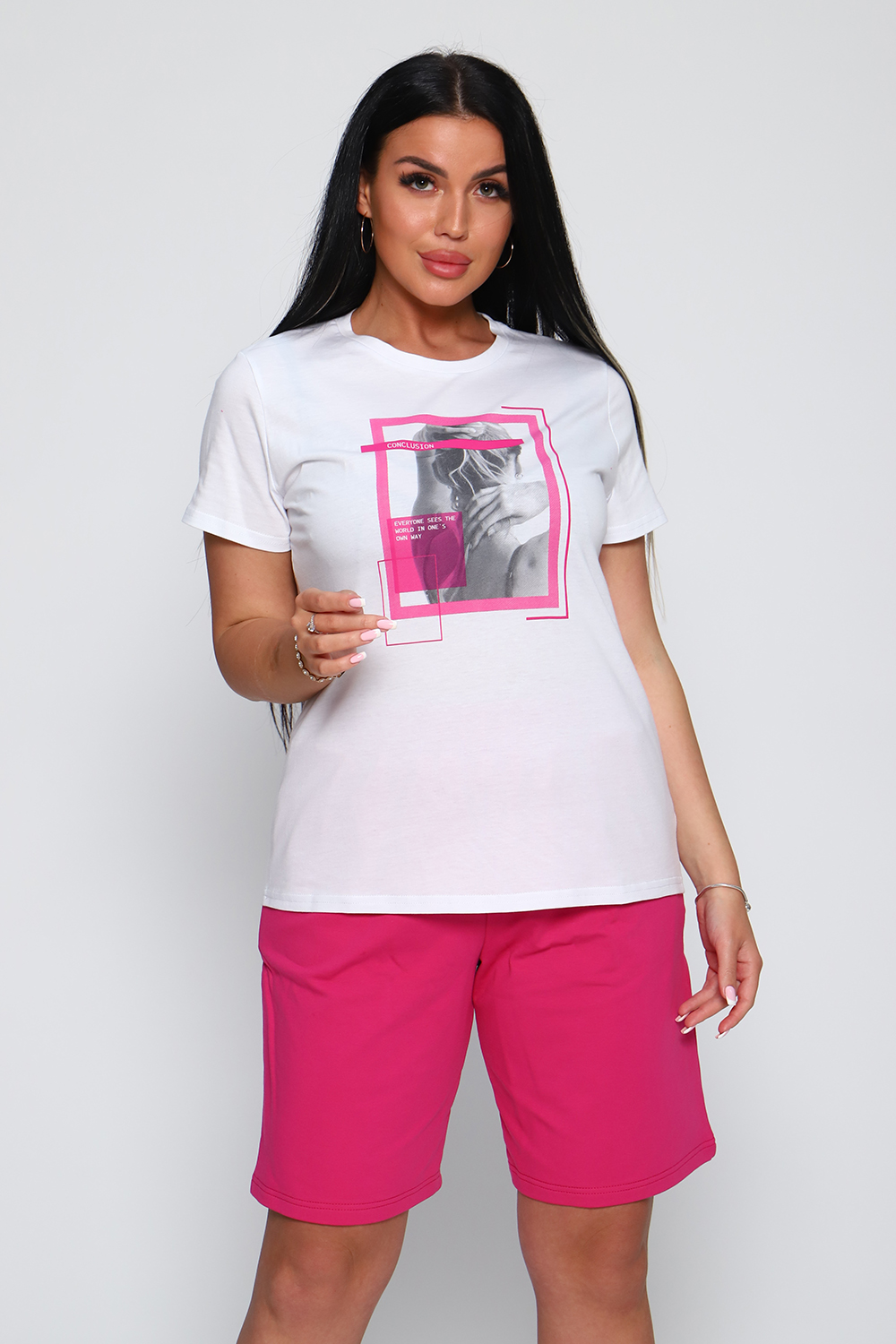 Футболка женская из кулирной глади. На полочке расположена печать. Рукав втачной.
