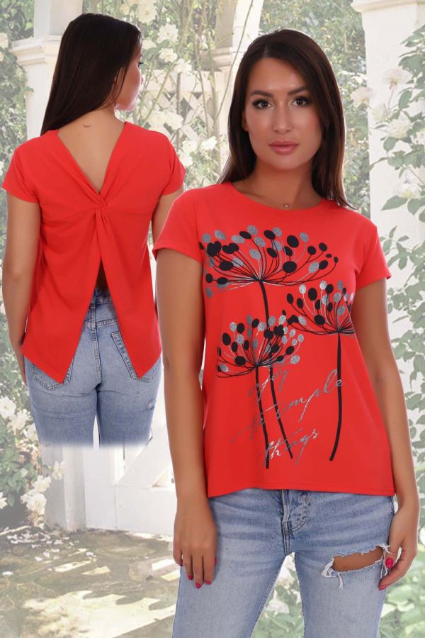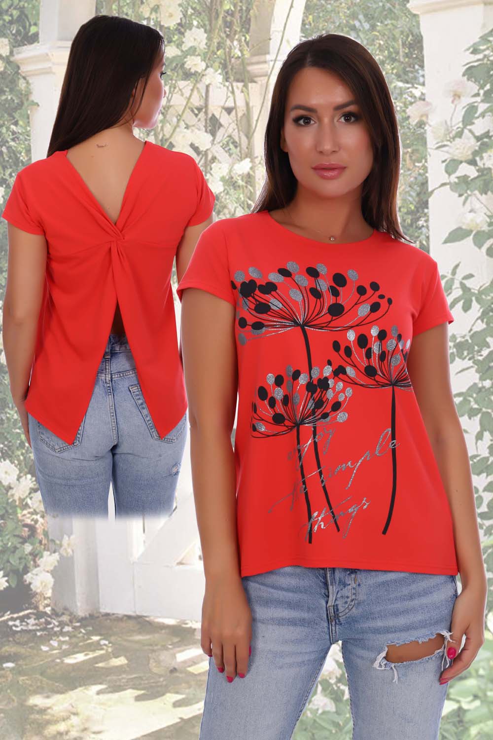 Молодежная футболка с мерцающим принтом из мягкого, эластичного трикотажа, качества ПЕНЬЕ. Круглая горловина обработана обтачкой, короткий рукав. Спинка распашная декорирована драпировкой с необработанными краями, в виде "узла", что придаёт изделию некую изюминку.