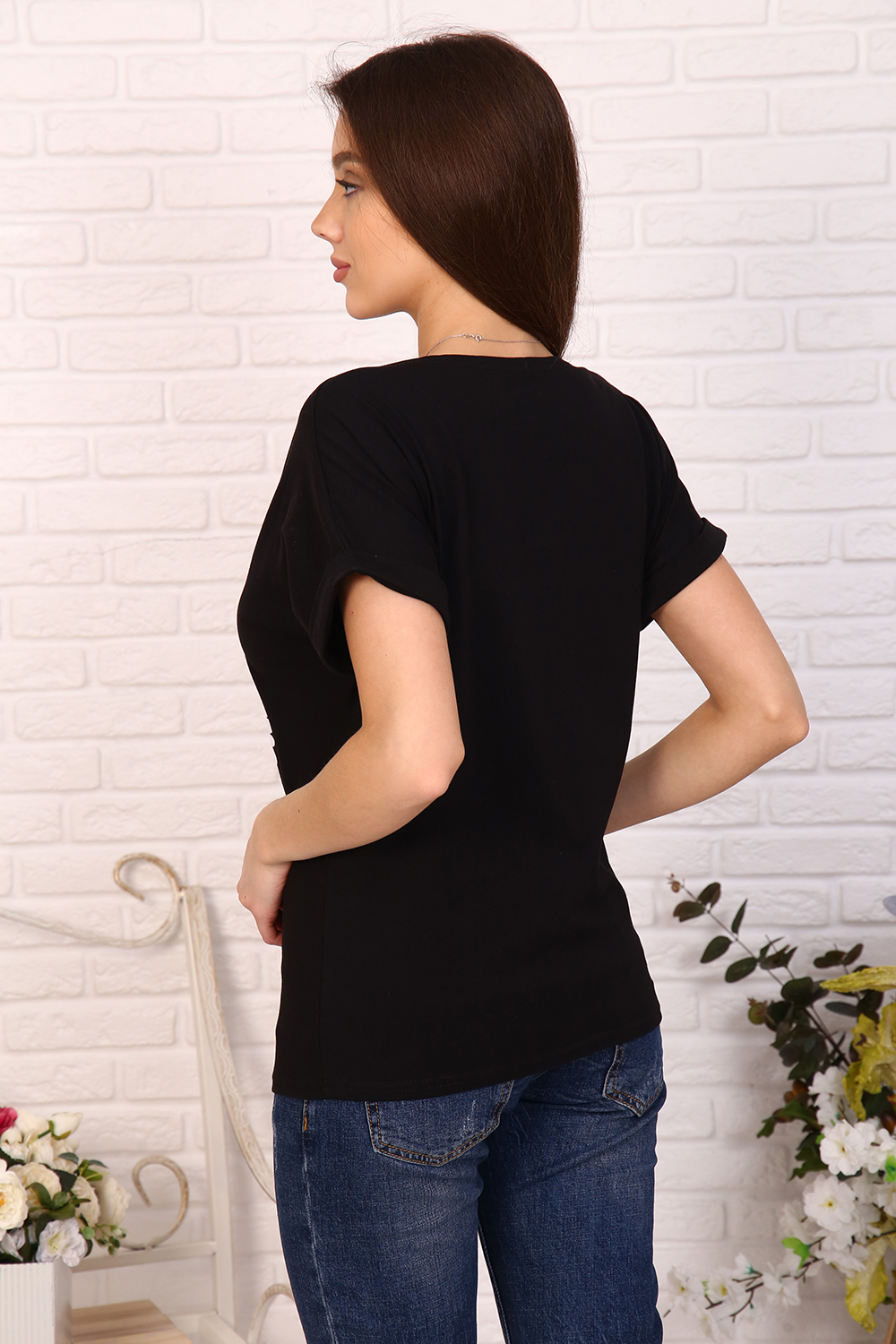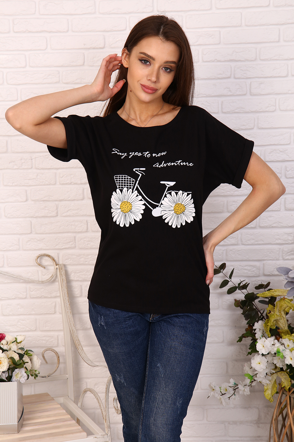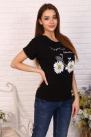 Футболка женская с принтом - ромашки в виде велосипеда, из кулирки с лайкрой качества ПЕНЬЕ. Модель свободного покроя, вырез горловины в виде "лодочки", спущенная пройма обработана манжетом с отворотом. Футболка приятная к телу, комфортная, подойдёт на любую фигуру.