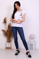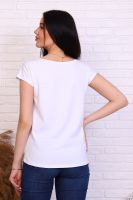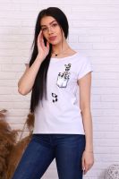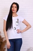 Футболка с молодёжным принтом из кулирки с лайкрой качества пенье. Модель слегка приталенного силуэта, горловина в виде лодочки, спущенная пройма, спинка слегка удлинена. Футболка - это базовая комфортная вещь женского гардероба, её надевают в спортзал, в офис и даже на вечеринку.
