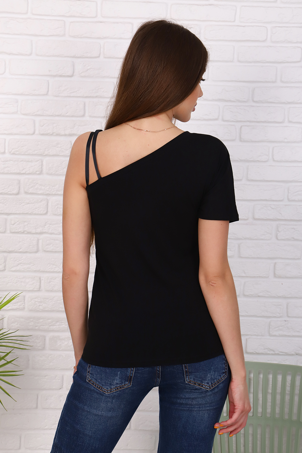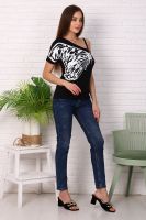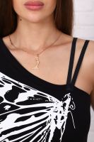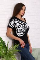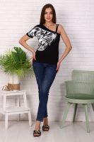 Футболка с принтом в виде бабочки, из кулирки с лайкрой высокого качества ПЕНЬЕ. Ассиметричная модель с коротким рукавом с одной стороны и узкими бретелями, имитирующие усики бабочки, с другой стороны, придают футболке романтичный и загадочный образ. Летняя, открытая футболка - это отличный вариант для летнего гардероба современной модницы.