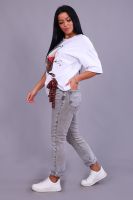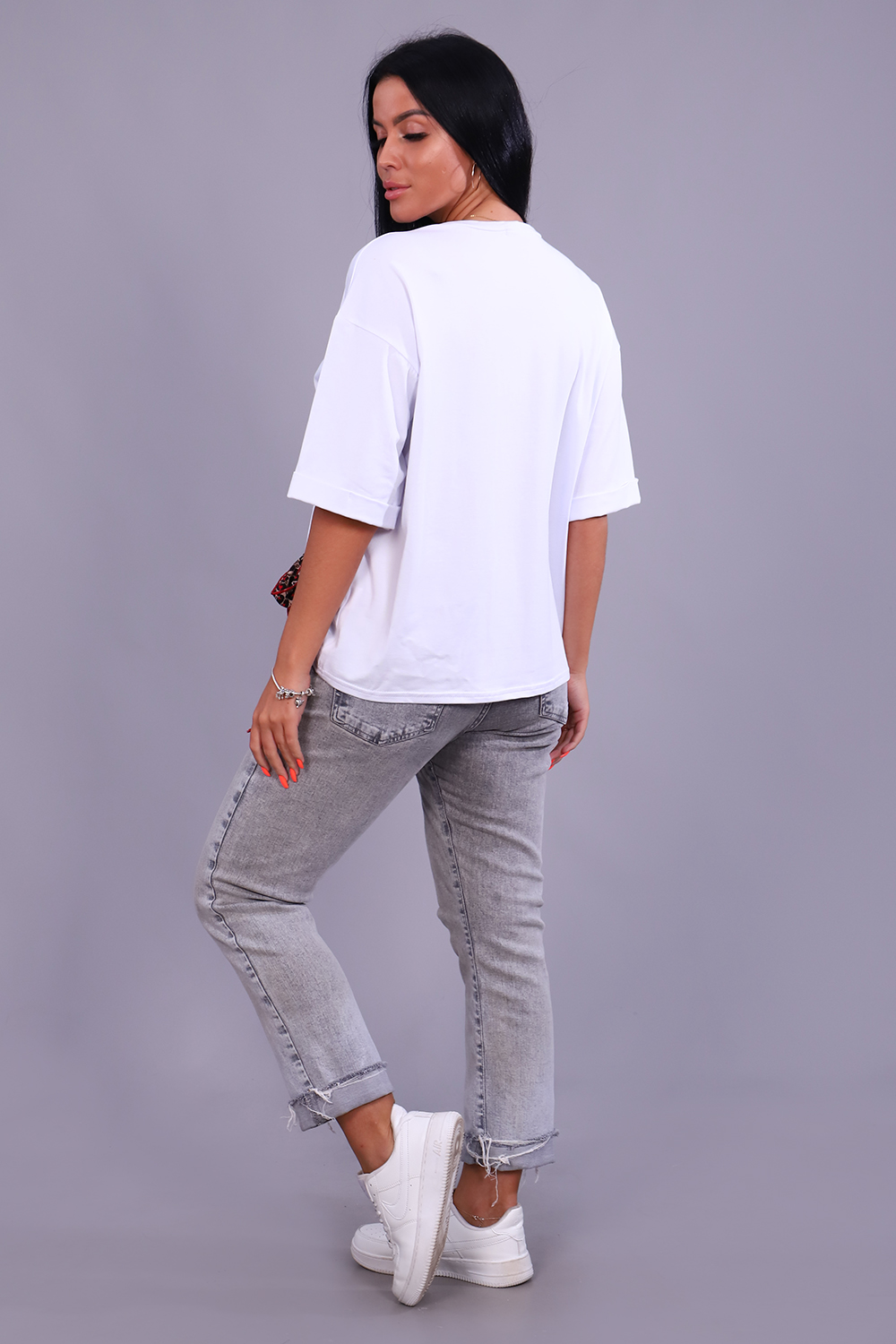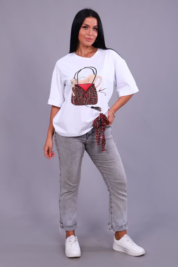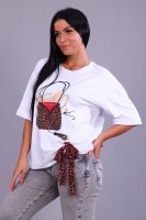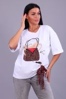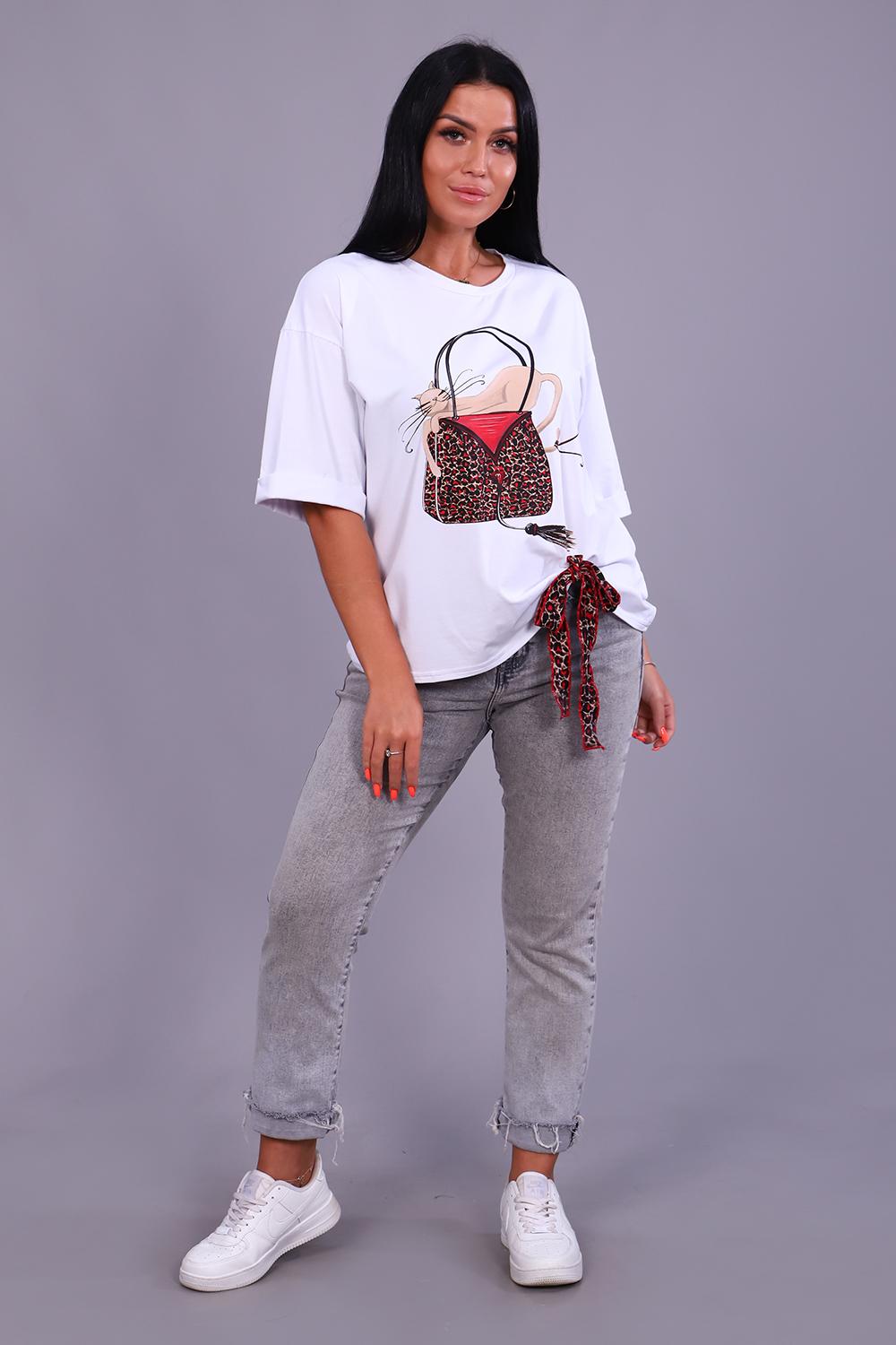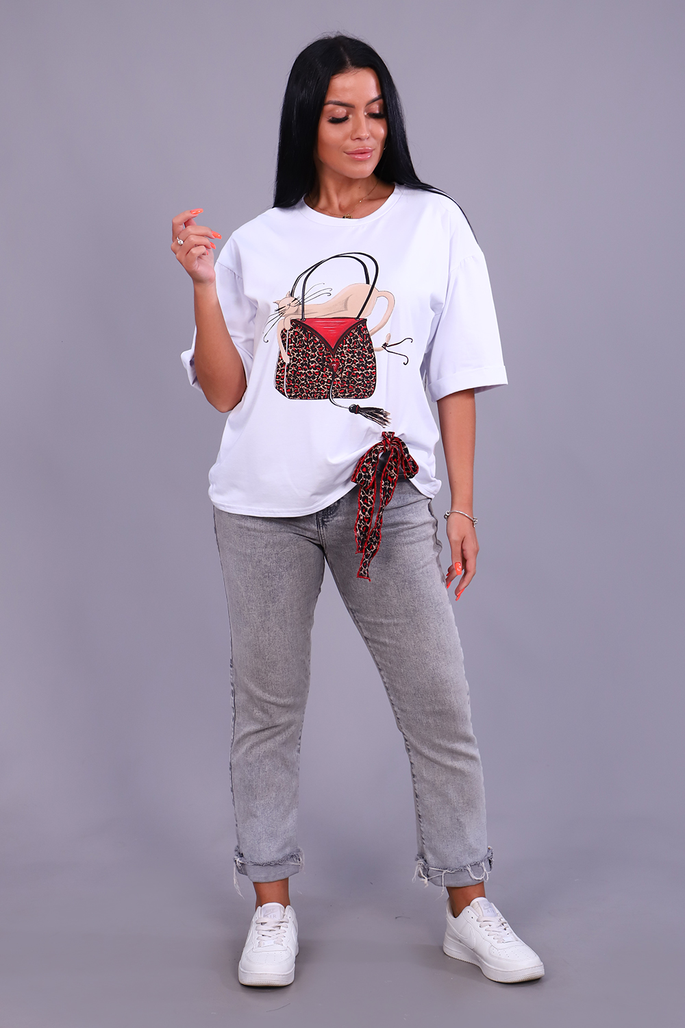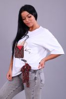 Стильная футболка с принтом из кулирки с лайкрой высокого качества пенье. Модель в стиле ОВЕРСАЙЗ, горловина округлая, короткий рукав, по низу передней полочки декоративный подхват в виде банта, гармонично сочетающийся с принтом, что придаёт изделию некую изюминку. Футболка - это универсальная необходимая вещь, присутствующая в гардеробе модницы независимо от фигуры и возраста
