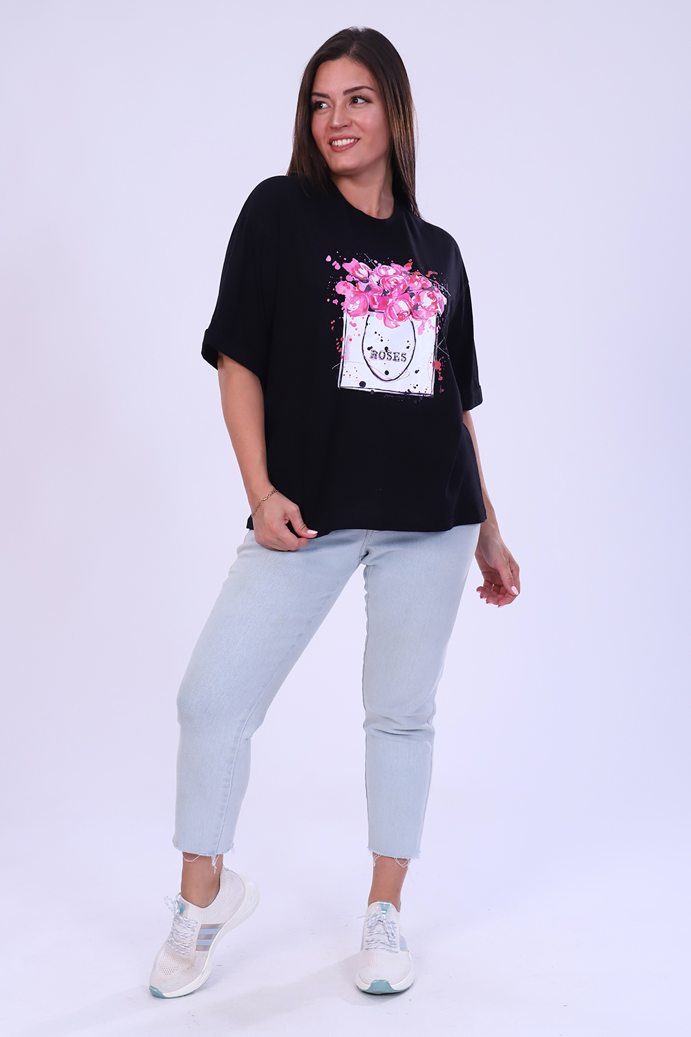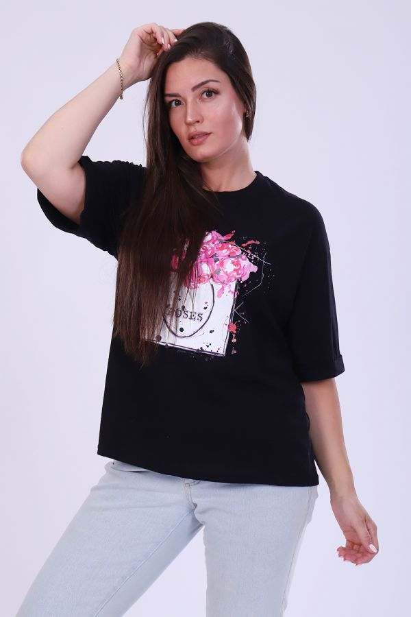 Футболка женская с ярким принтом в виде роз из мягкого, хлопкового трикотажа. Футболка свободного кроя, круглая горловина обработана эластичной рибаной. С втачным коротким рукавом на манжете. Самый универсальный элемент женского гардероба - это базовая футболка, сочетается с джинсами или юбкой, пиджаком, кардиганом.