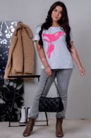 Футболка с ярким принтом обязательно привлечет внимание. Вырез горловины "лодочкой", спущенная линия плеча, обработка срезов в подгибку.