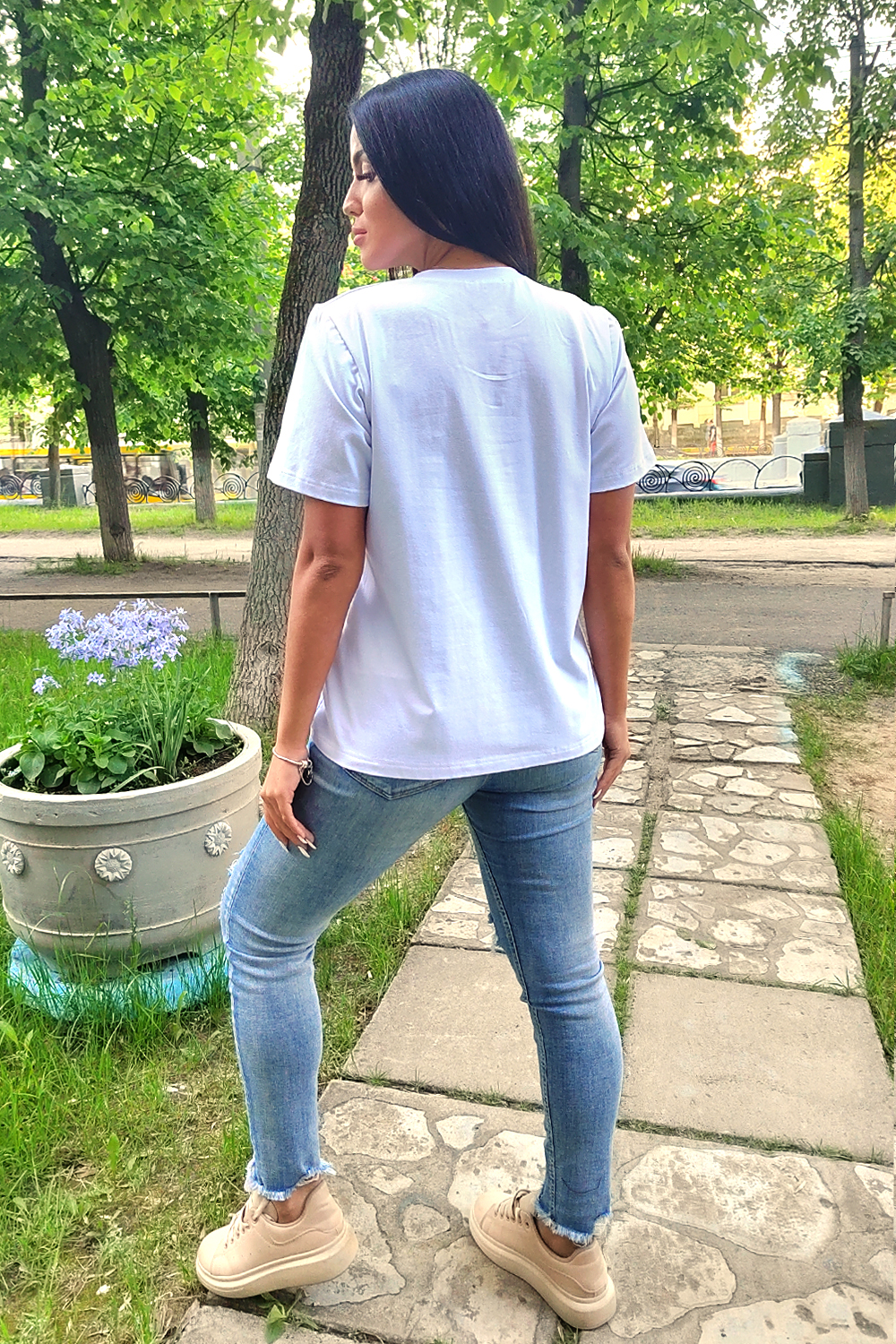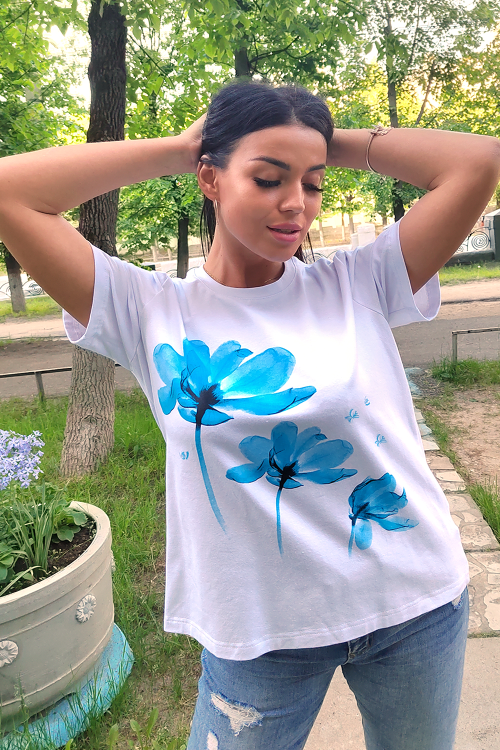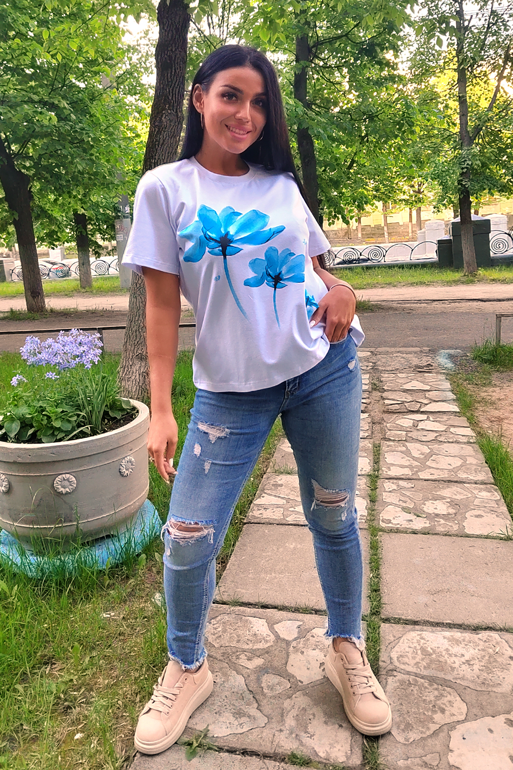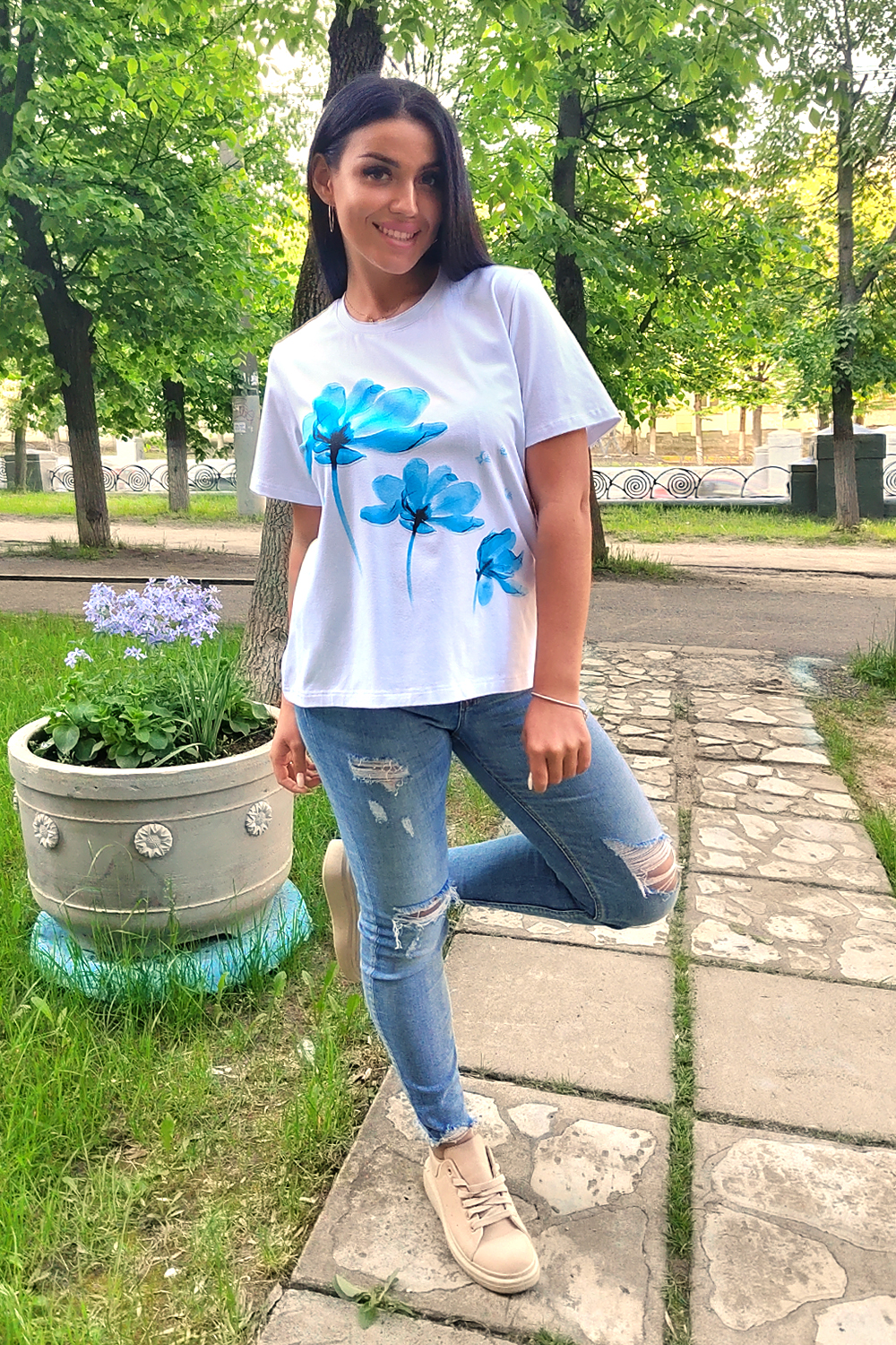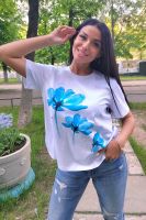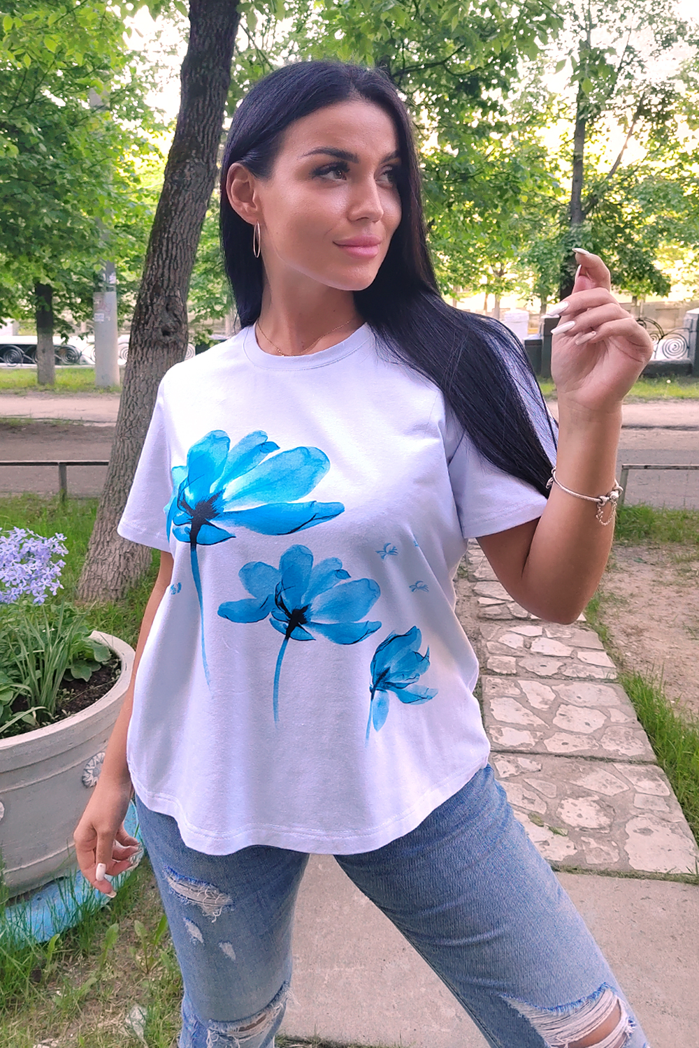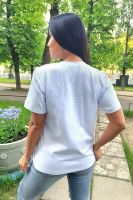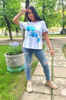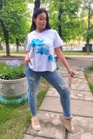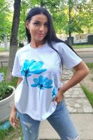 Футболка женская классическая из кулирки с лайкрой с округлой горловиной. Яркий принт на полочке, низ подгибка. Отличный подарок девушкам и женщинам.