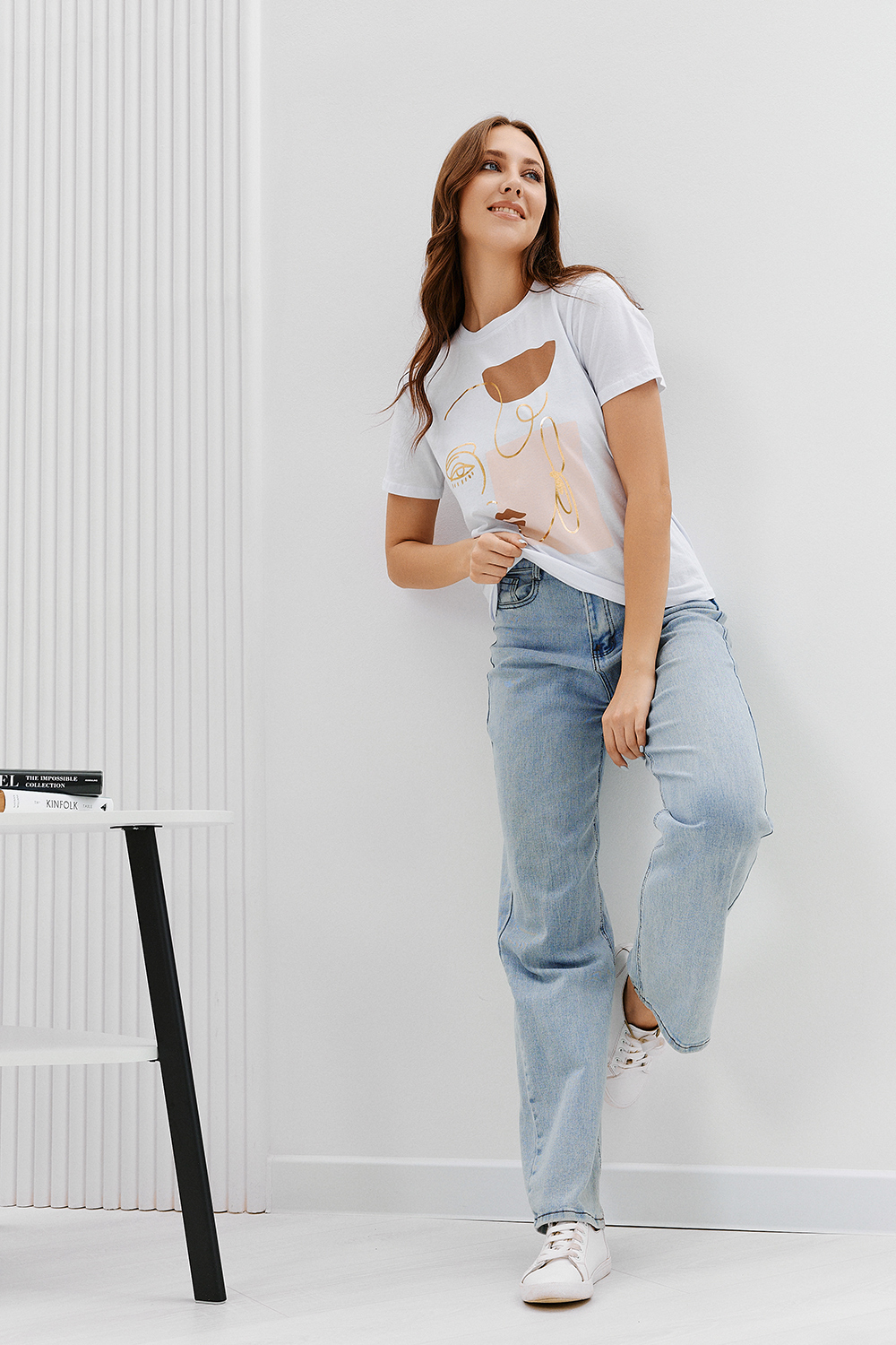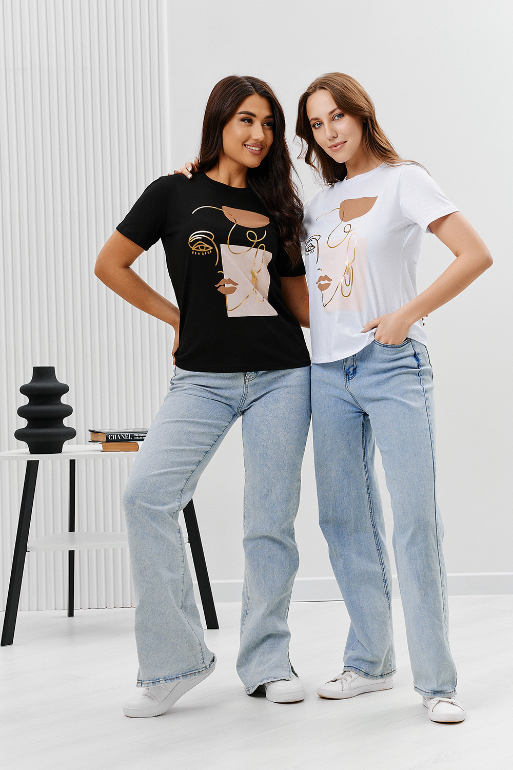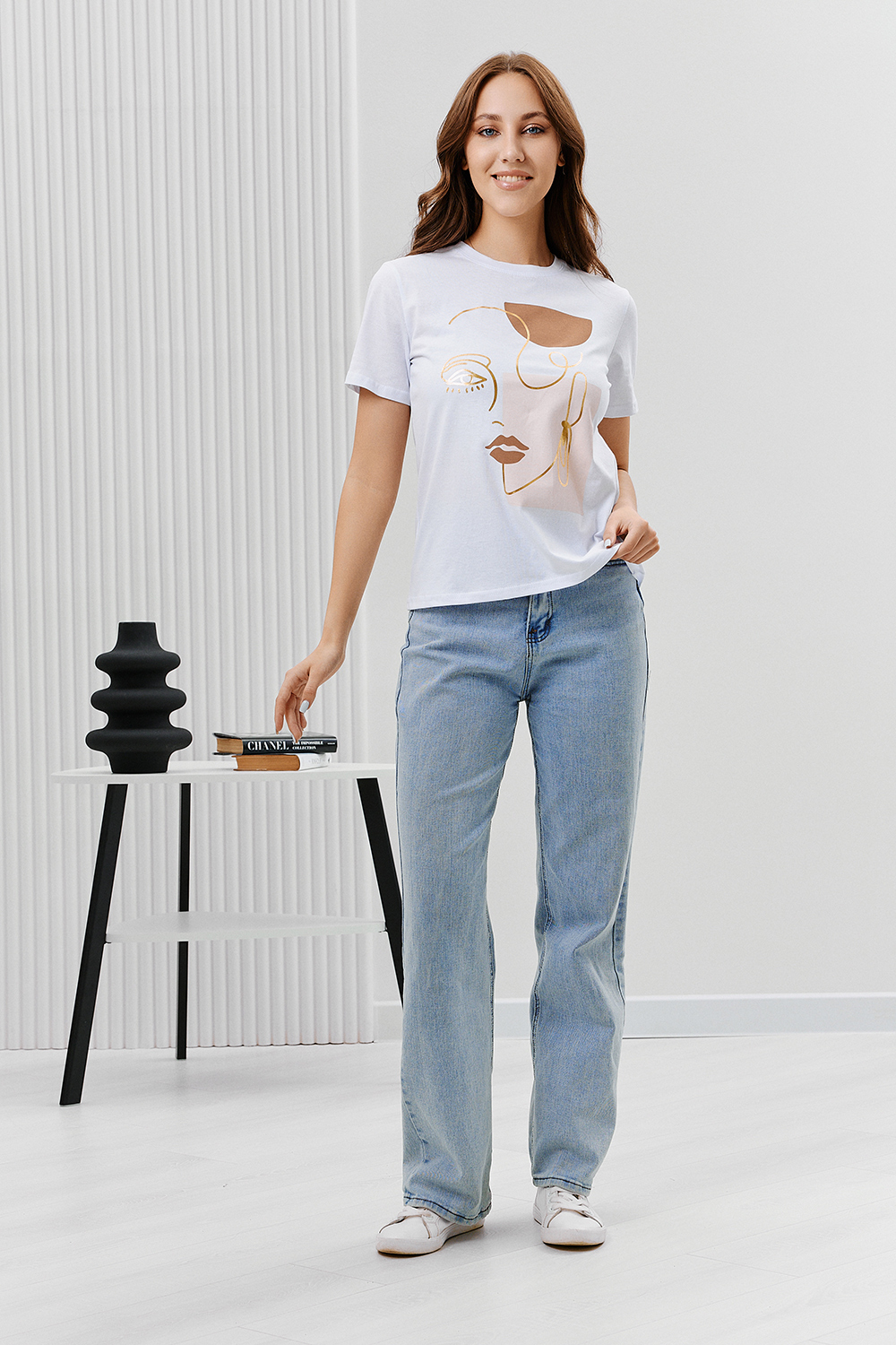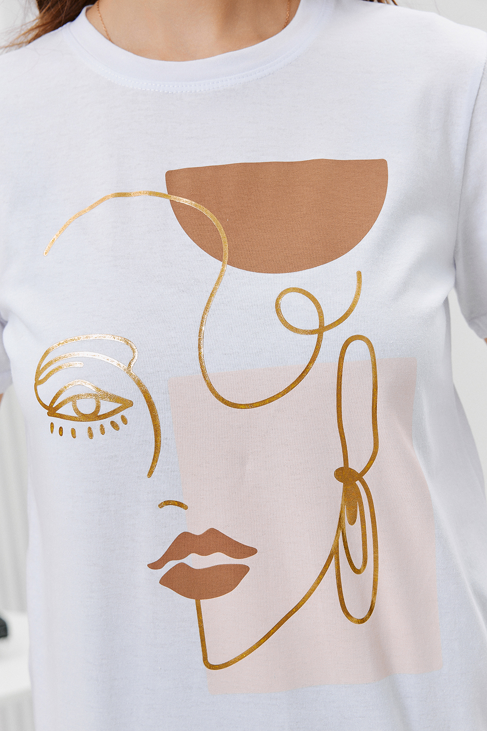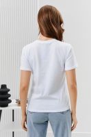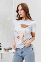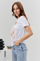 Футболка женская - это классика женского гардероба любой девушки. Это базовая модель с ярким принтом отлично смотрится с джинсами, юбками, брюками. Прямой силуэт, втачной рукав, горловина округлой формы обработана обтачкой из основного полотна.
