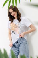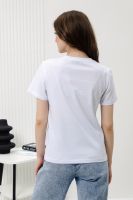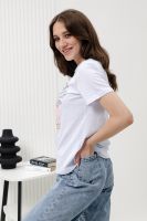 Футболка женская - это классика женского гардероба любой девушки. Это базовая модель с ярким принтом отлично смотрится с джинсами, юбками, брюками. Прямой силуэт, втачной рукав, горловина округлой формы обработана обтачкой из основного полотна.
