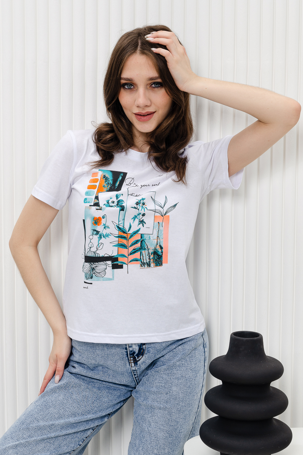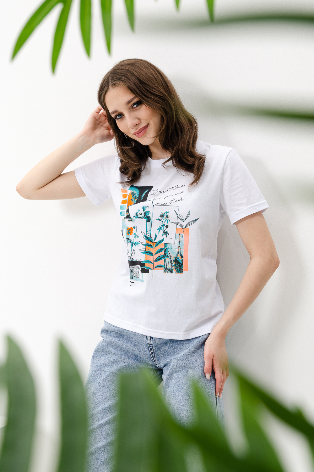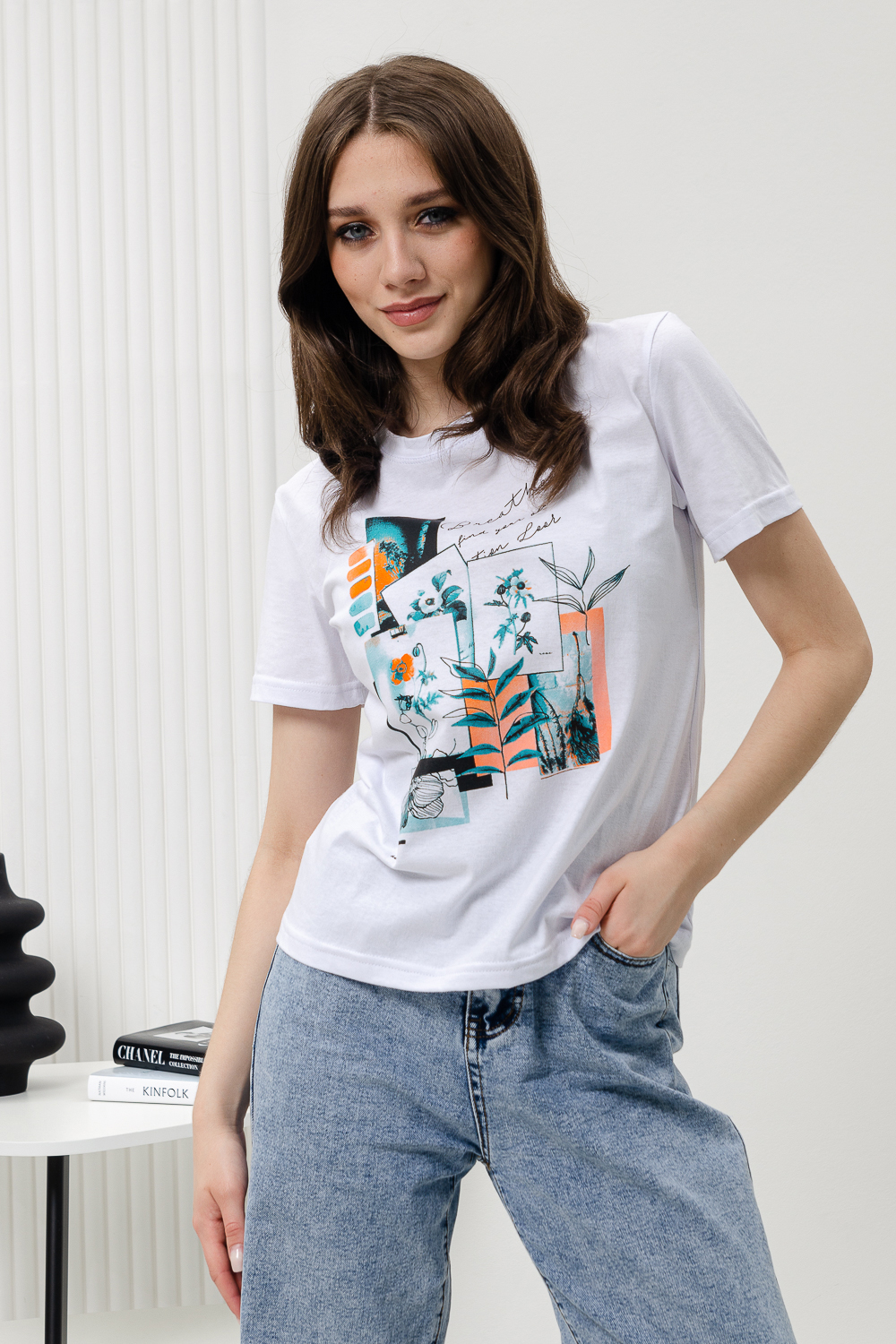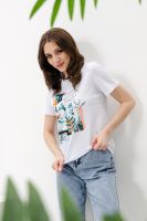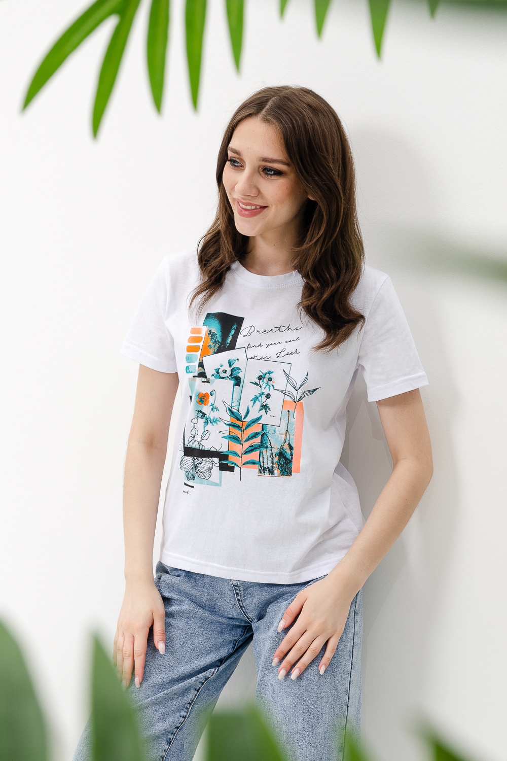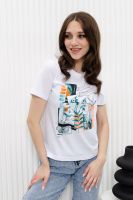Футболка женская - это классика женского гардероба любой девушки. Это базовая модель с ярким принтом отлично смотрится с джинсами, юбками, брюками. Прямой силуэт, втачной рукав, горловина округлой формы обработана обтачкой из основного полотна.
