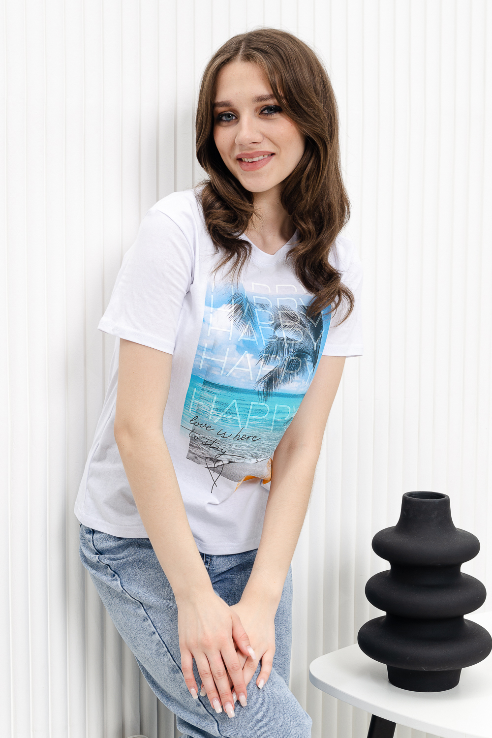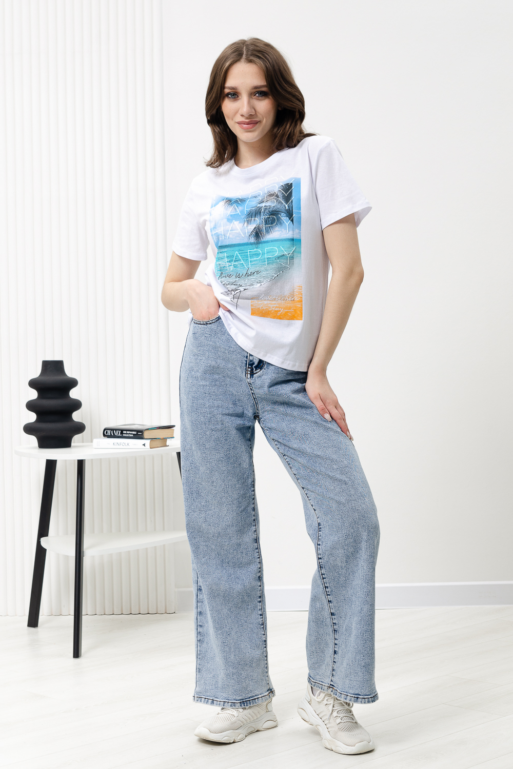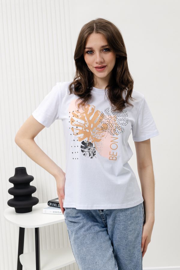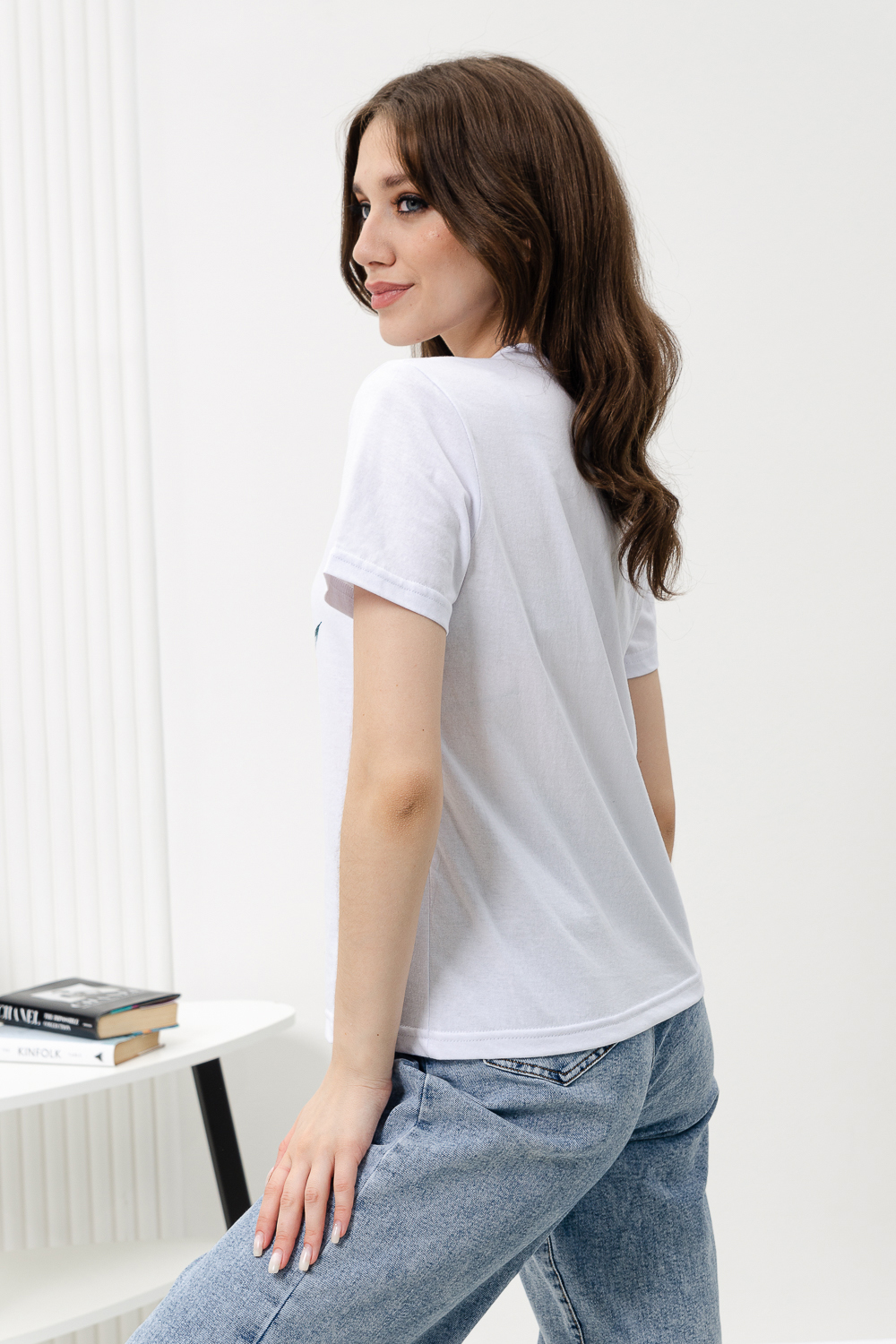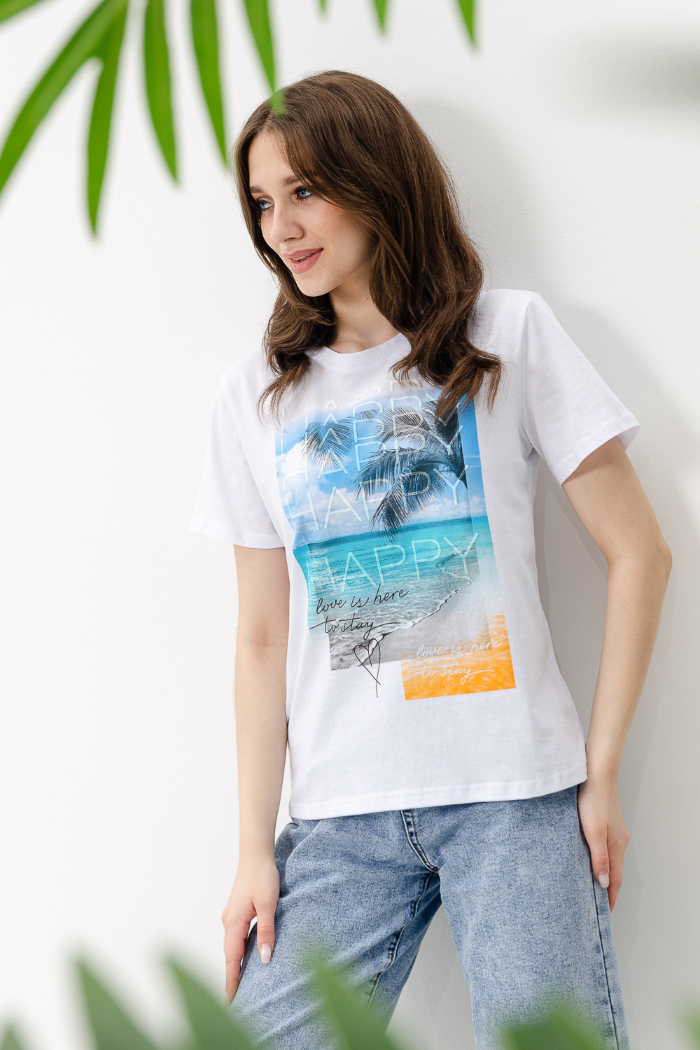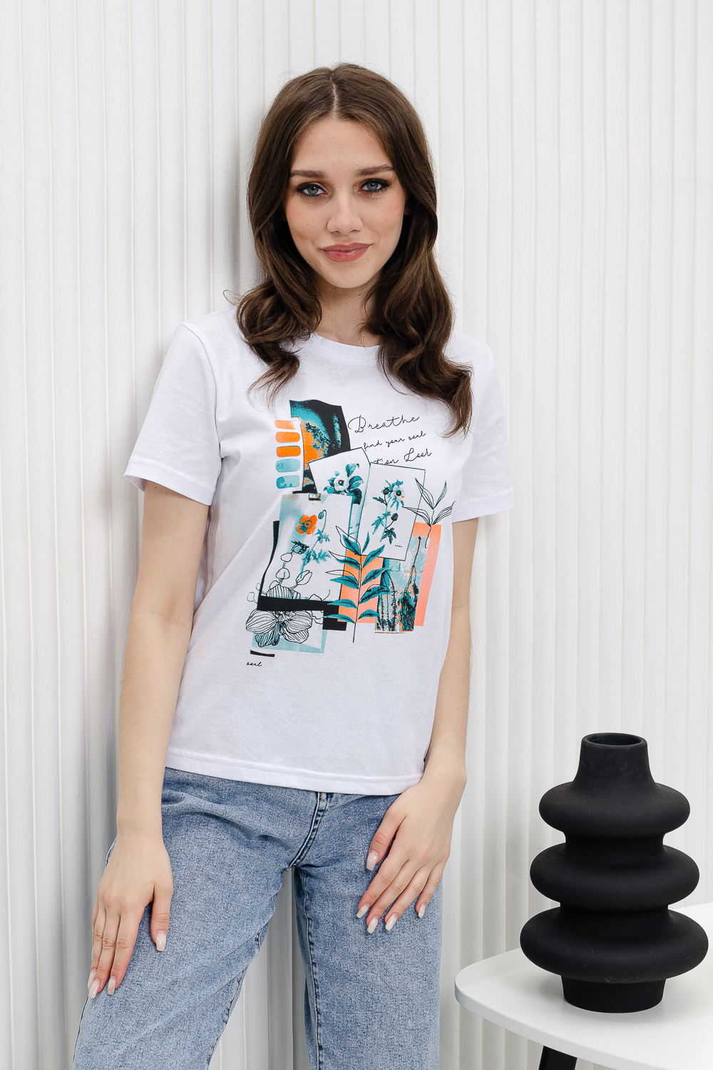 Футболка женская - это классика женского гардероба любой девушки. Это базовая модель с ярким принтом отлично смотрится с джинсами, юбками, брюками. Прямой силуэт, втачной рукав, горловина округлой формы обработана обтачкой из основного полотна.